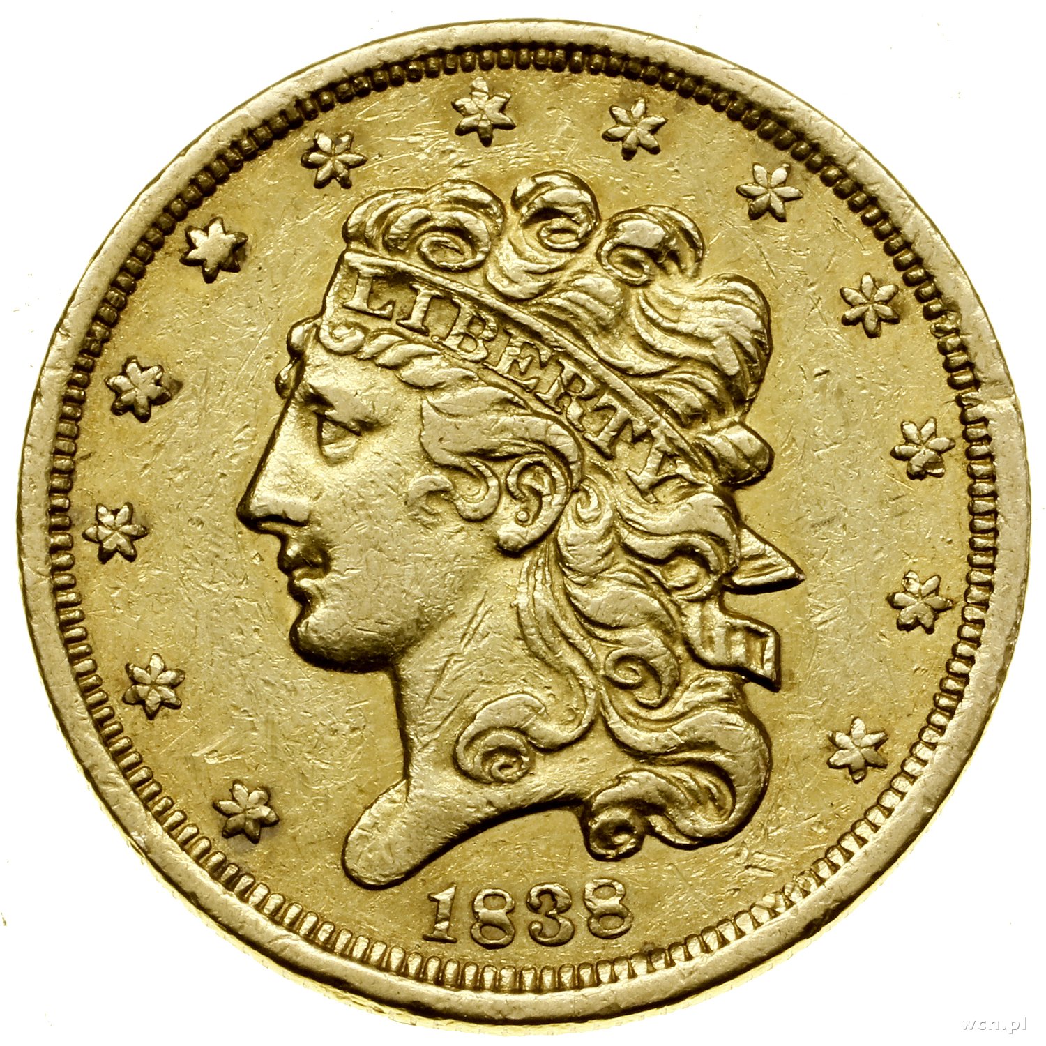 | 508 | STANY ZJEDNOCZONE AMERYKI (USA) 5 dolarów, 1838, Filadelfia; typ Liberty Head with ribbon; Fr. 136, KM 57; złoto, 8.31 g; nakład 286.588 sztuk, rzadki typ monety. |