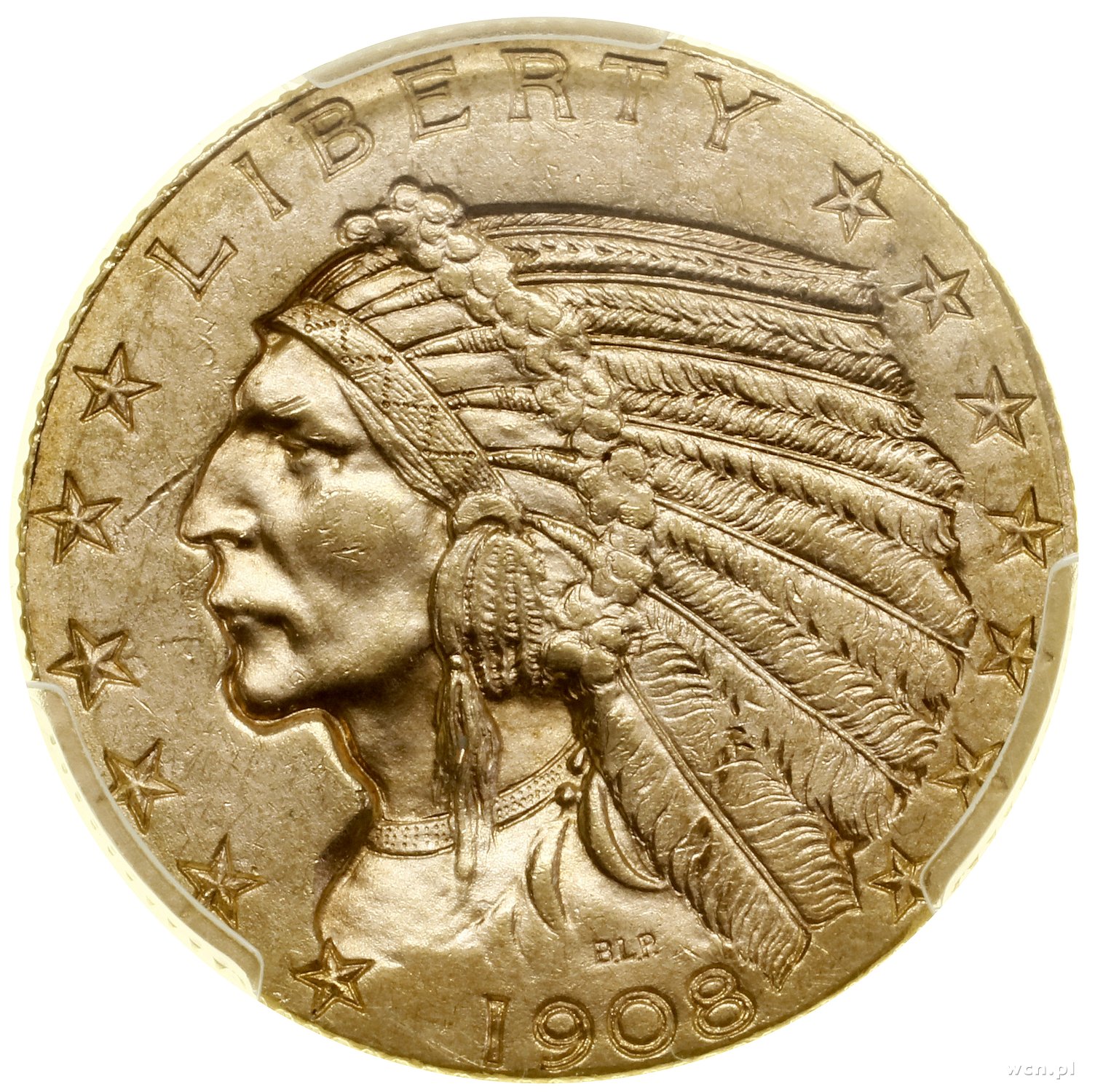 | 509 | STANY ZJEDNOCZONE AMERYKI (USA) 5 dolarów, 1908 D, Denver; typ Indian Head; Fr. 151, KM 129; złoto; nakład 148.000 sztuk, pięknie zachowana moneta w pudełku PCGS 8511.63/56953984 z oceną MS63. |