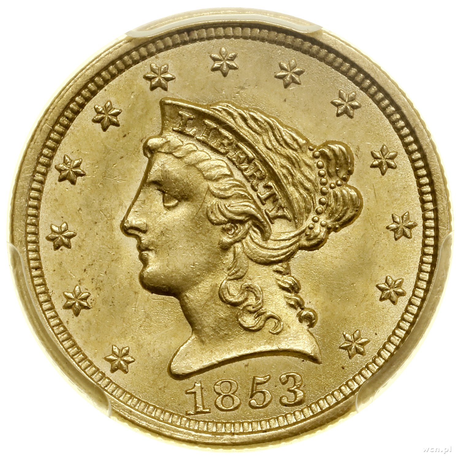 | 510 | STANY ZJEDNOCZONE AMERYKI (USA) 2 1/2 dolara, 1853, Filadelfia; typ Liberty Head; Fr. 114, KM 72; złoto; nakład 1.404.668 sztuk, pięknie zachowana moneta w pudełku PCGS 7767.64/38474847 z oceną MS64. |