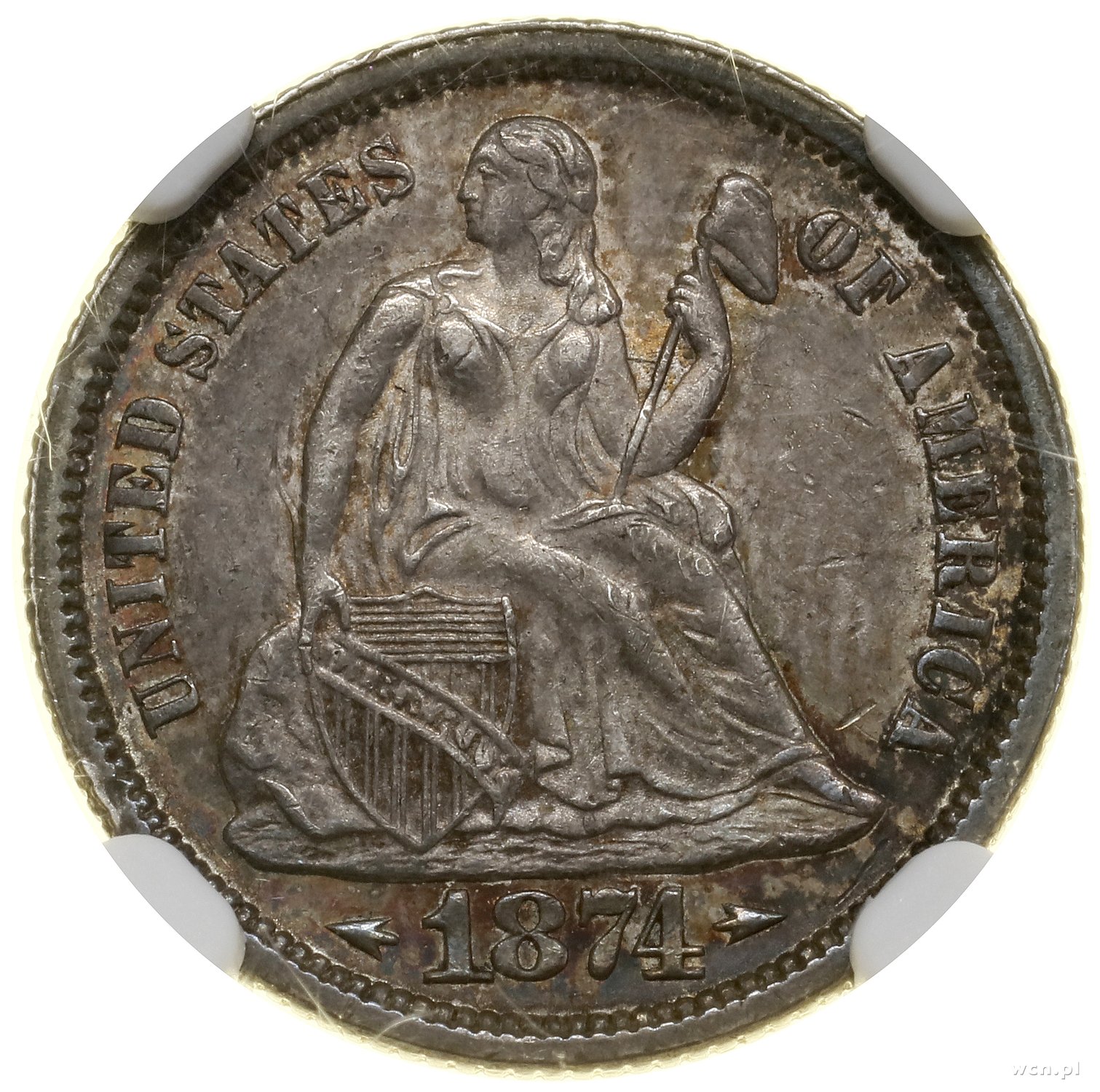 | 518 | STANY ZJEDNOCZONE AMERYKI (USA) 10 centów (dime), 1874, Filadelfia; typ Seated Liberty / with arrows; KM 105; kolorowa patyna, pięknie zachowana moneta w pudełku NGC 5778386-014 z oceną MS62. |
