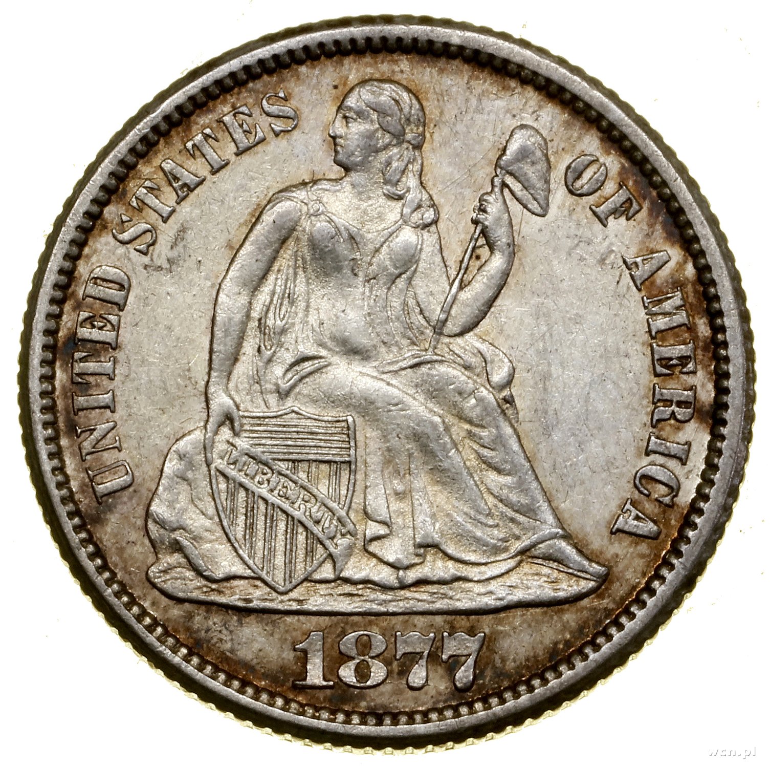 | 519 | STANY ZJEDNOCZONE AMERYKI (USA) 10 centów (dime) 1877 CC, Carson City; typ Seated Liberty; KM A92; przetarty awers, ale duży blask menniczy, pięknie zachowana moneta. |