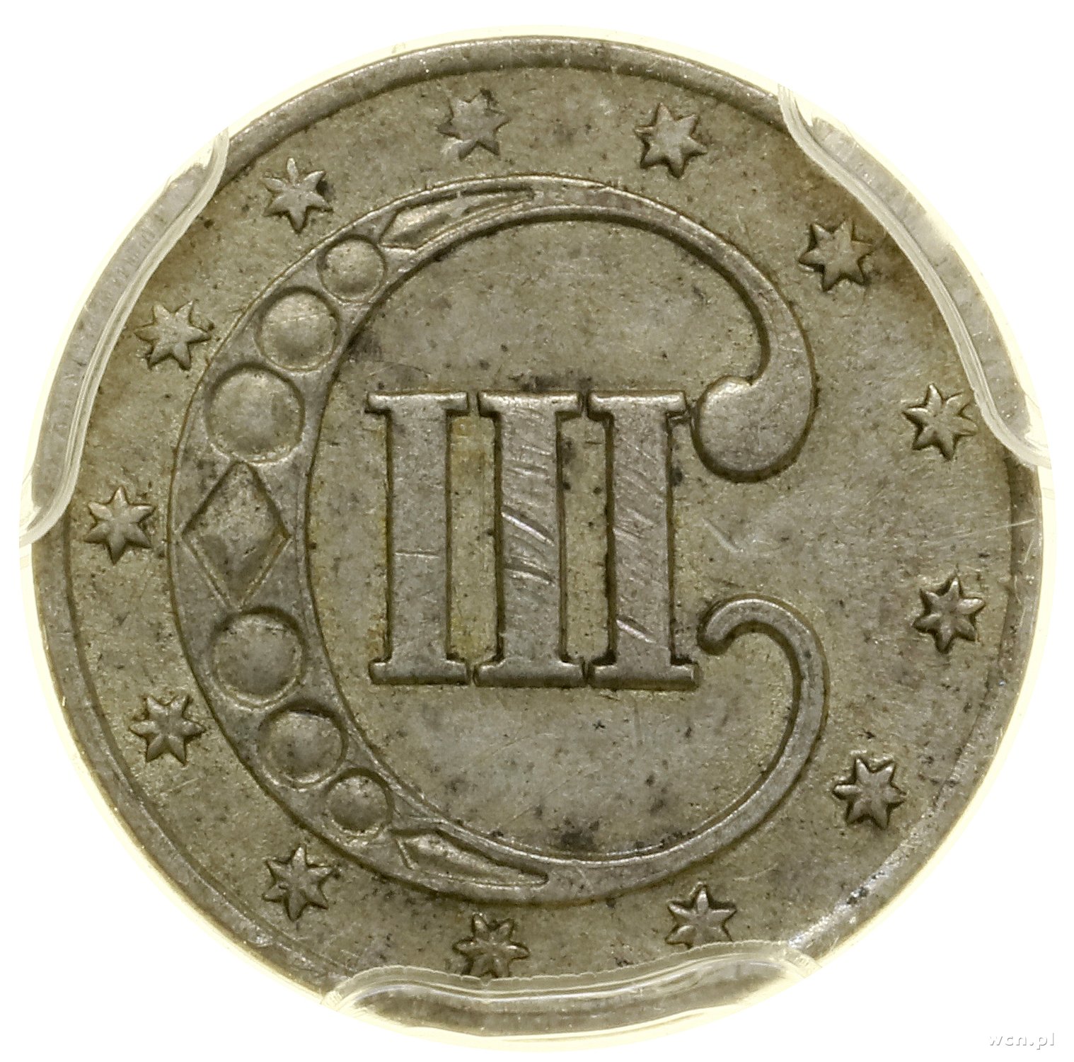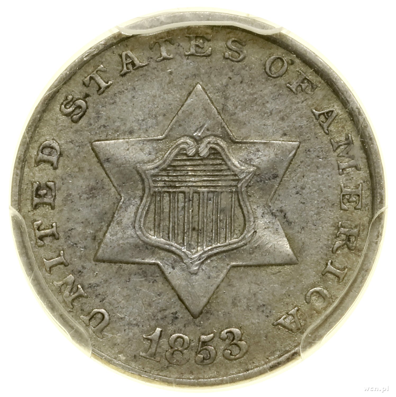 | 520 | STANY ZJEDNOCZONE AMERYKI (USA) 3 centy, 1853, Filadelfia; KM 75; ładnie zachowana moneta w pudełku PCGS 3667.55/34441714 z oceną AU55. |