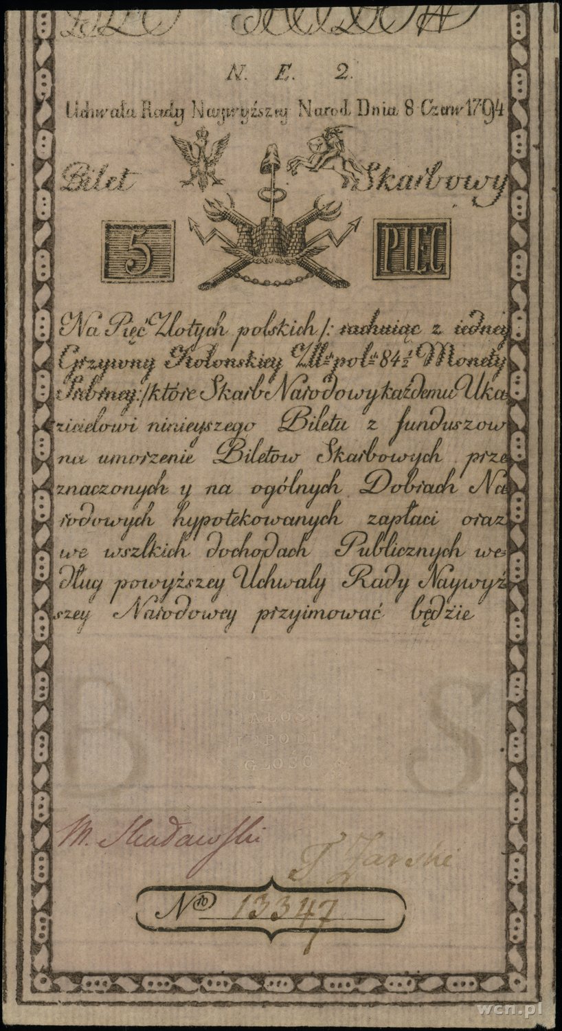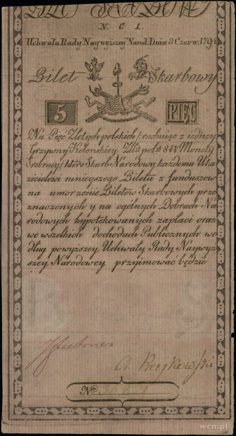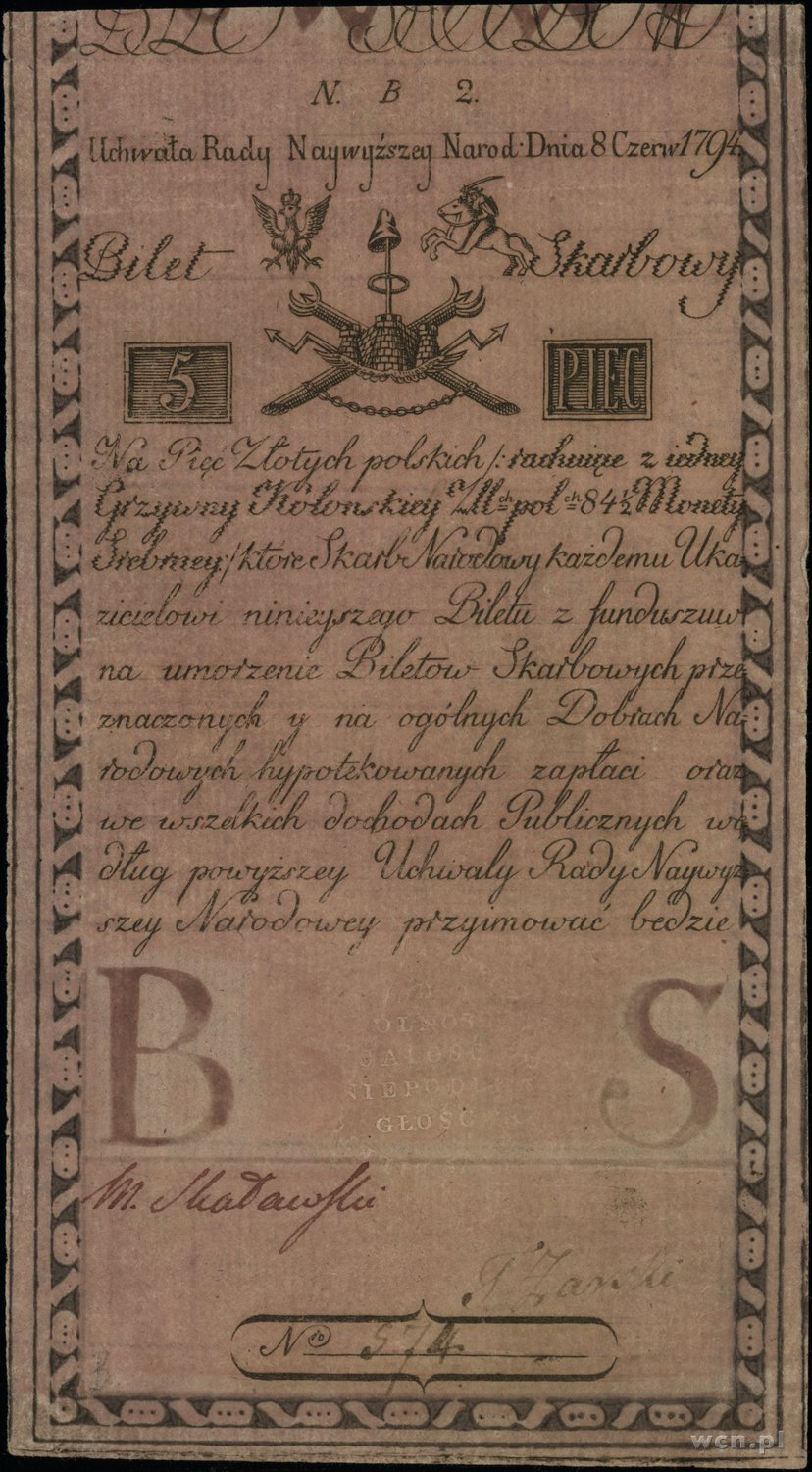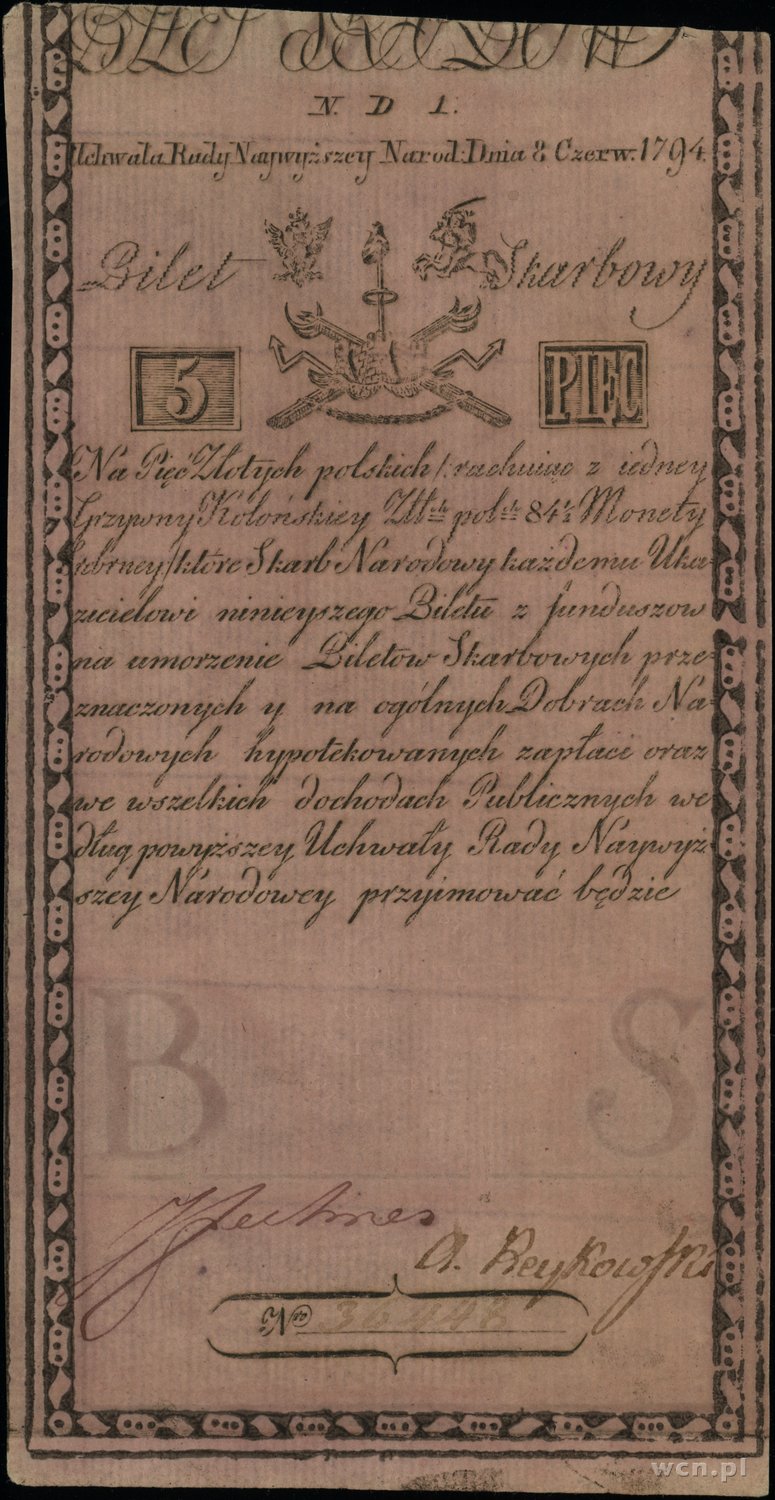 | 4 | Insurekcja Kościuszkowska - bilety z 1794 r.. 5 złotych polskich, 8.06.1794; seria N.B.2, numeracja 574; Lucow 11 (R4) - ilustrowany w katalogu kolekcji, Miłczak A1c,.. | 0 zł | ||