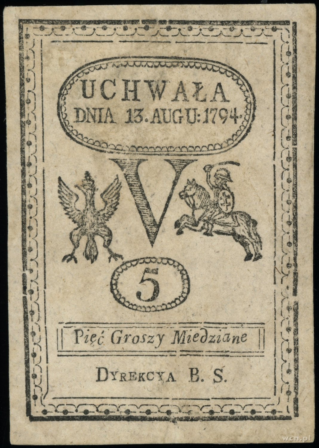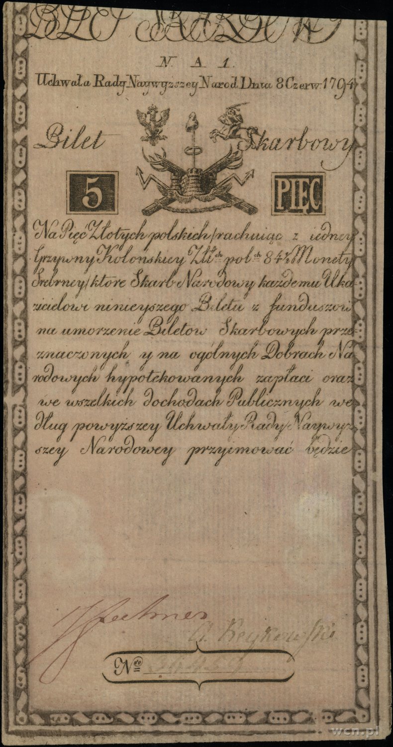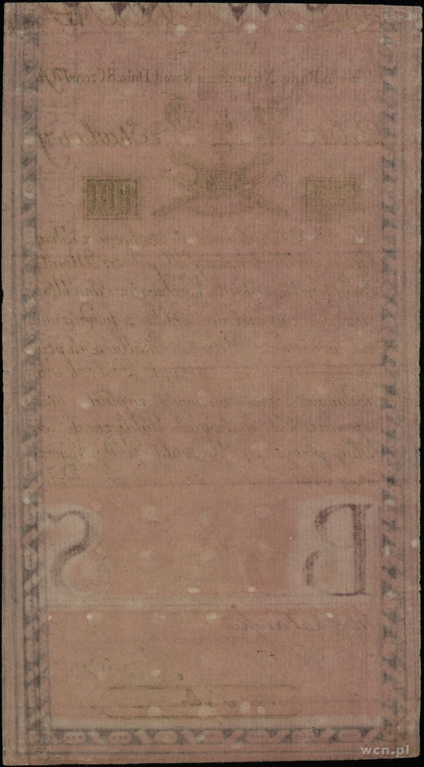 | 4 | Insurekcja Kościuszkowska - bilety z 1794 r.. 5 złotych polskich, 8.06.1794; seria N.B.2, numeracja 574; Lucow 11 (R4) - ilustrowany w katalogu kolekcji, Miłczak A1c,.. | 0 zł | ||