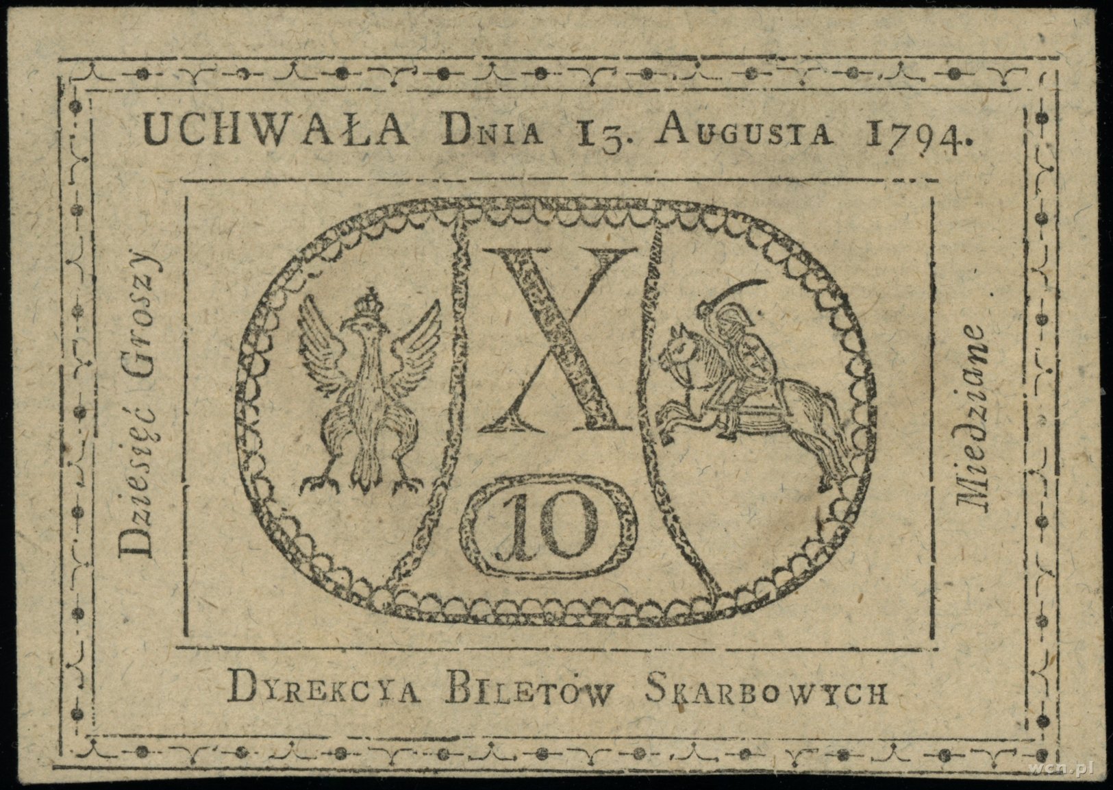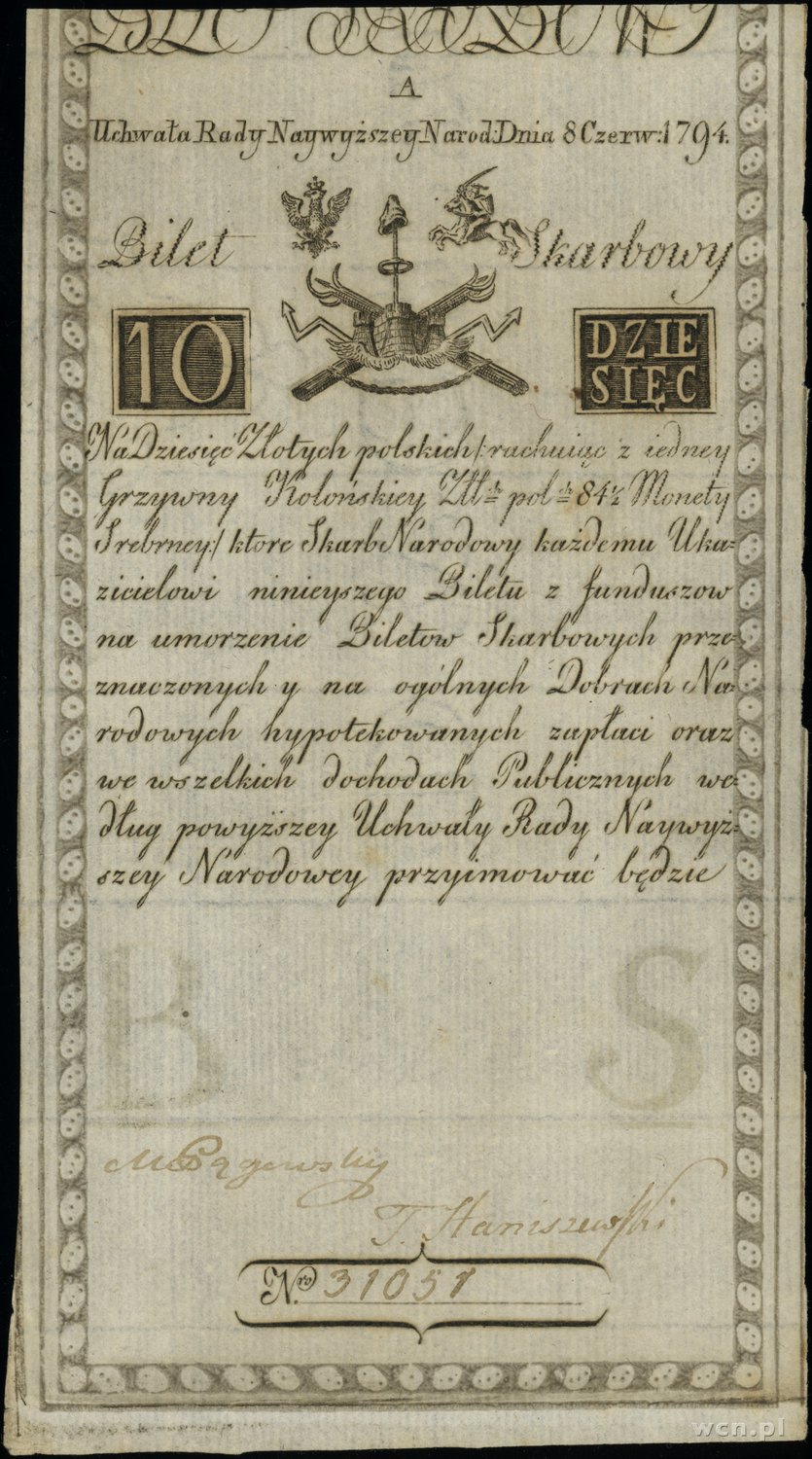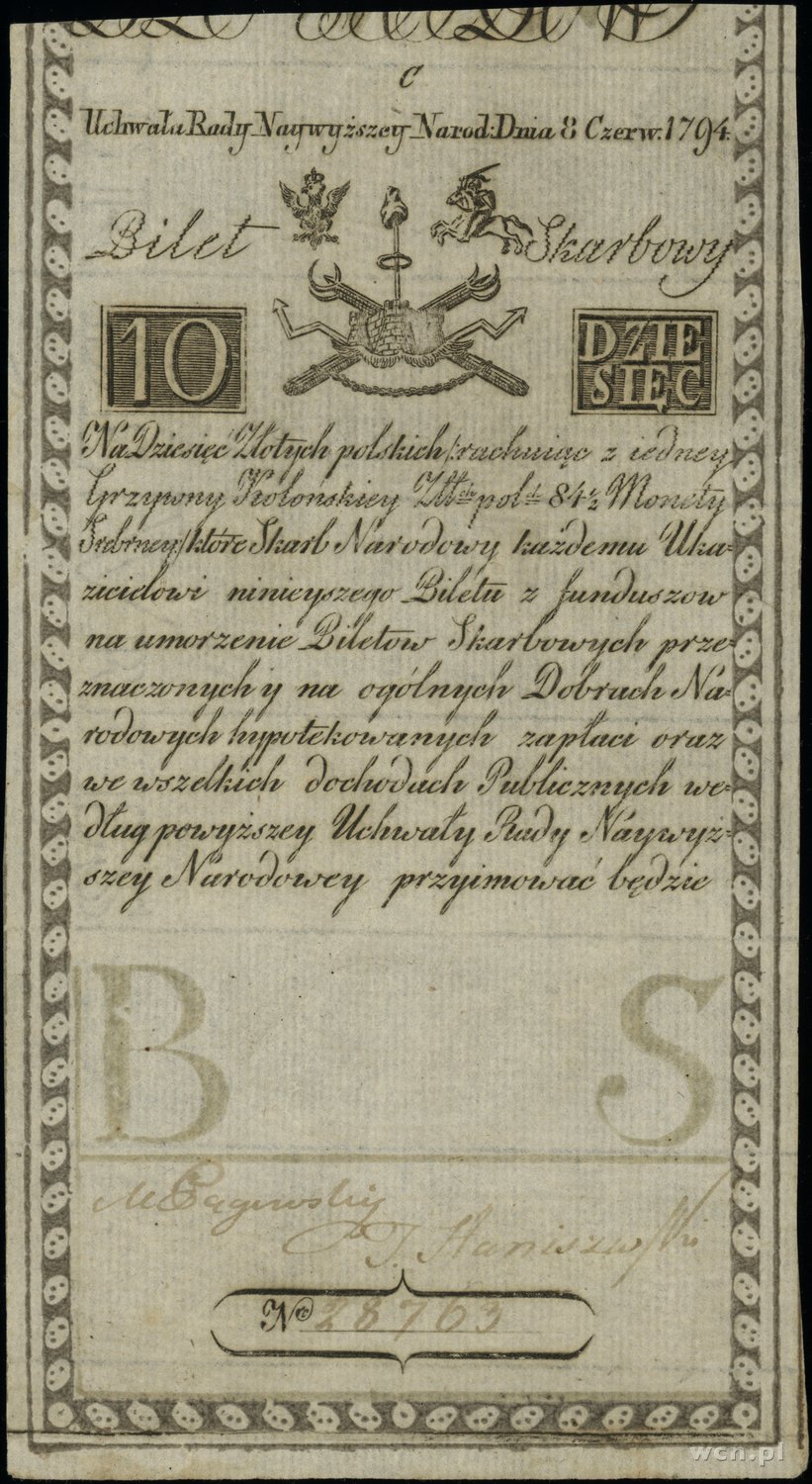 | 8 | Insurekcja Kościuszkowska - bilety z 1794 r.. 10 złotych polskich, 8.06.1794; seria E, numeracja 44531; z kolekcji Dąbrowskiego; Lucow 22b (R4), Miłczak A2, Pick A2; .. | 0 zł | ||