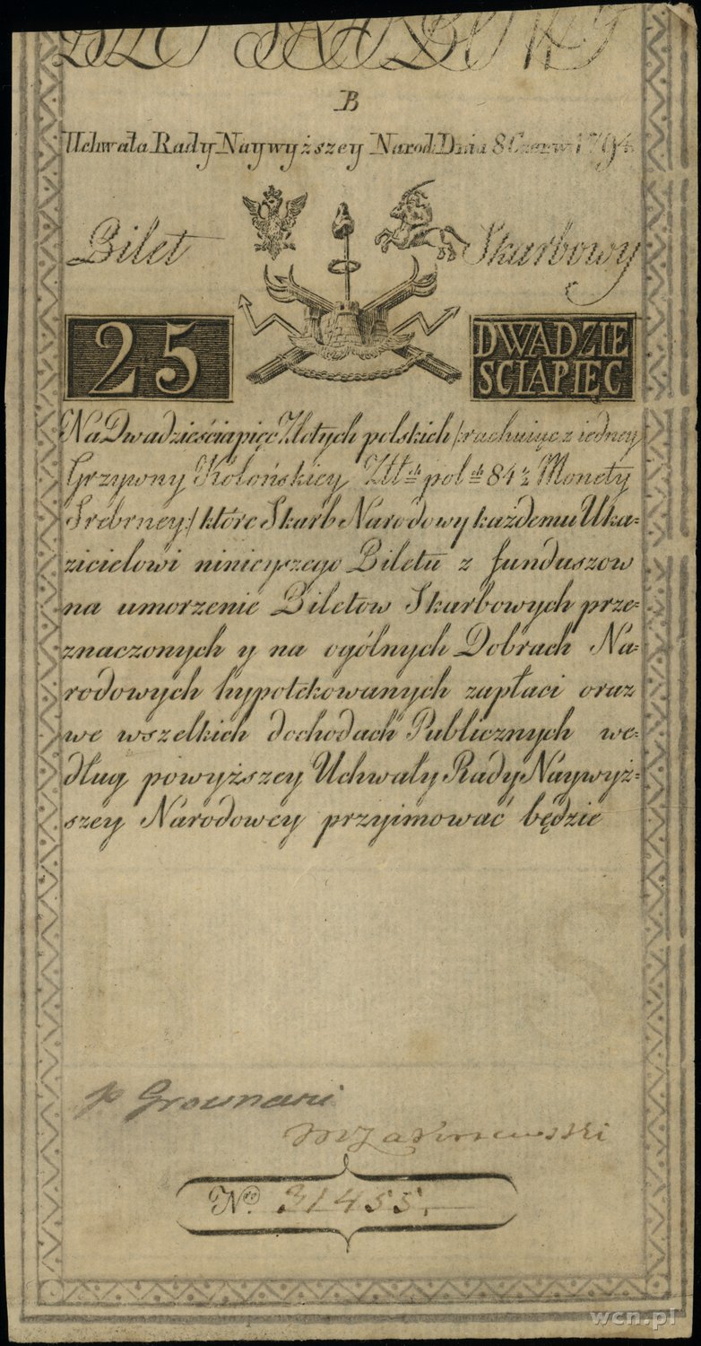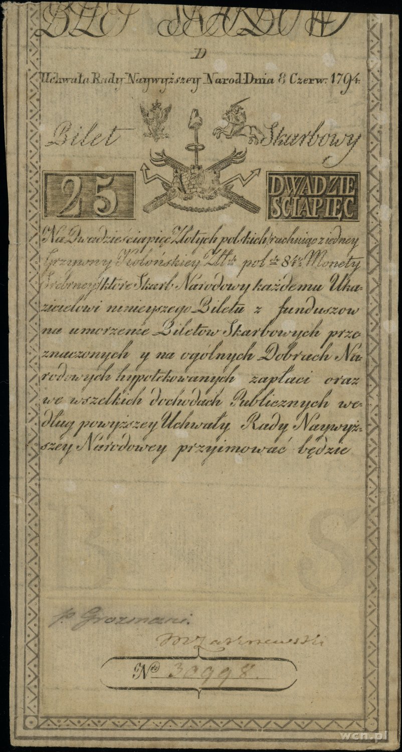 | 11 | Insurekcja Kościuszkowska - bilety z 1794 r.. 25 złotych polskich, 8.06.1794; seria D, numeracja 30998; Lucow 27b (R2) - ilustrowany w katalogu kolekcji, Miłczak A3, .. | 0 zł | ||
