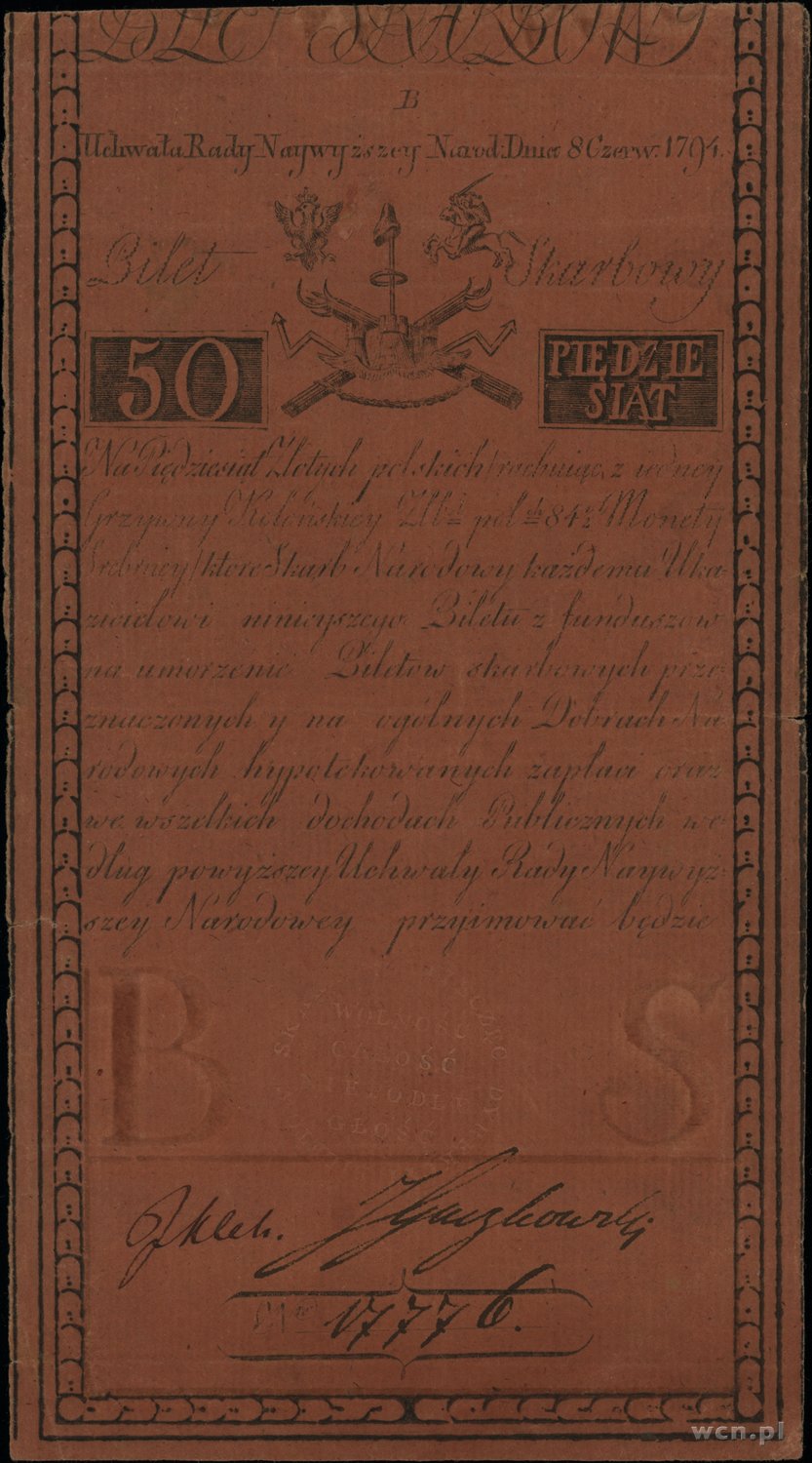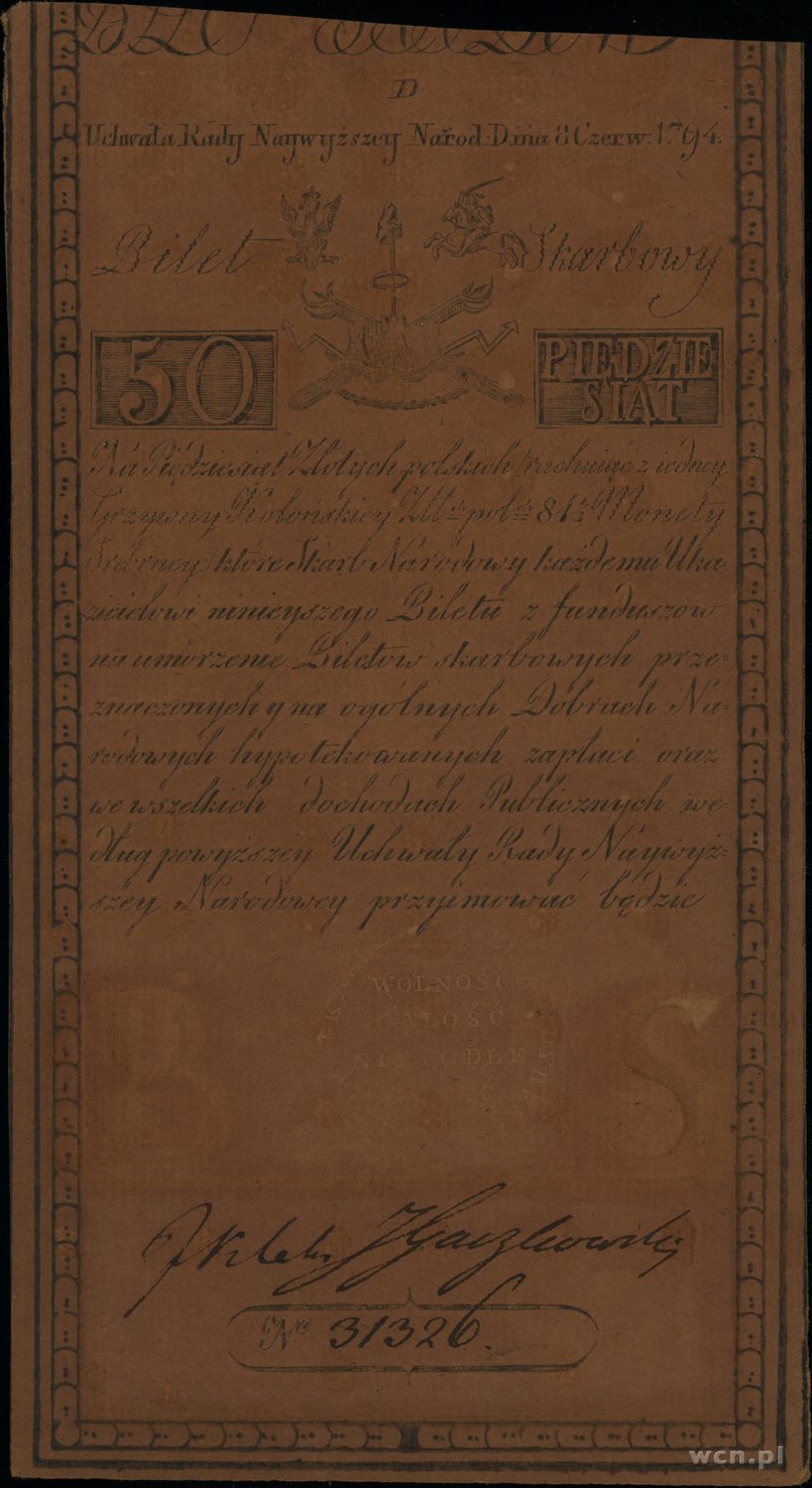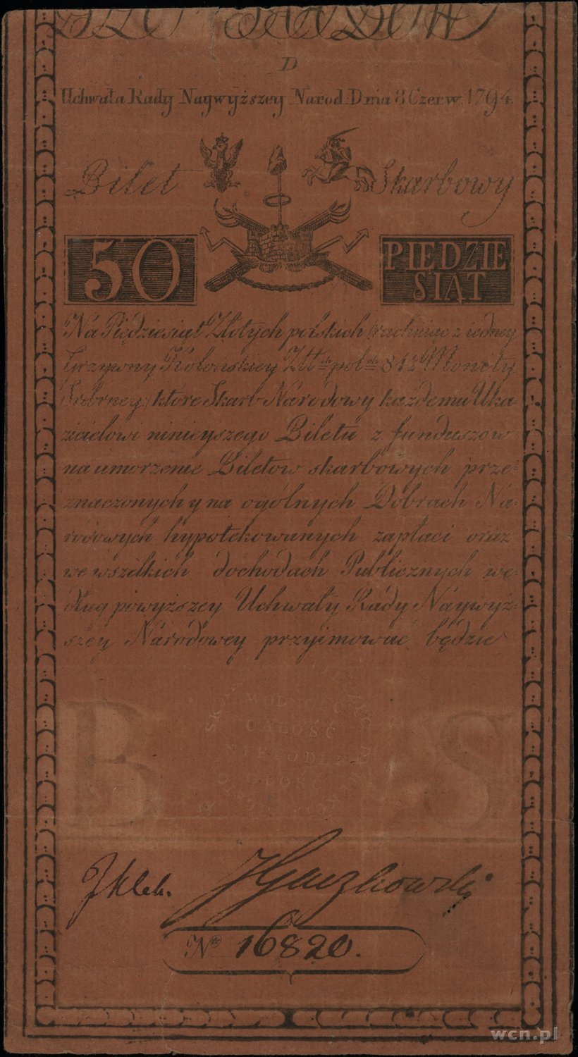 | 15 | Insurekcja Kościuszkowska - bilety z 1794 r.. 50 złotych polskich, 8.06.1794; seria D, numeracja 31326; Lucow 32h (R3), Miłczak A4, Pick A4; w opakowaniu firmy PMG 24.. | 0 zł | ||