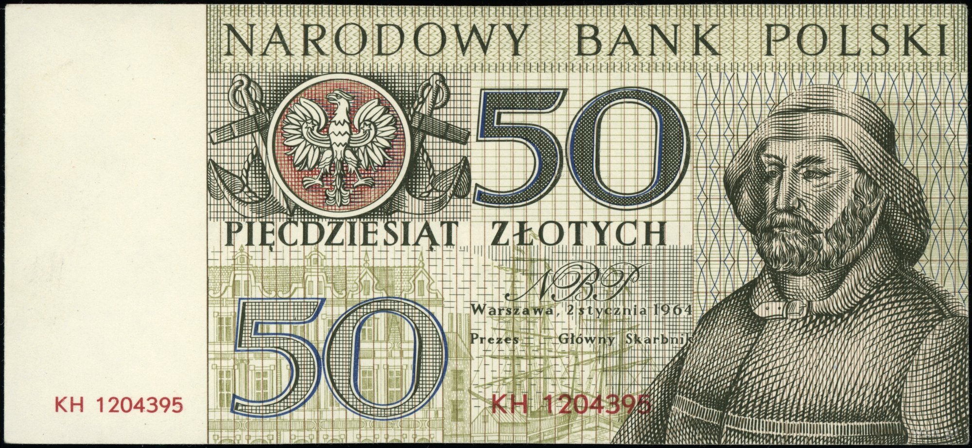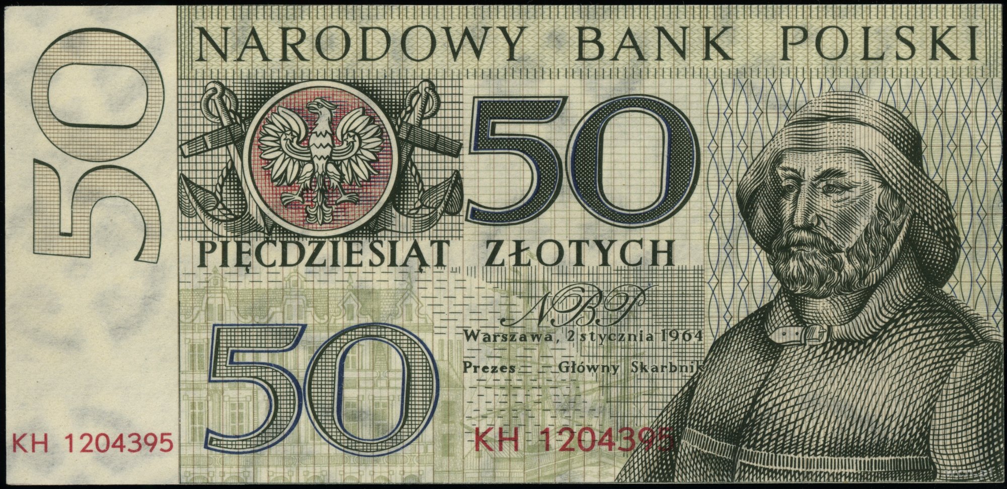 | 348 | NBP, Miasta Polskie. 50 złotych, 2.01.1964; seria KH, numeracja 1204395; próba kolorystyczna; Lucow 1626c (R7) - ilustrowany w katalogu kolekcji; w opakowaniu firmy P.. | 0 zł | ||