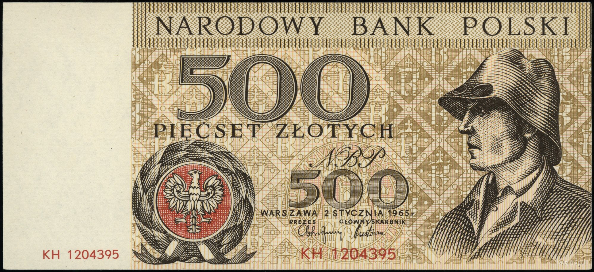 | 351 | NBP, Miasta Polskie. 500 złotych, 2.01.1965; seria KH, numeracja 1204395; próba kolorystyczna; Lucow 1638 (R7) - ilustrowany w katalogu kolekcji; w opakowaniu firmy P.. | 0 zł | ||