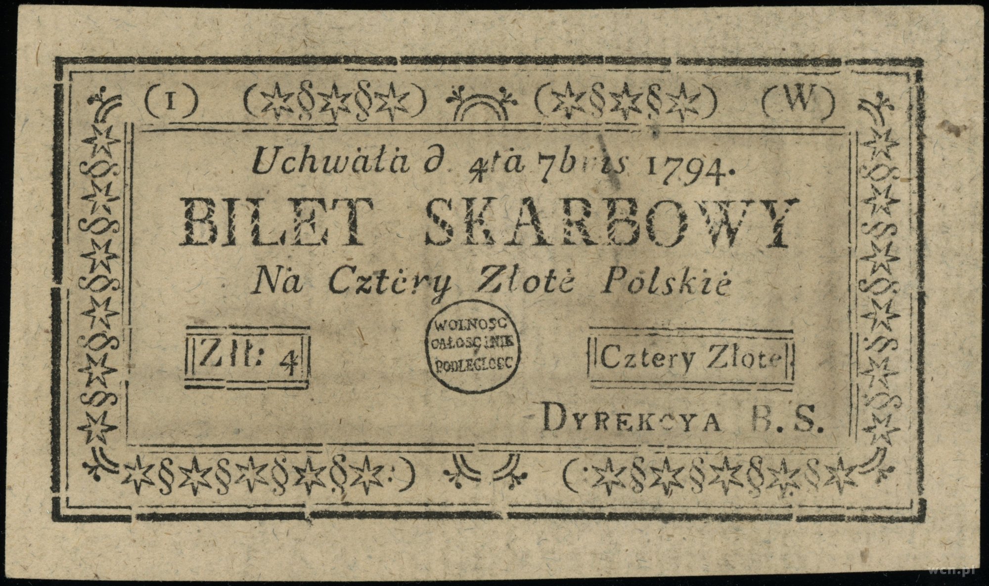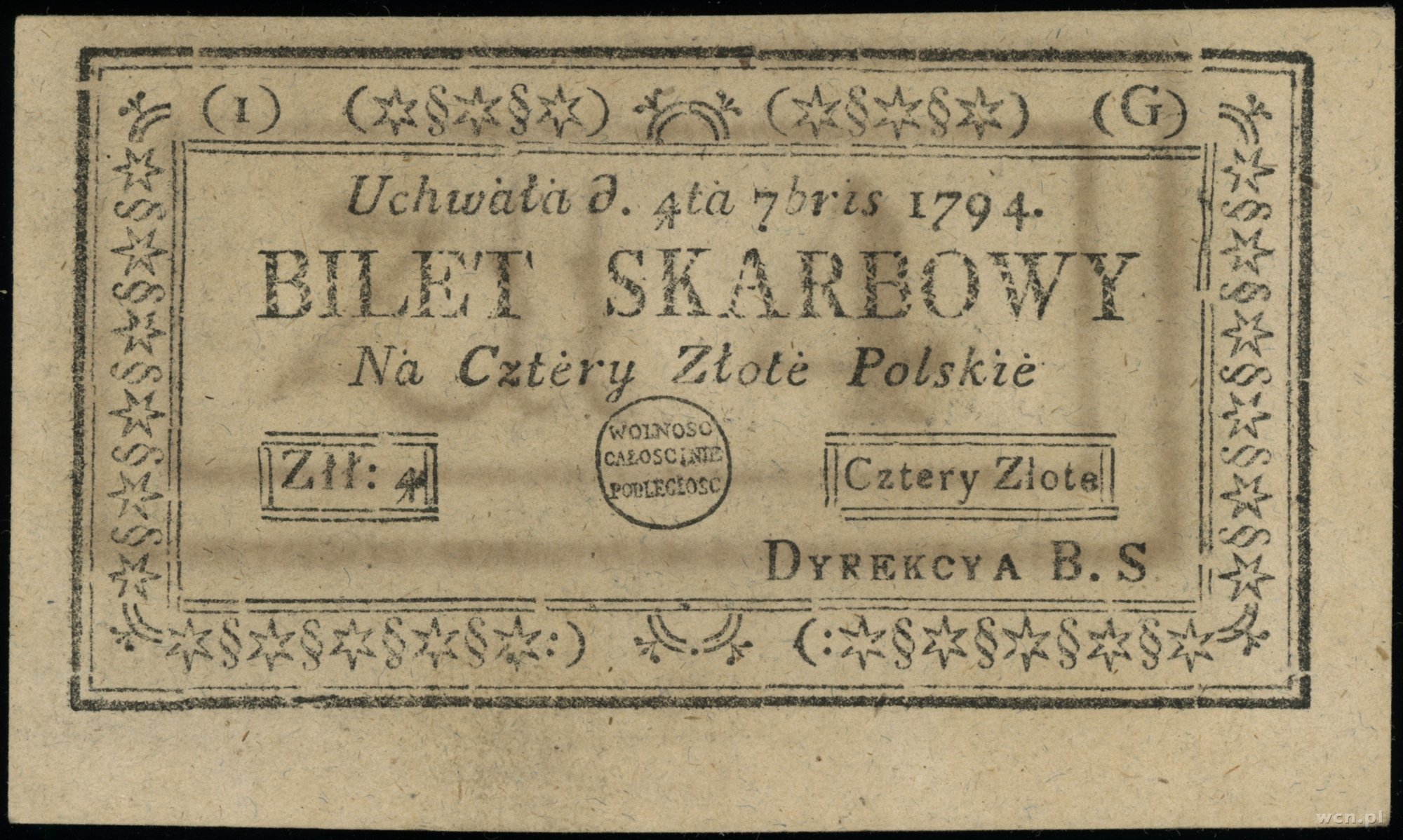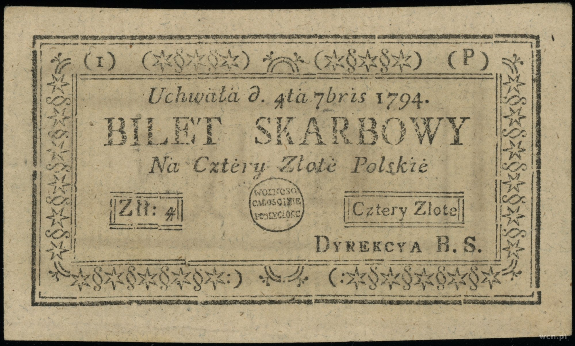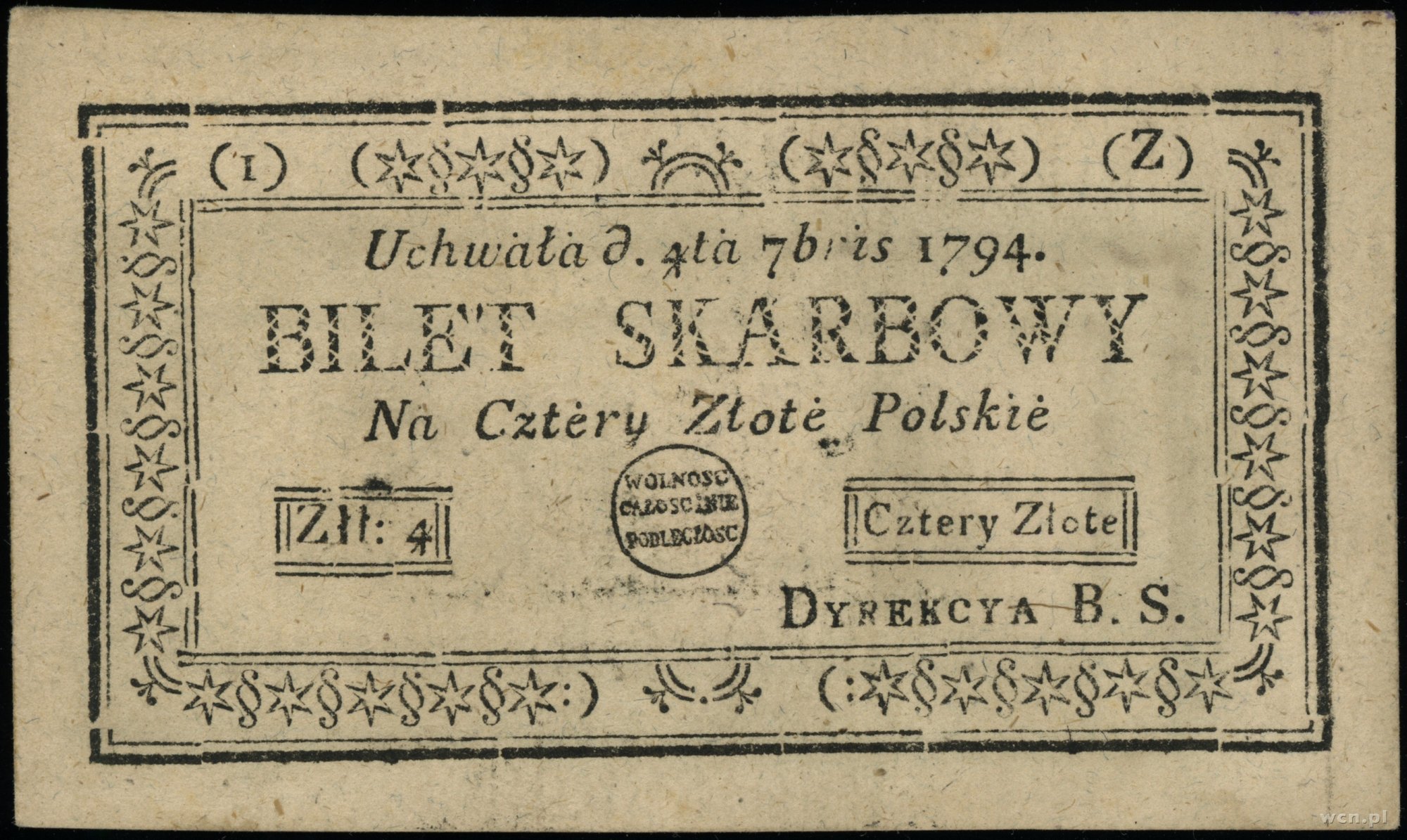 | 25 | Insurekcja Kościuszkowska - bilety z 1794 r.. 4 złote polskie, 4.09.1794; seria 1W; Lucow 45w - dołączony do kolekcji po wydrukowaniu katalogu, Miłczak A11a, Pick A11.. | 0 zł | ||
