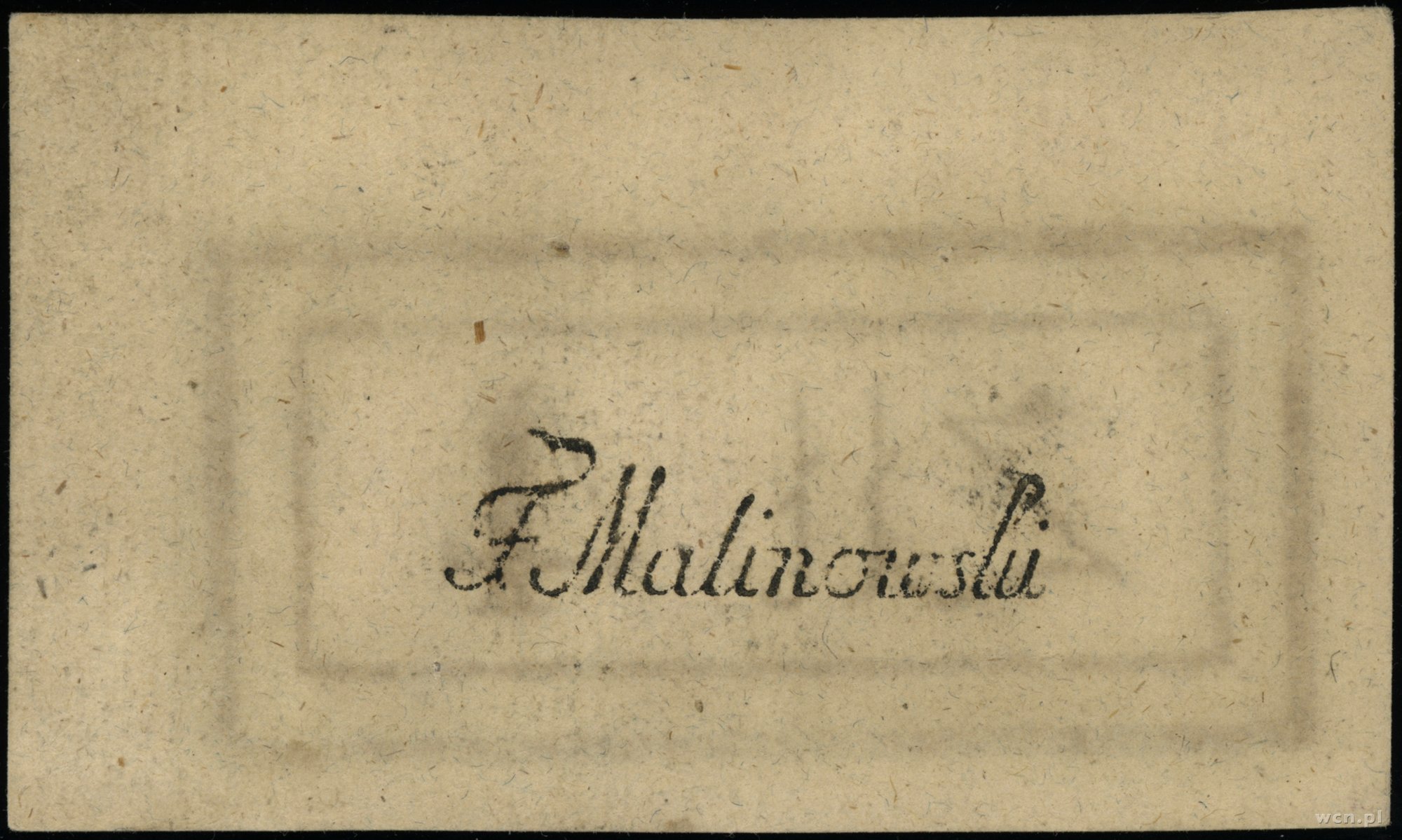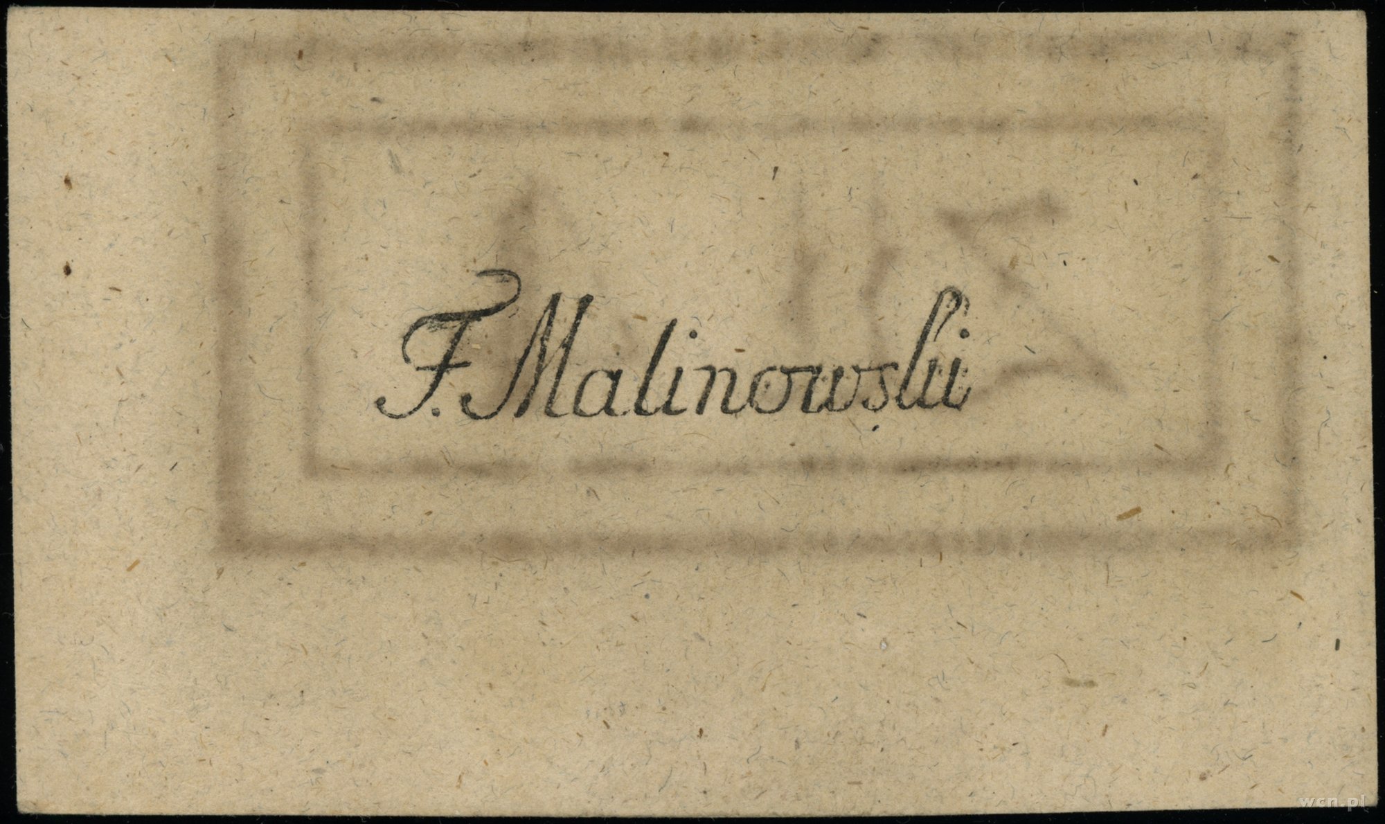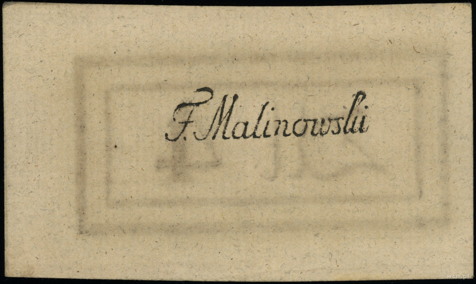 | 24 | Insurekcja Kościuszkowska - bilety z 1794 r.. 4 złote polskie, 4.09.1794; seria 2E; napis "F.Malinowski" odwrócony na odwrocie; Lucow 45 (R5) - ilustrowany w katalogu.. | 0 zł | ||