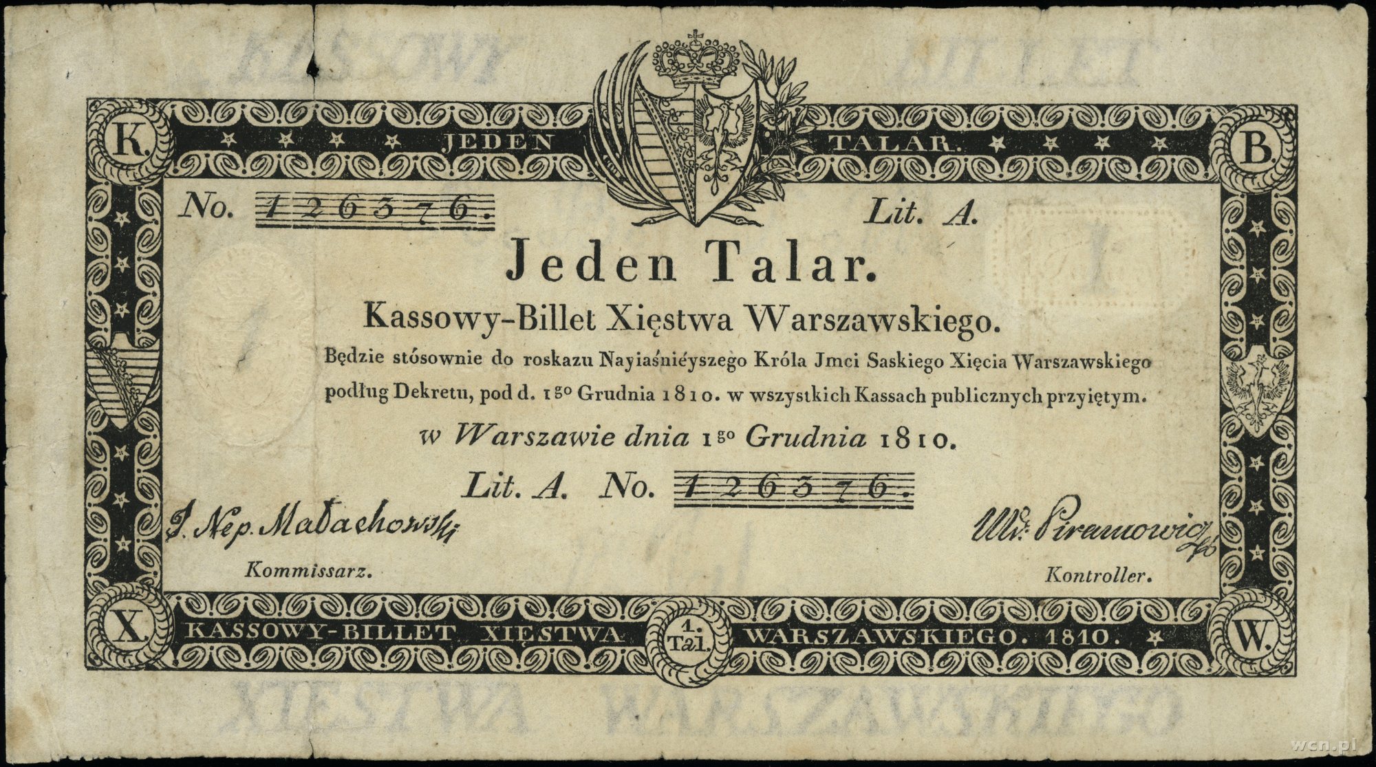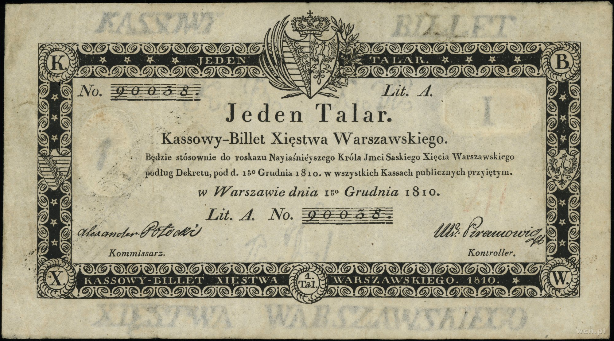 | 27 | Księstwo Warszawskie - bilety z 1810r. 1 talar, 1.12.1810; seria A, numeracja 90038; Lucow 57 (R2) - ilustrowany w katalogu kolekcji, Miłczak A12, Pick A12; w opakowa.. | 0 zł | ||