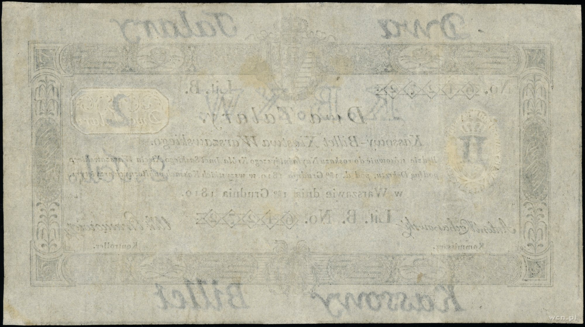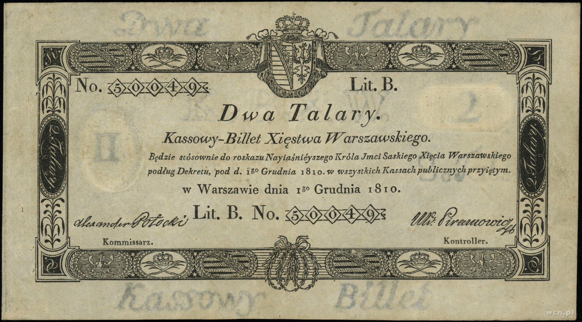 | 28 | Księstwo Warszawskie - bilety z 1810r. 2 talary, 1.12.1810; seria B, numeracja 64272; Lucow 62b (R5) - ilustrowany w katalogu kolekcji, Miłczak A13, Pick A13; w opako.. | 0 zł | ||
