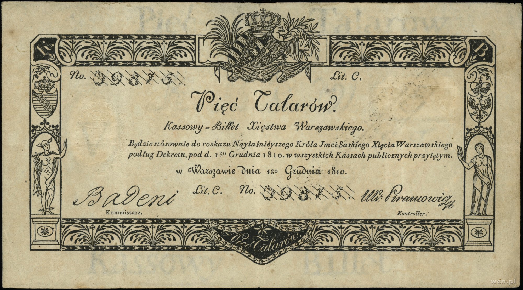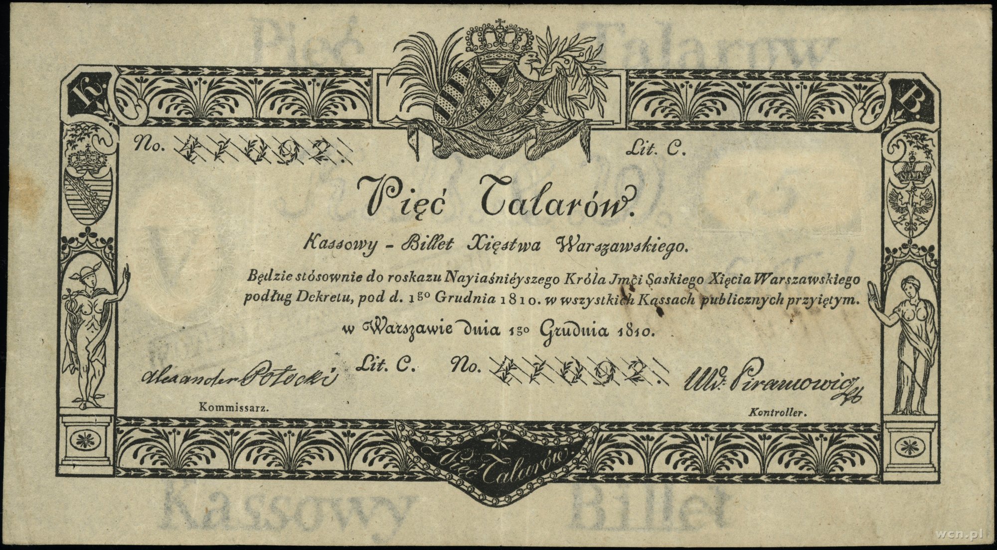 | 31 | Księstwo Warszawskie - bilety z 1810r. 5 talarów, 1.12.1810; seria C, numeracja 41092; Lucow 75a (R7), Miłczak A14, Pick A14; w opakowaniu firmy PMG 2462833-022 z oce.. | 0 zł | ||