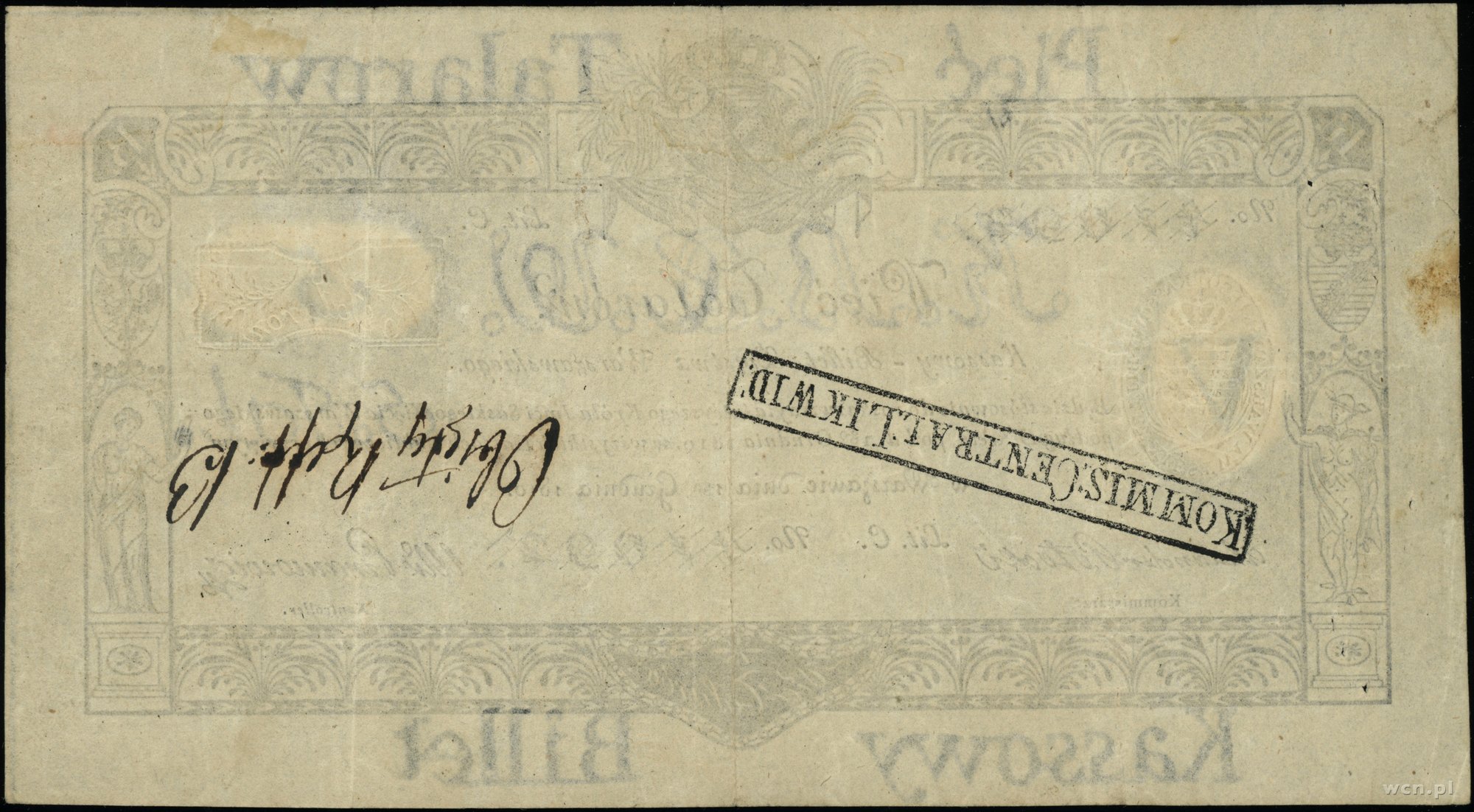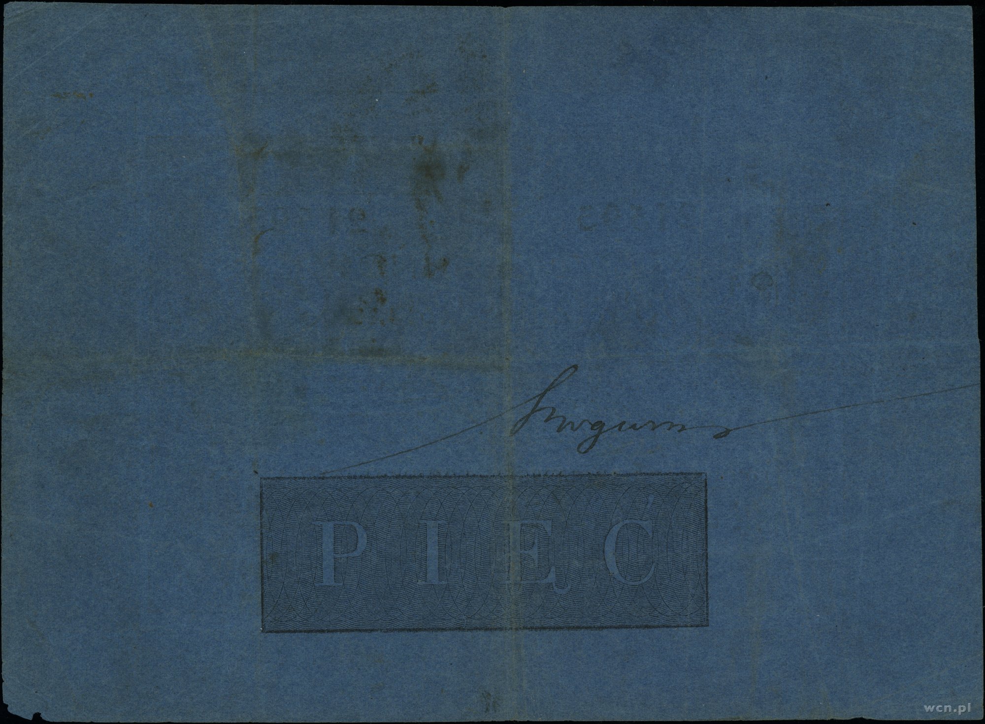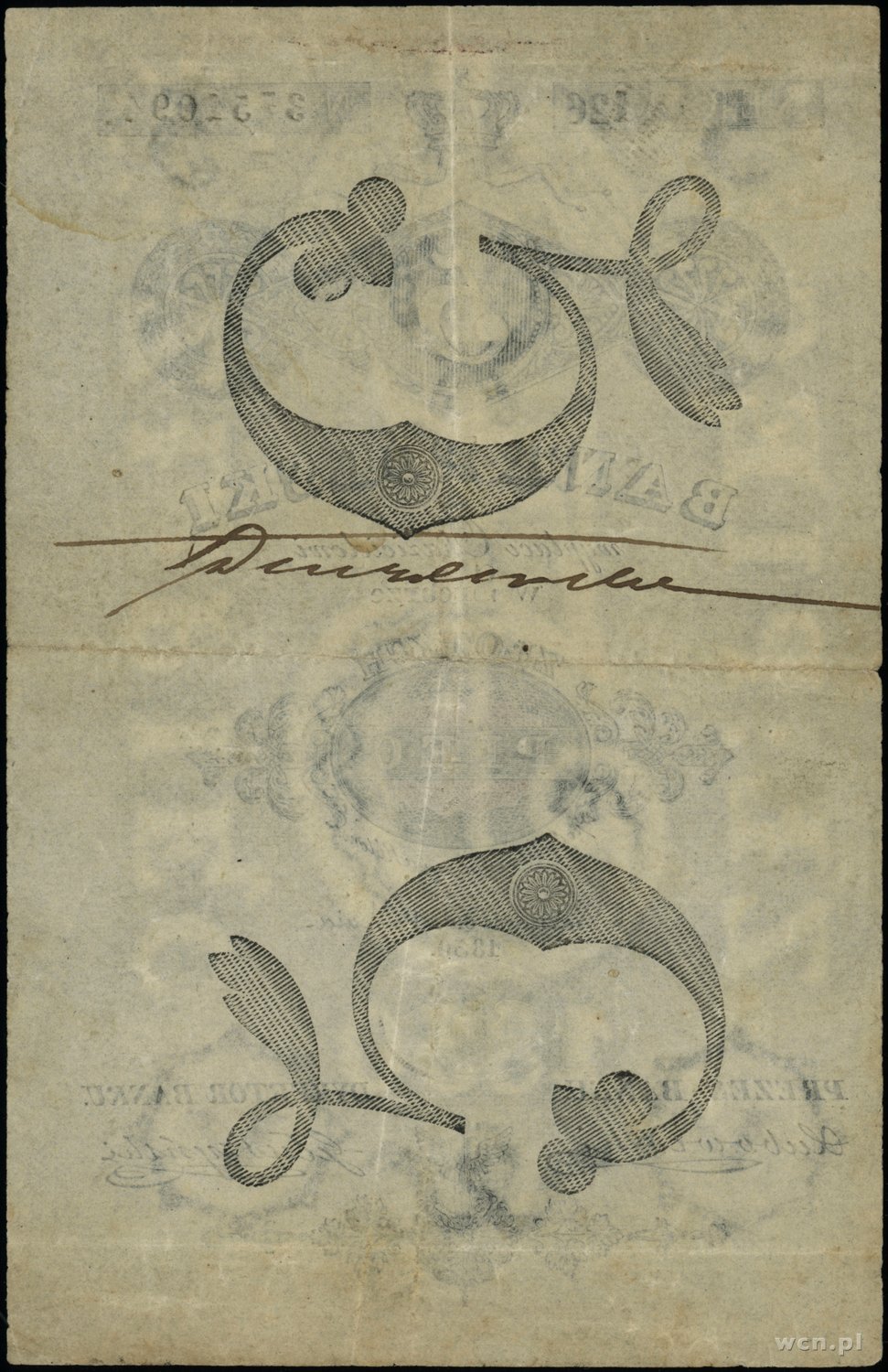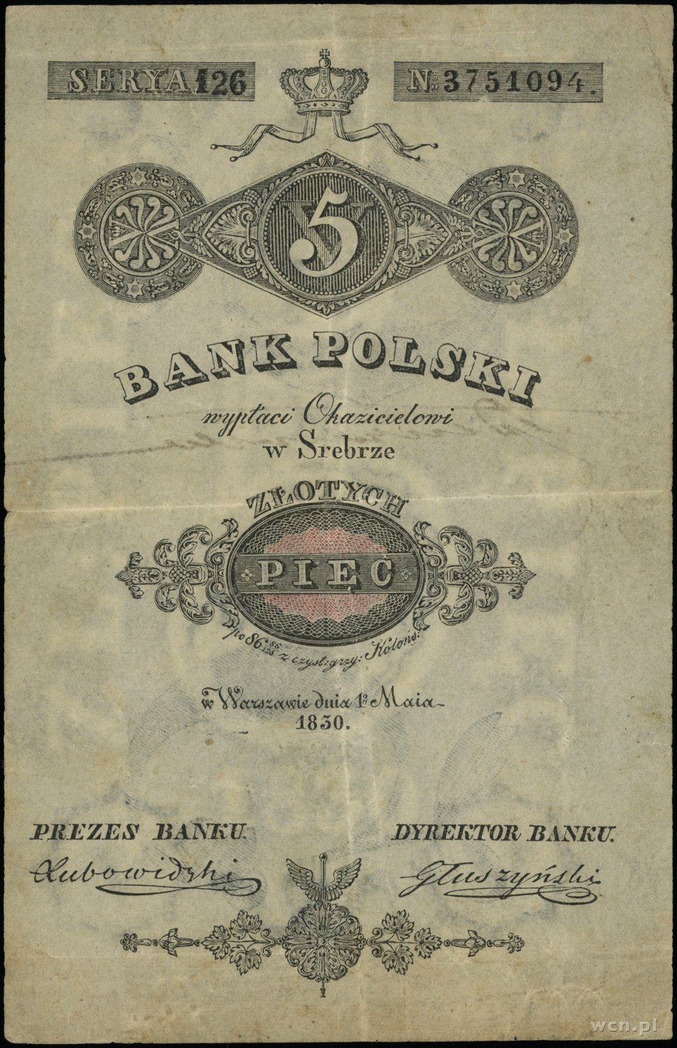 | 35 | Królestwo Polskie - bilety z 1830 r.. 5 złotych polskich, 1.05.1830; seria 126, numeracja 3751094; Lubowidzki / Głuszyński; Lucow 124 (R5) - ilustrowany w katalogu ko.. | 0 zł | ||