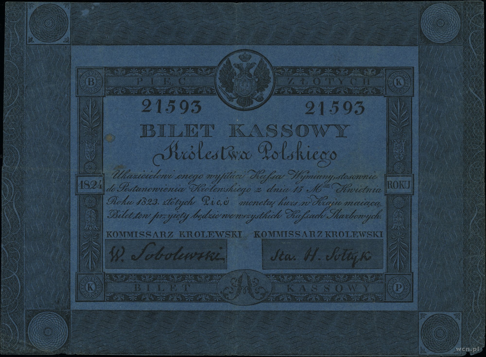 | 32 | Królestwo Polskie - bilety z 1824 r.. 5 złotych polskich, 1824; seria A, numeracja 21593; Sobolewski / Sołtyk; Lucow 97 (R7) - ilustrowany w katalogu kolekcji, Miłcza.. | 0 zł | ||