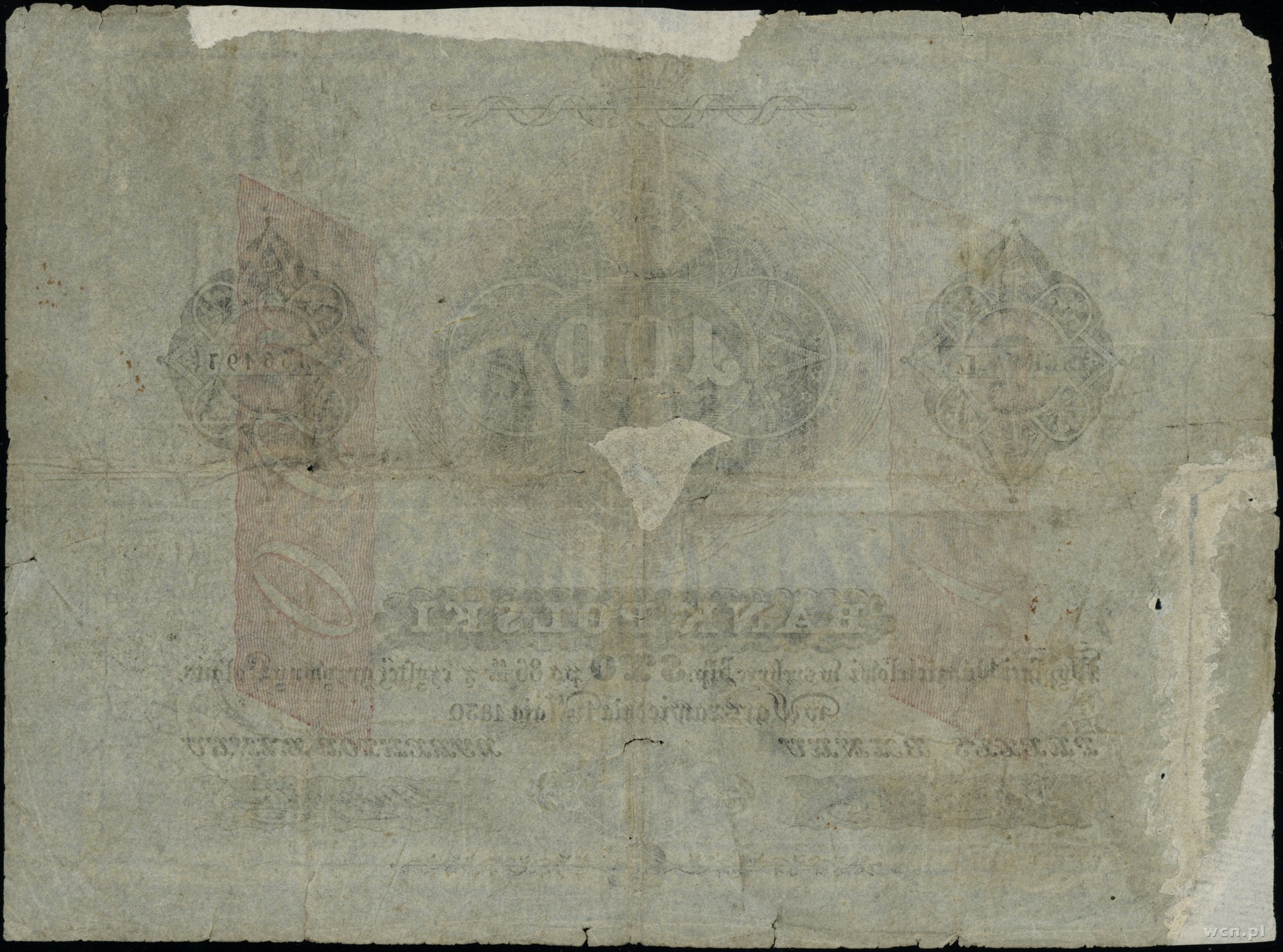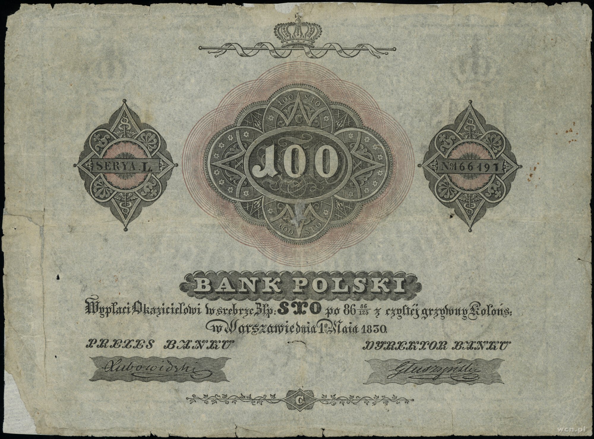 | 36 | Królestwo Polskie - bilety z 1830 r.. 100 złotych polskich, 1.05.1830; seria C/L, numeracja 166197; Lubowidzki / Głuszyński; Lucow 130 (R9) - ilustrowany w katalogu k.. | 0 zł | ||