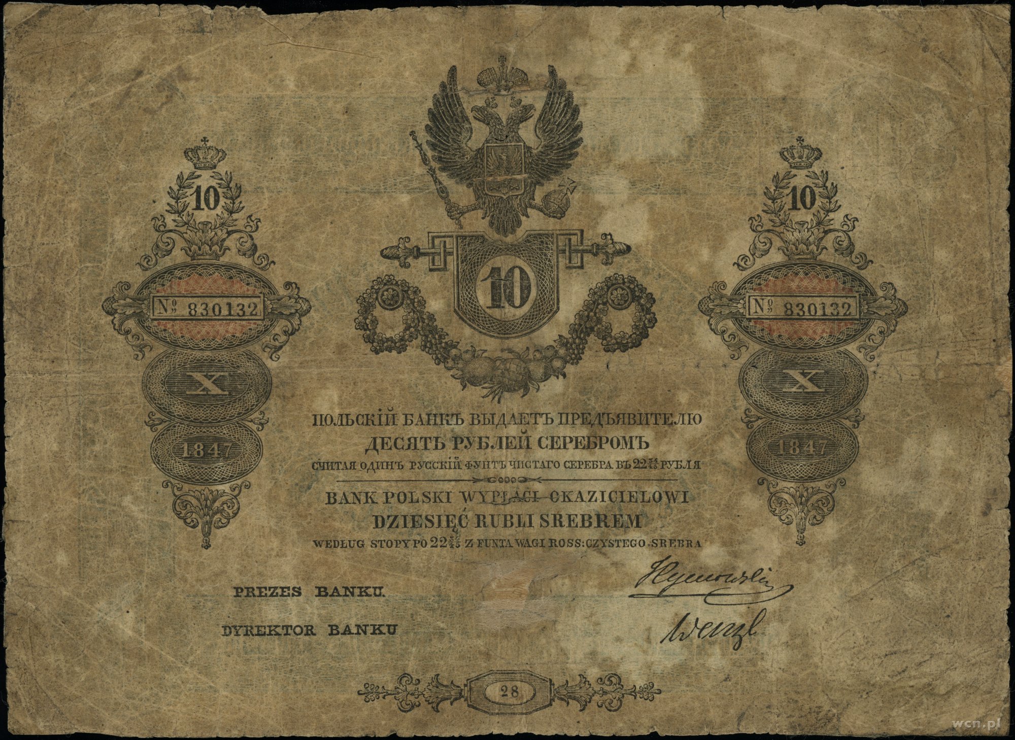 | 38 | Bank Polski - bilety z lat 1841-1866. 10 rubli srebrem, 1847; seria 28, numeracja 830132; Tymowski / Wenzl; Lucow 150 (R8) - ilustrowany w katalogu kolekcji, Miłczak .. | 0 zł | ||