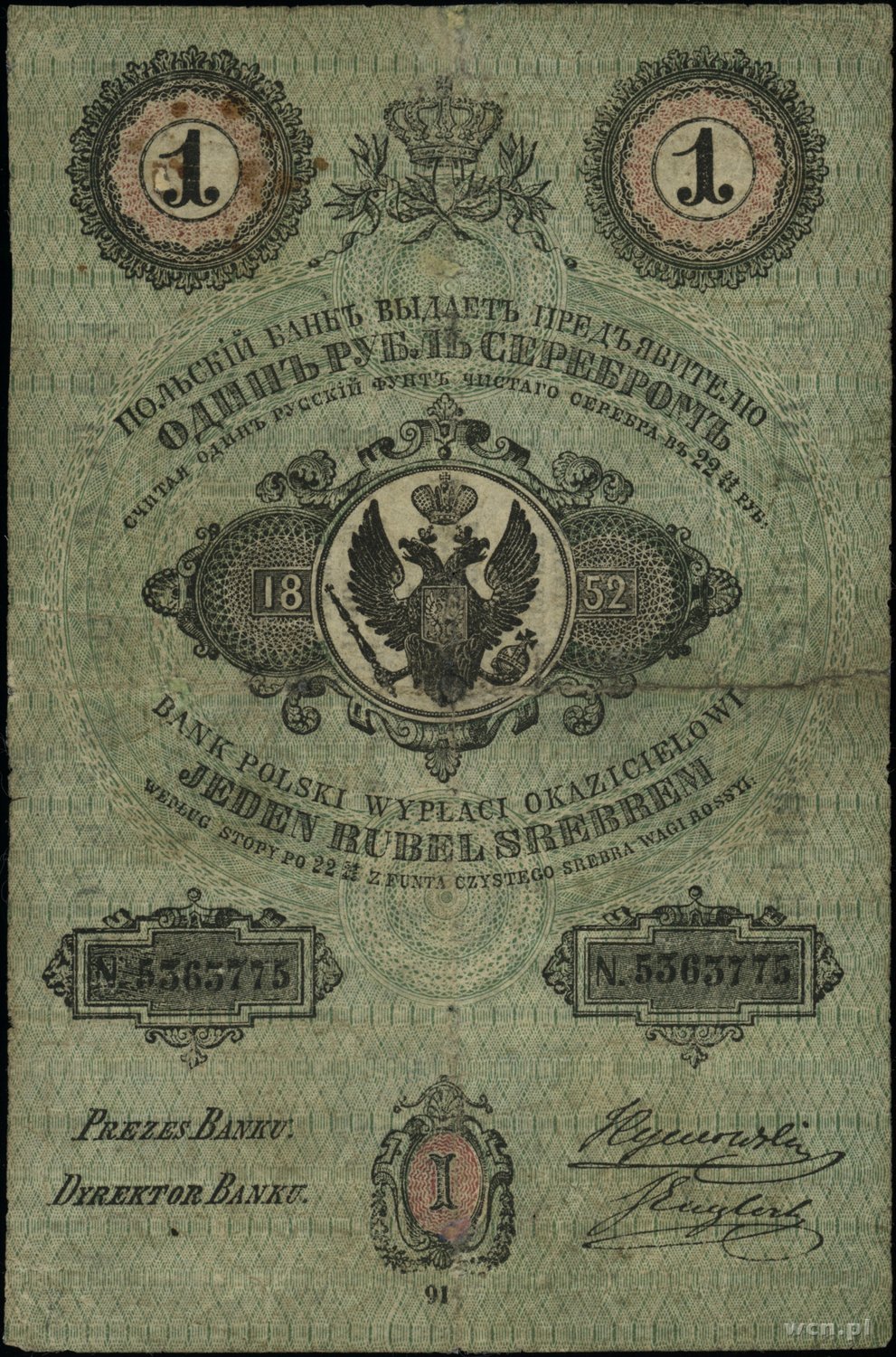 | 39 | Bank Polski - bilety z lat 1841-1866. 1 rubel srebrem, 1852; seria 91, numeracja 5363775; Tymowski / Englert; Lucow 159 (R6) - ilustrowany w katalogu kolekcji, Miłcza.. | 0 zł | ||