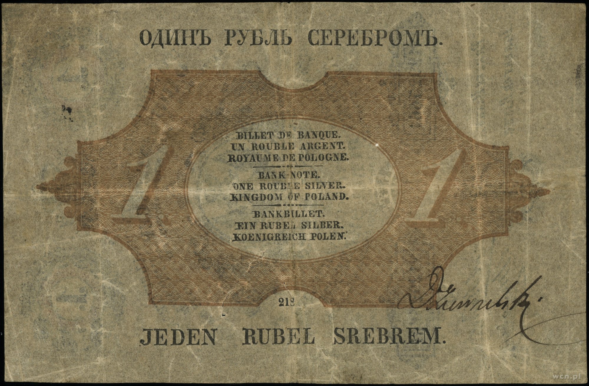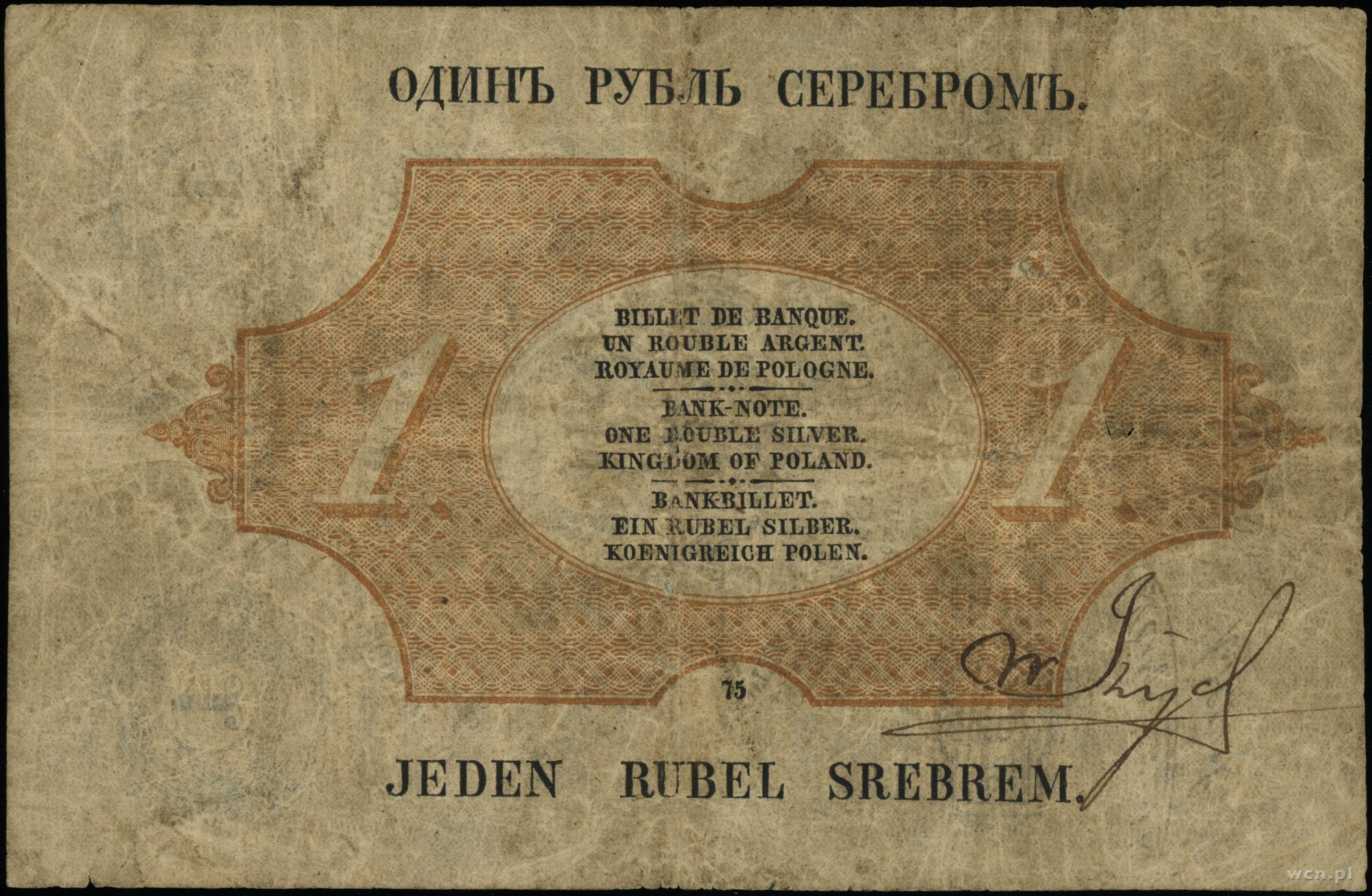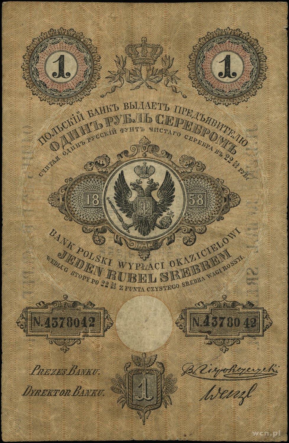 | 41 | Bank Polski - bilety z lat 1841-1866. 1 rubel srebrem, 1858; seria 75, numeracja 4378042; Niepokojczycki / Wenzl; Lucow 177 (R4) - ilustrowany w katalogu kolekcji, Mi.. | 0 zł | ||