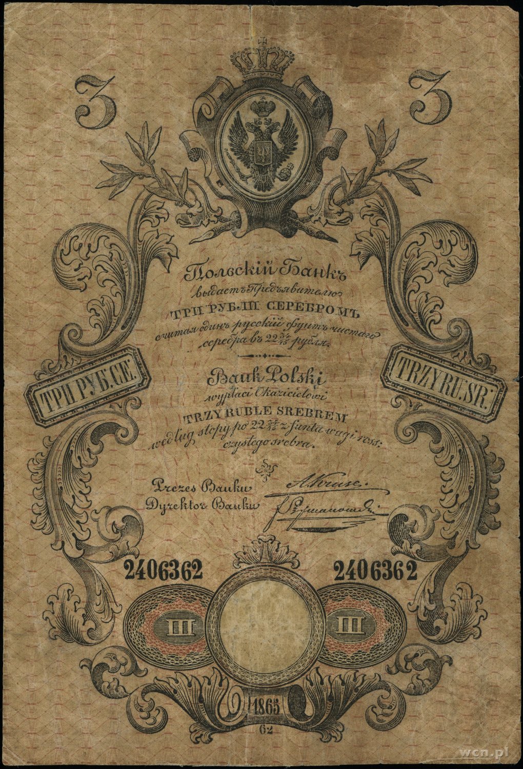 | 42 | Bank Polski - bilety z lat 1841-1866. 3 ruble srebrem, 1865; seria 62, numeracja 2406362; Kruze / Szymanowski; Lucow 183 - dołączony do kolekcji po wydrukowaniu katal.. | 0 zł | ||