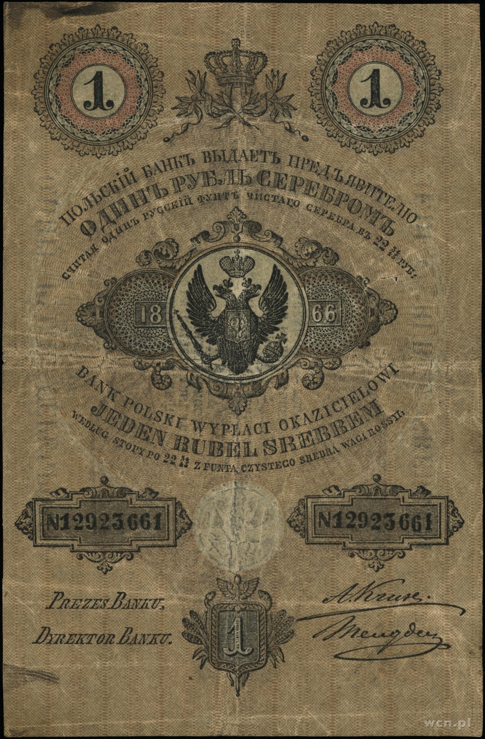 | 43 | Bank Polski - bilety z lat 1841-1866. 1 rubel srebrem, 1866; seria 218, numeracja 12923361; Kruze / Mengden; Lucow 187 (R5) - ilustrowany w katalogu kolekcji, Miłczak.. | 0 zł | ||
