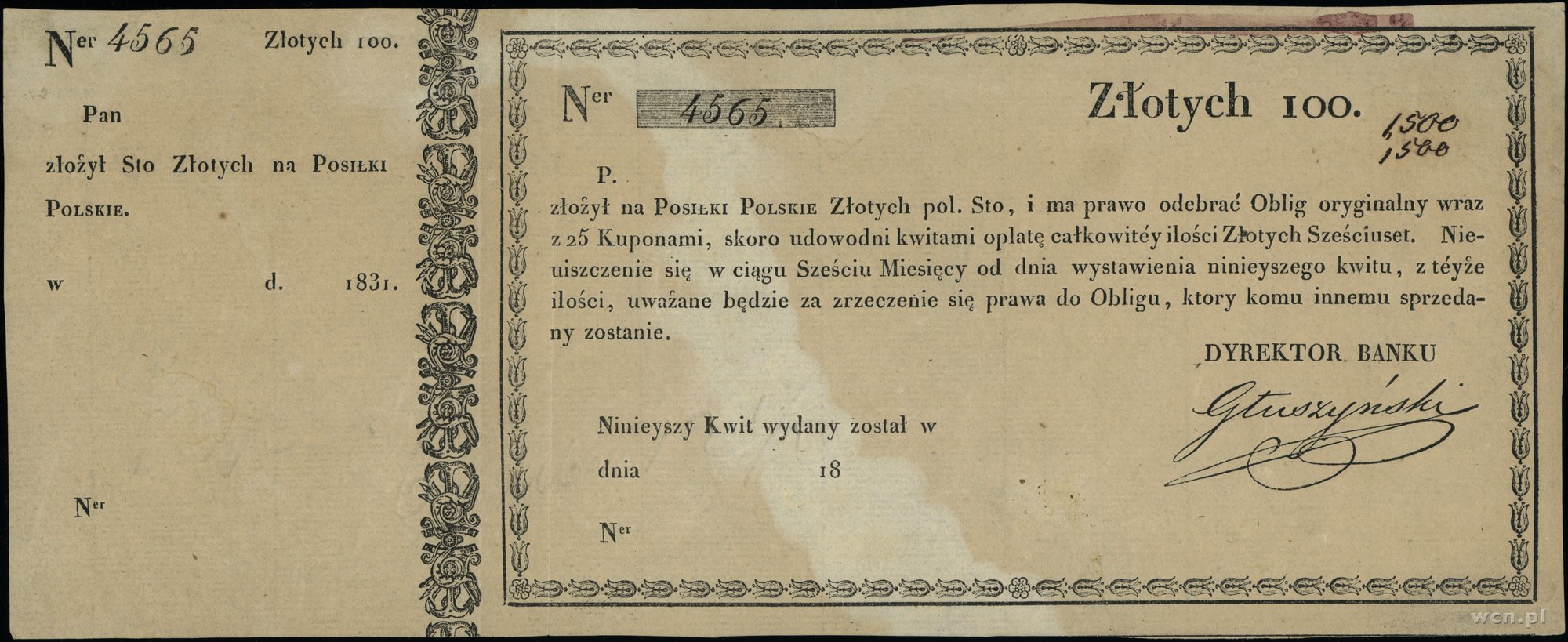 | 44 | Powstanie Listopadowe - asygnacje, kwity i certyfikaty z 1831 r. 100 złotych, 1831, numeracja 4565; kwit Posiłki Polskie; Lucow 200b - dołączony do kolekcji po wydruk.. | 0 zł | ||
