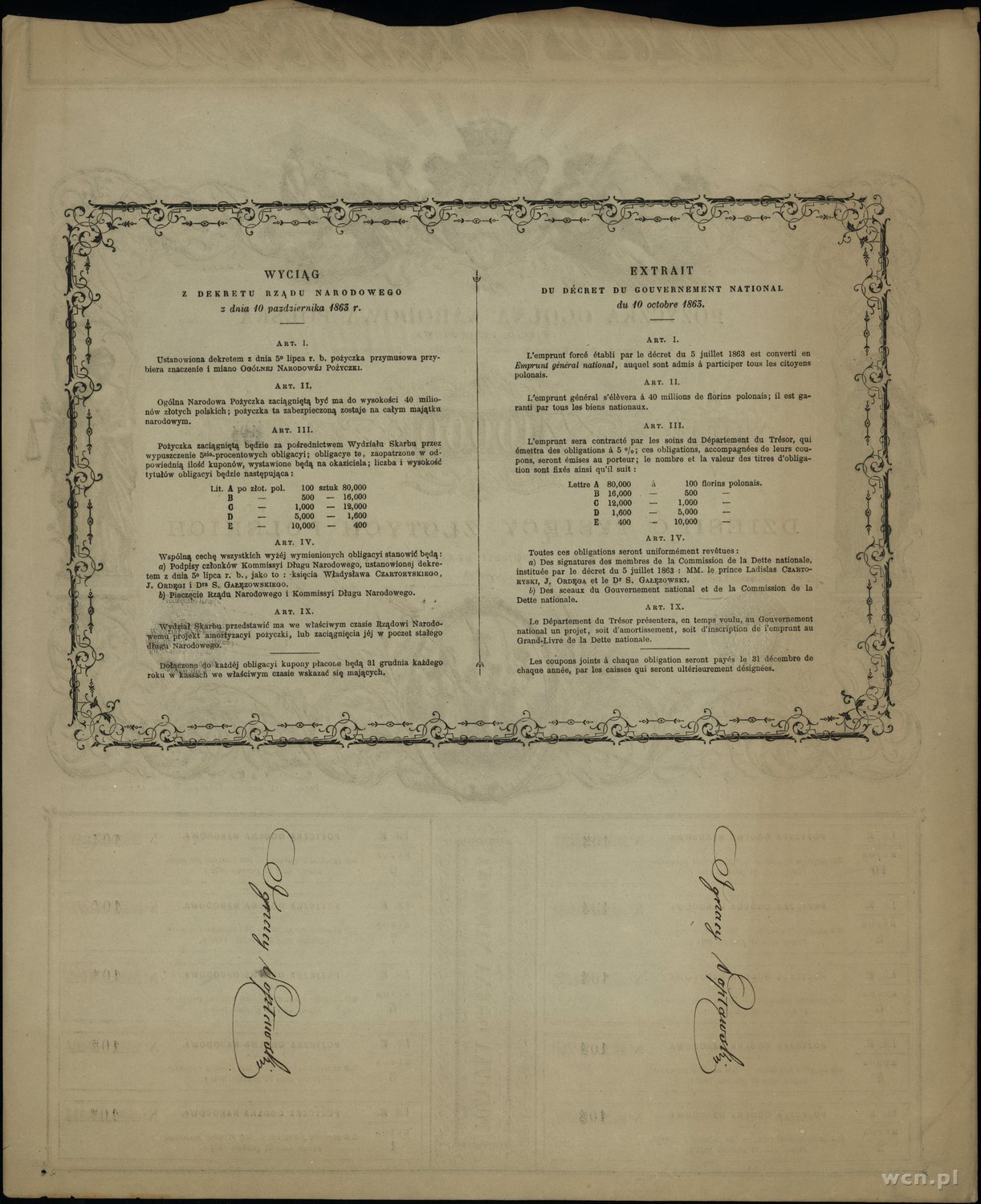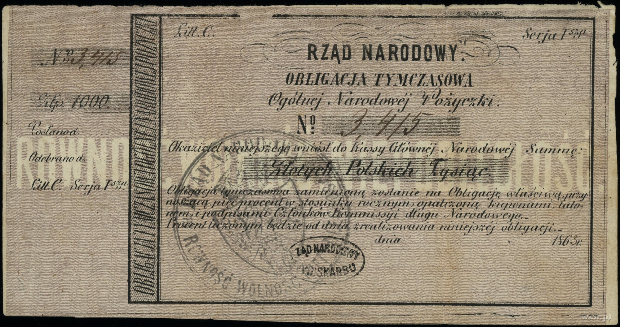 | 46 | Powstanie Styczniowe - awizacje, dokumenty, kwity i obligacje z 1863 r.. obligacja tymczasowa na 1.000 złotych, 1863; seria 1/C, numeracja 3415; Ogólna Narodowa Pożyc.. | 0 zł | ||