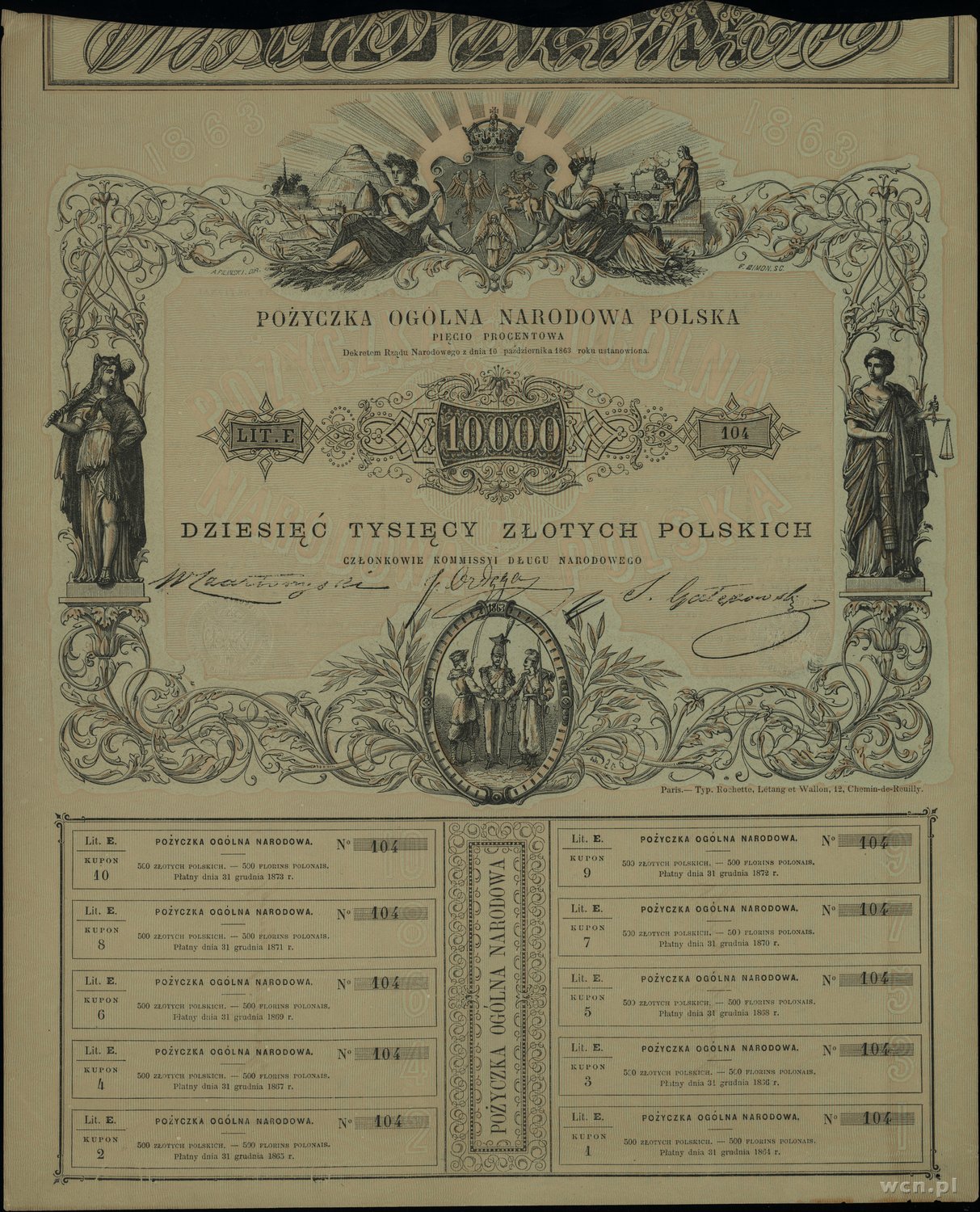 | 47 | Powstanie Styczniowe - awizacje, dokumenty, kwity i obligacje z 1863 r.. obligacja stała na 10.000 złotych, 1863, numeracja 104; Ogólna Narodowa Pożyczka; Lucow 220d .. | 0 zł | ||