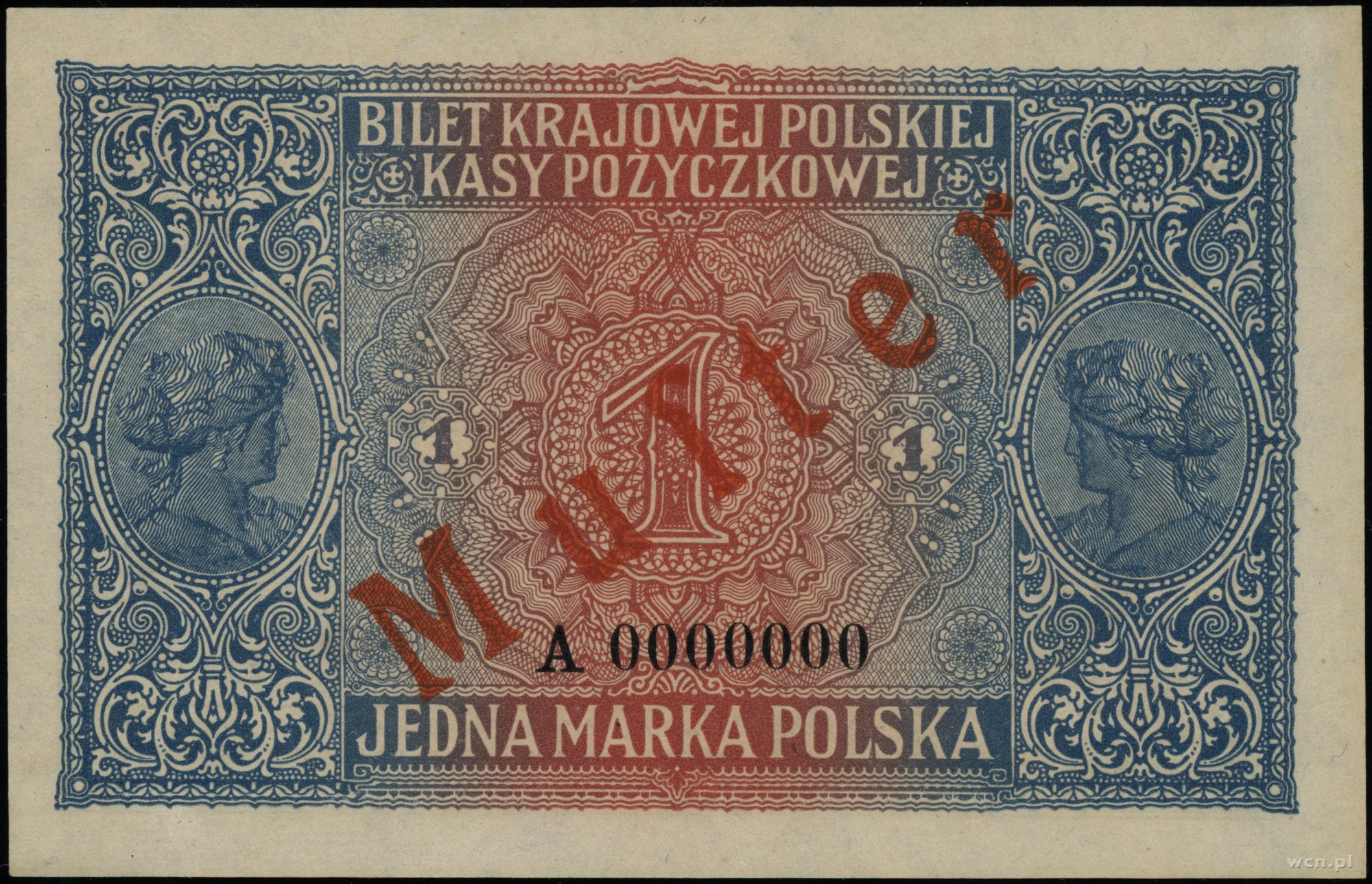 | 48 | Polska Kasa Pożyczkowa - Zarząd jenerał-gubernatorstwa warszawskiego. 1 marka polska, 9.12.1916; seria A, numeracja 0000000; wzór biletu; Lucow 253 (R7) - ilustrowany.. | 0 zł | ||
