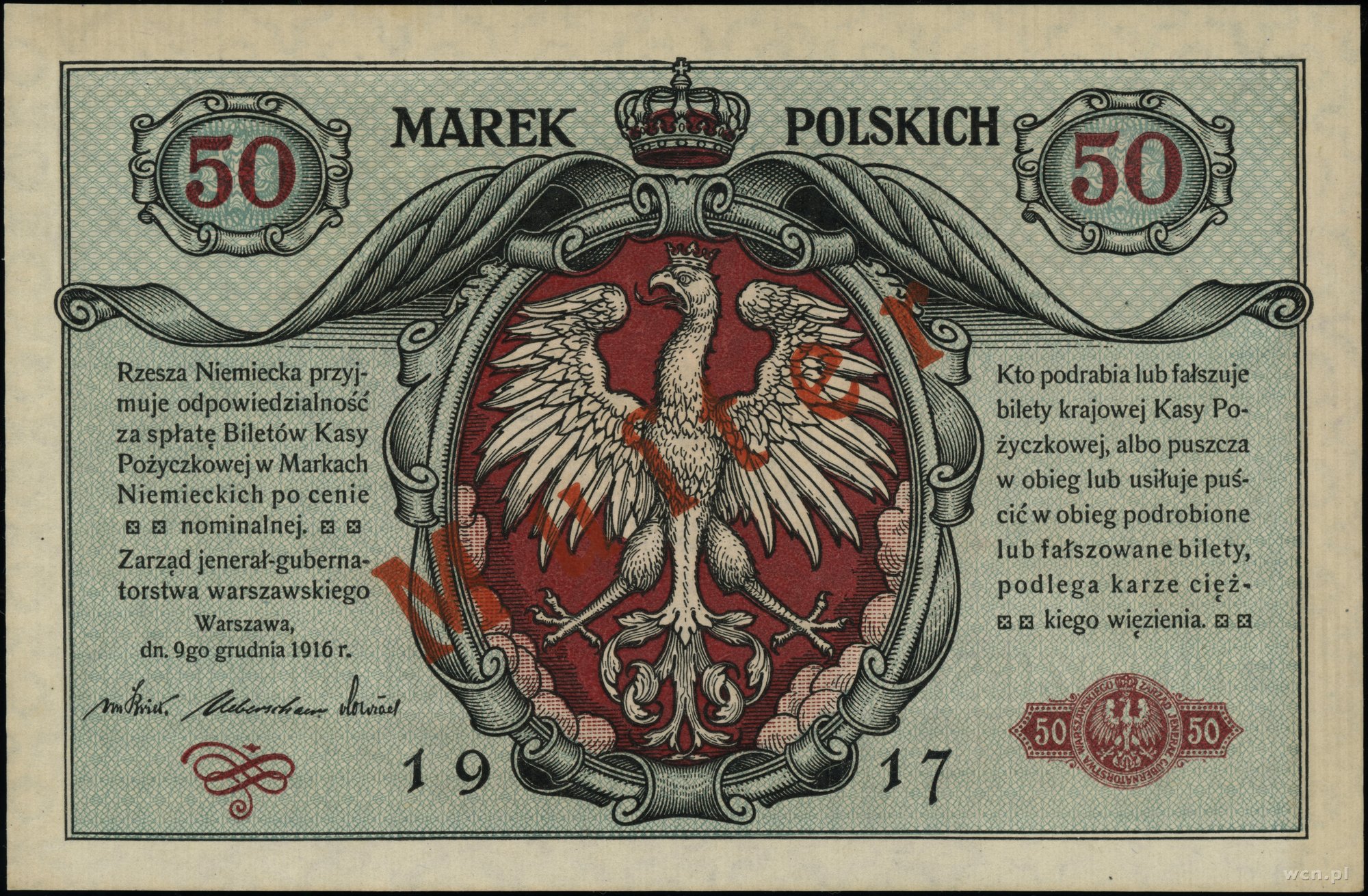 | 49 | Polska Kasa Pożyczkowa - Zarząd jenerał-gubernatorstwa warszawskiego. 50 marek polskich, 9.12.1916; seria A, numeracja 0000000; wzór biletu; Lucow 261 (R8) - ilustrow.. | 0 zł | ||