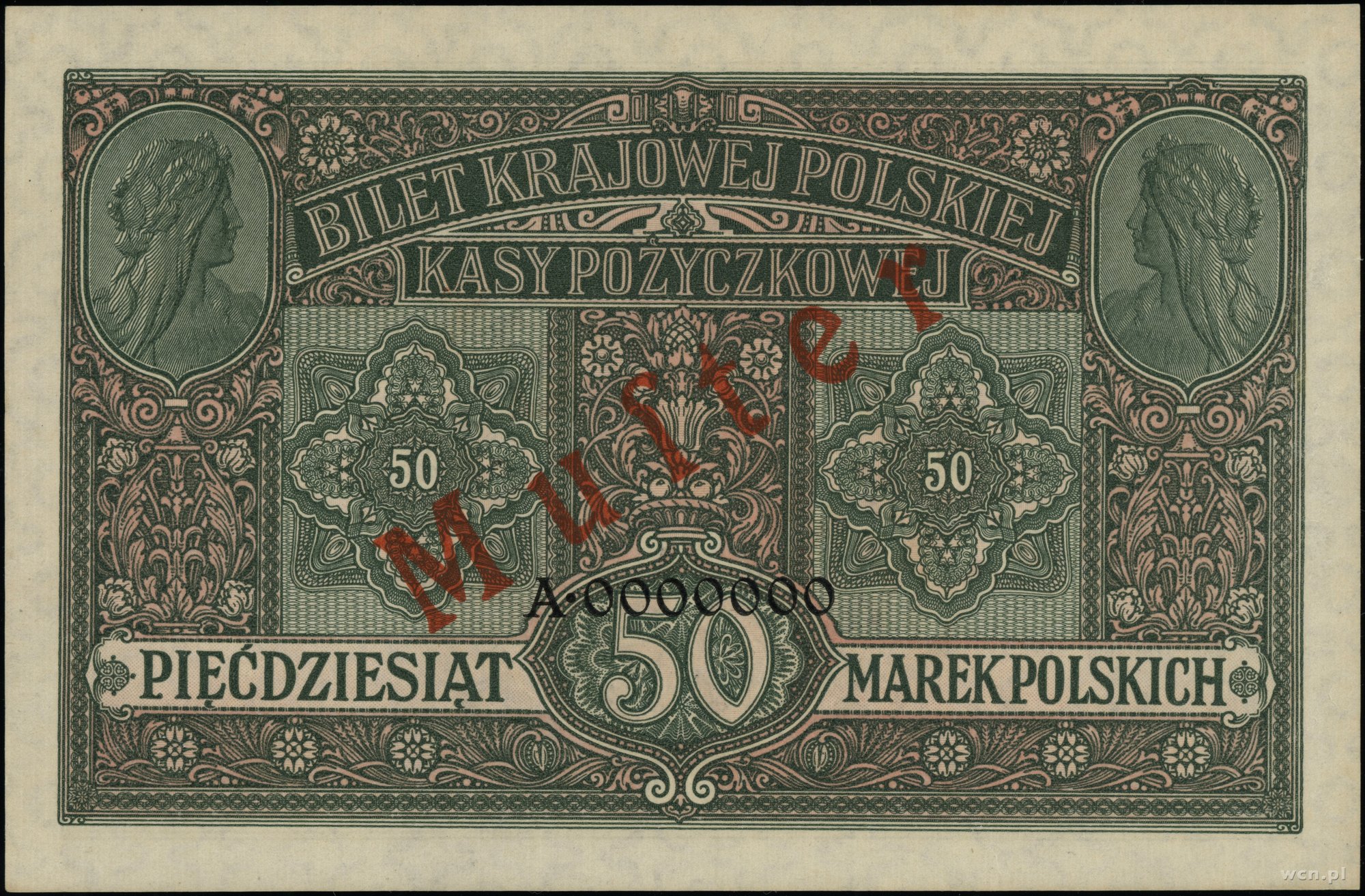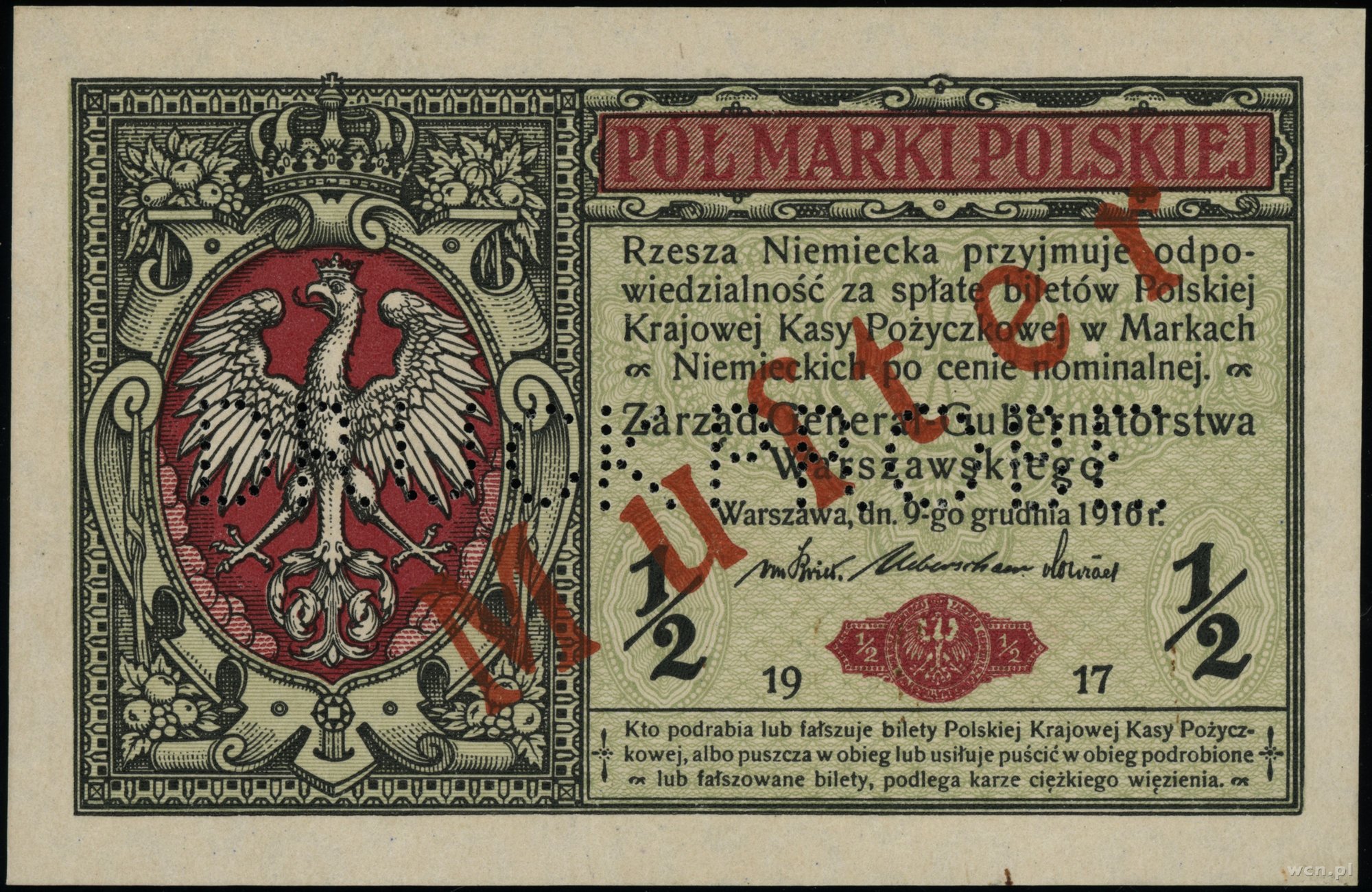 | 51 | Polska Kasa Pożyczkowa - Zarząd Generał–Gubernatorstwa Warszawskiego. 1/2 marki polskiej, 9.12.1916; seria B, numeracja 0000000; jednostronny wzór str. odwrotnej; Luc.. | 0 zł | ||