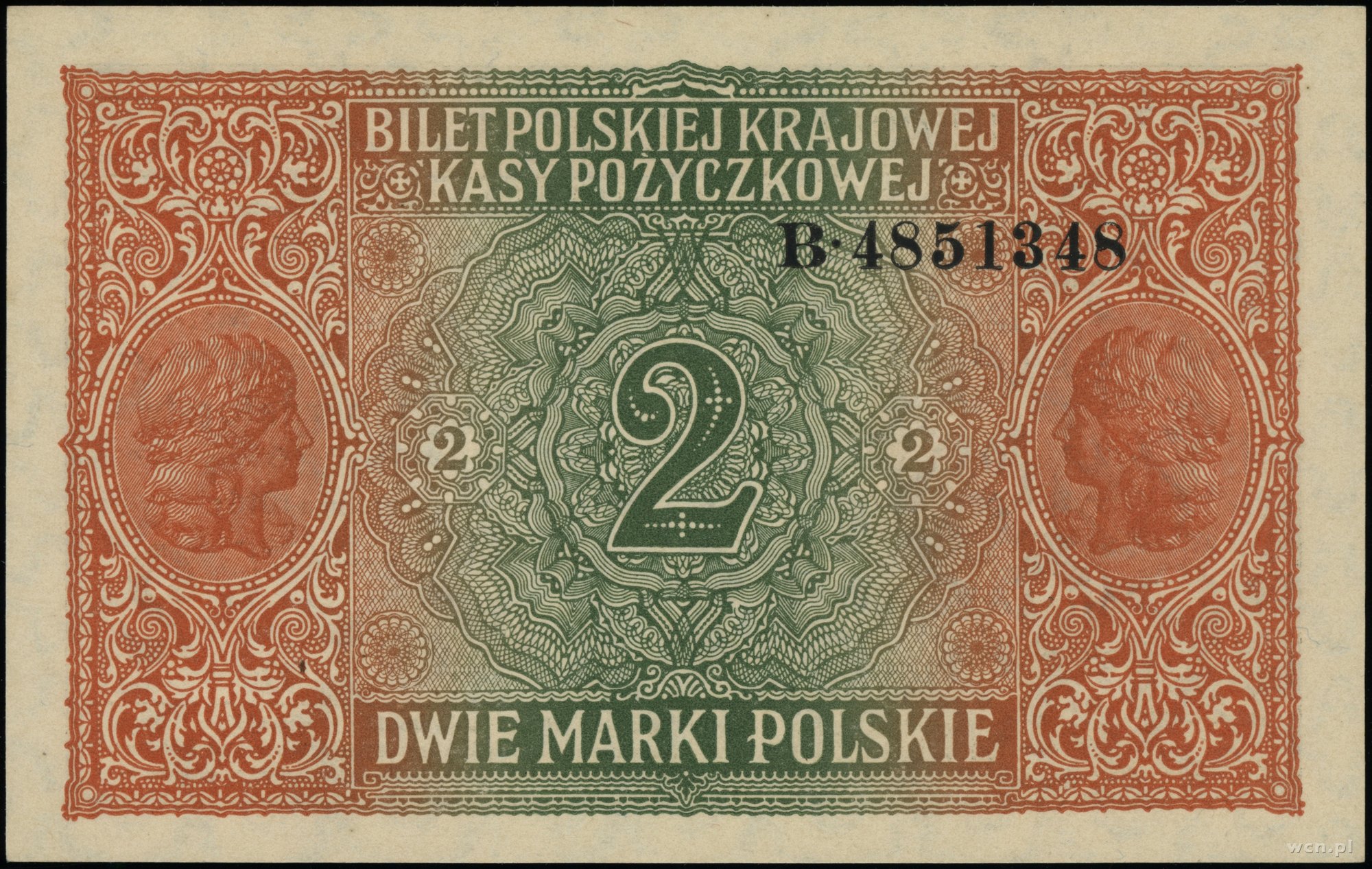 | 52 | Polska Kasa Pożyczkowa - Zarząd Generał–Gubernatorstwa Warszawskiego. 2 marki polskie, 9.12.1916; seria B, numeracja 4851348; Lucow 277 (R2), Miłczak 9b, Pick 9; w op.. | 0 zł | ||