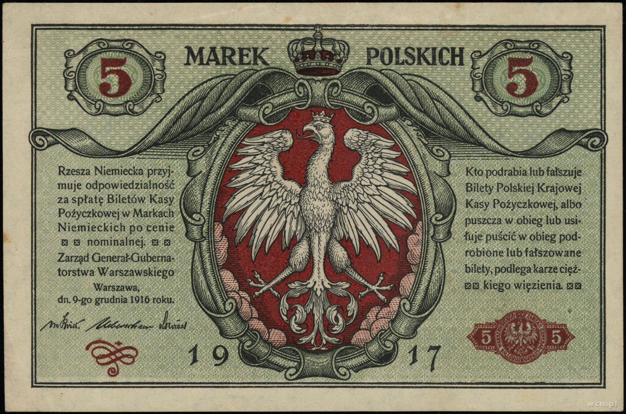 | 53 | Polska Kasa Pożyczkowa - Zarząd Generał–Gubernatorstwa Warszawskiego. 5 marek polskich, 9.12.1916; seria A, numeracja 1105152; odmiana Biletów / Bilety; Lucow 280 (R4.. | 0 zł | ||