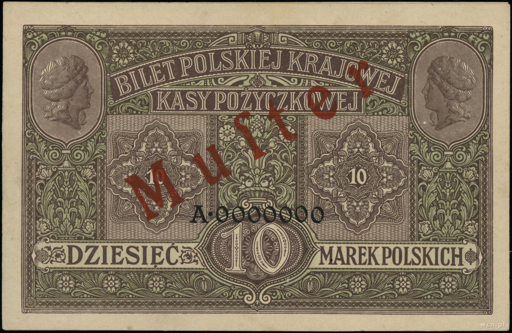 | 54 | Polska Kasa Pożyczkowa - Zarząd Generał–Gubernatorstwa Warszawskiego. 10 marek polskich, 9.12.1916; seria A, numeracja 0000000; wzór biletu - sklejony z dwóch druków .. | 0 zł | ||