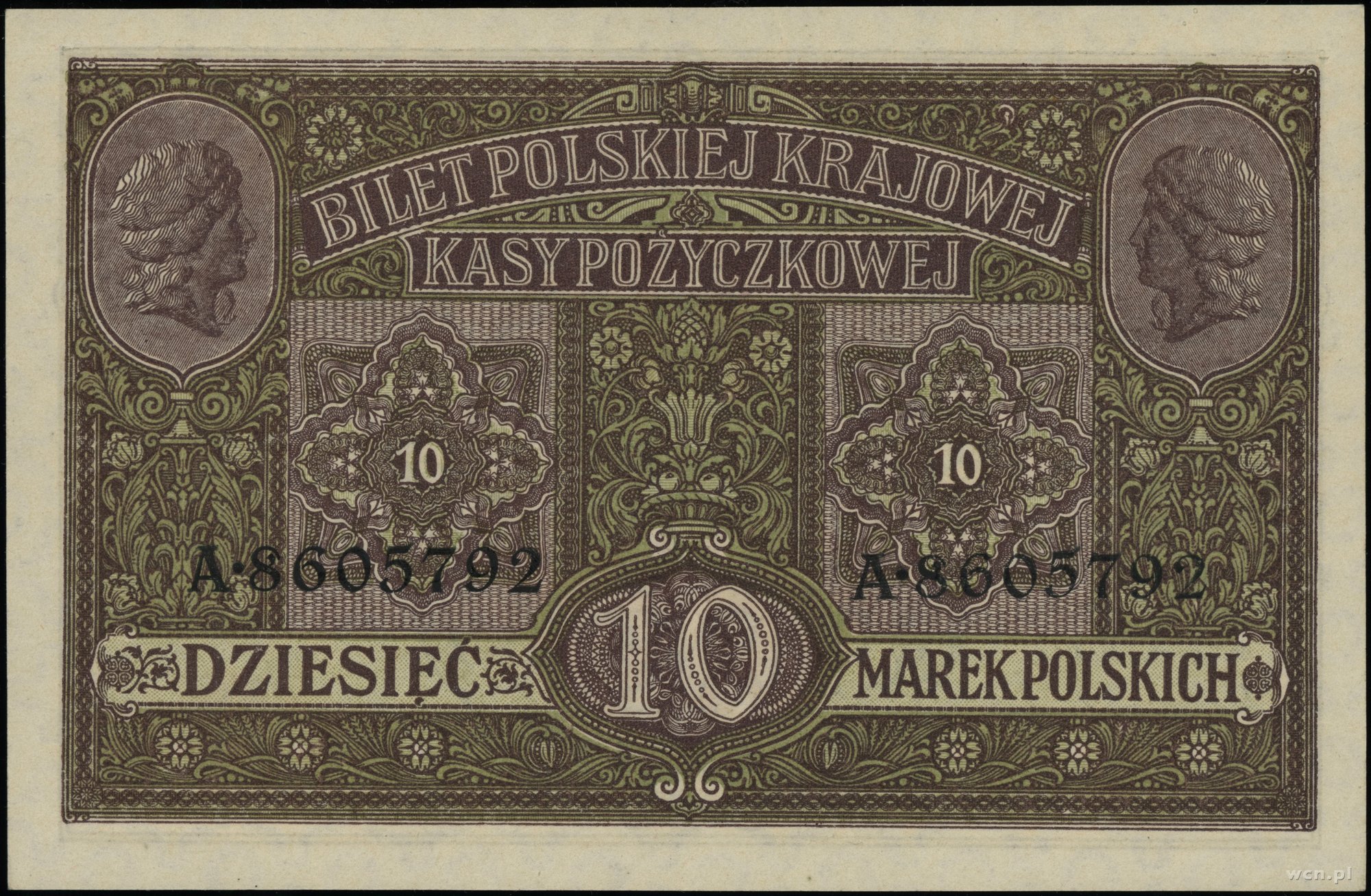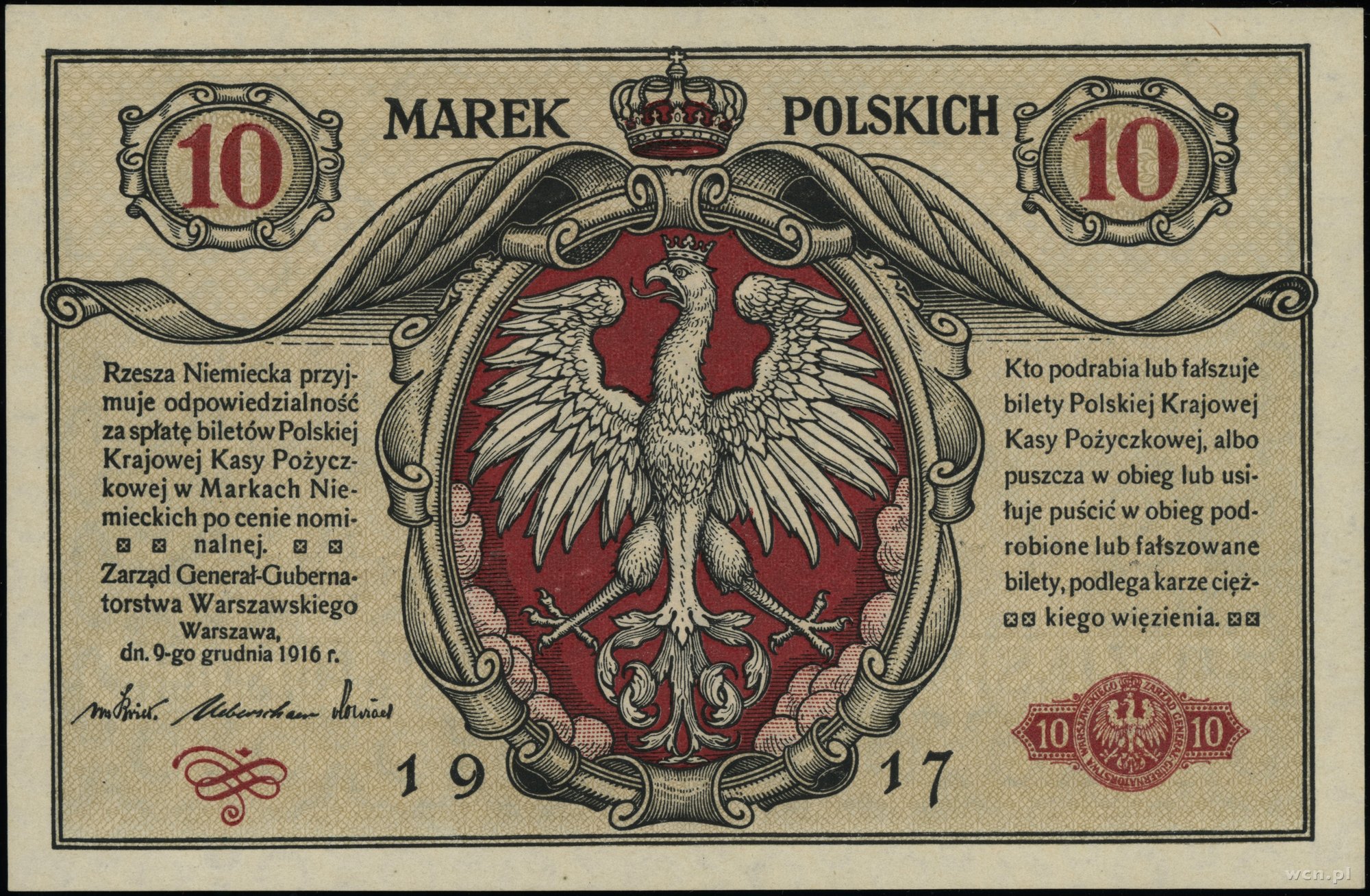 | 55 | Polska Kasa Pożyczkowa - Zarząd Generał–Gubernatorstwa Warszawskiego. 10 marek polskich, 9.12.1916; seria A, numeracja 8605792; odmiana biletów / bilety; Lucow 292 (R.. | 0 zł | ||