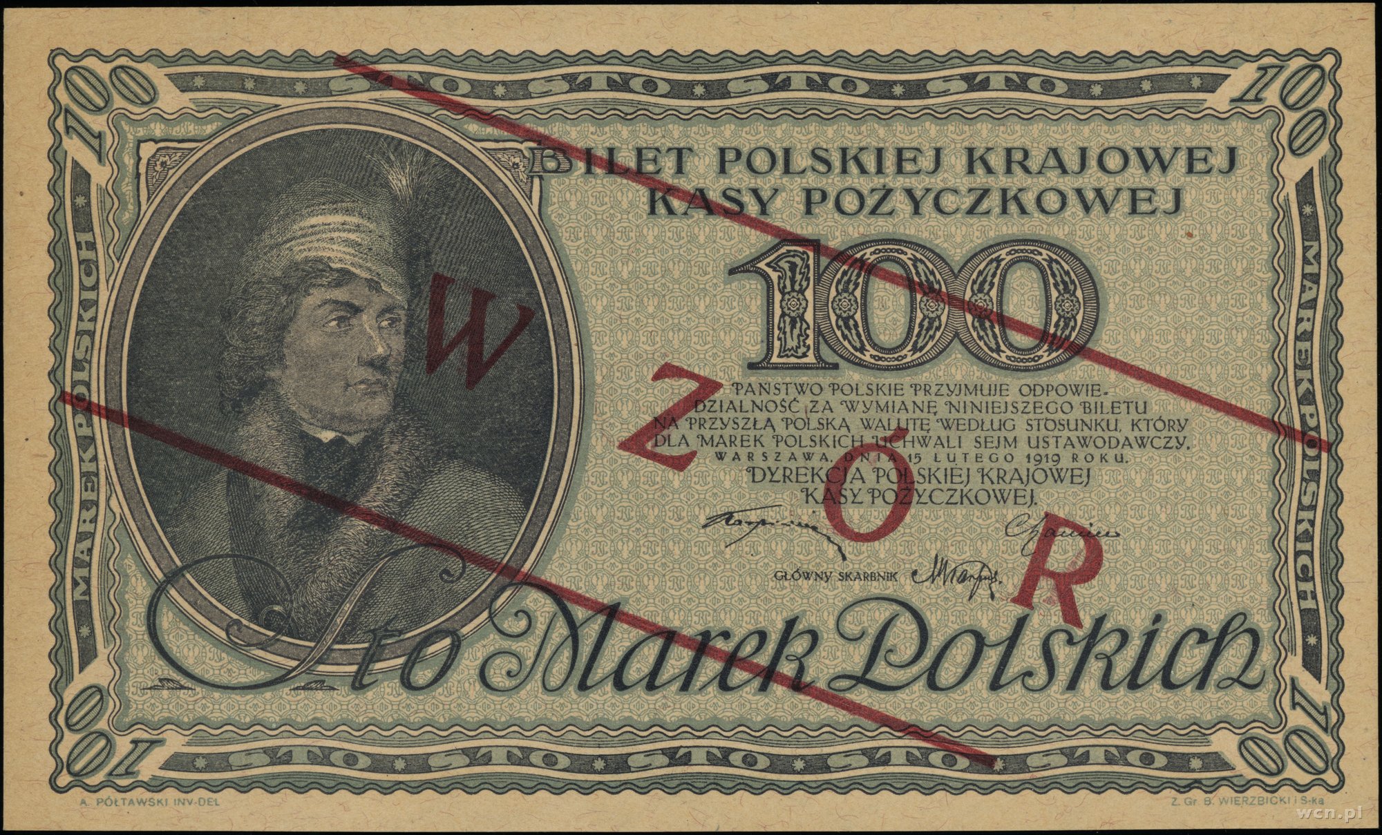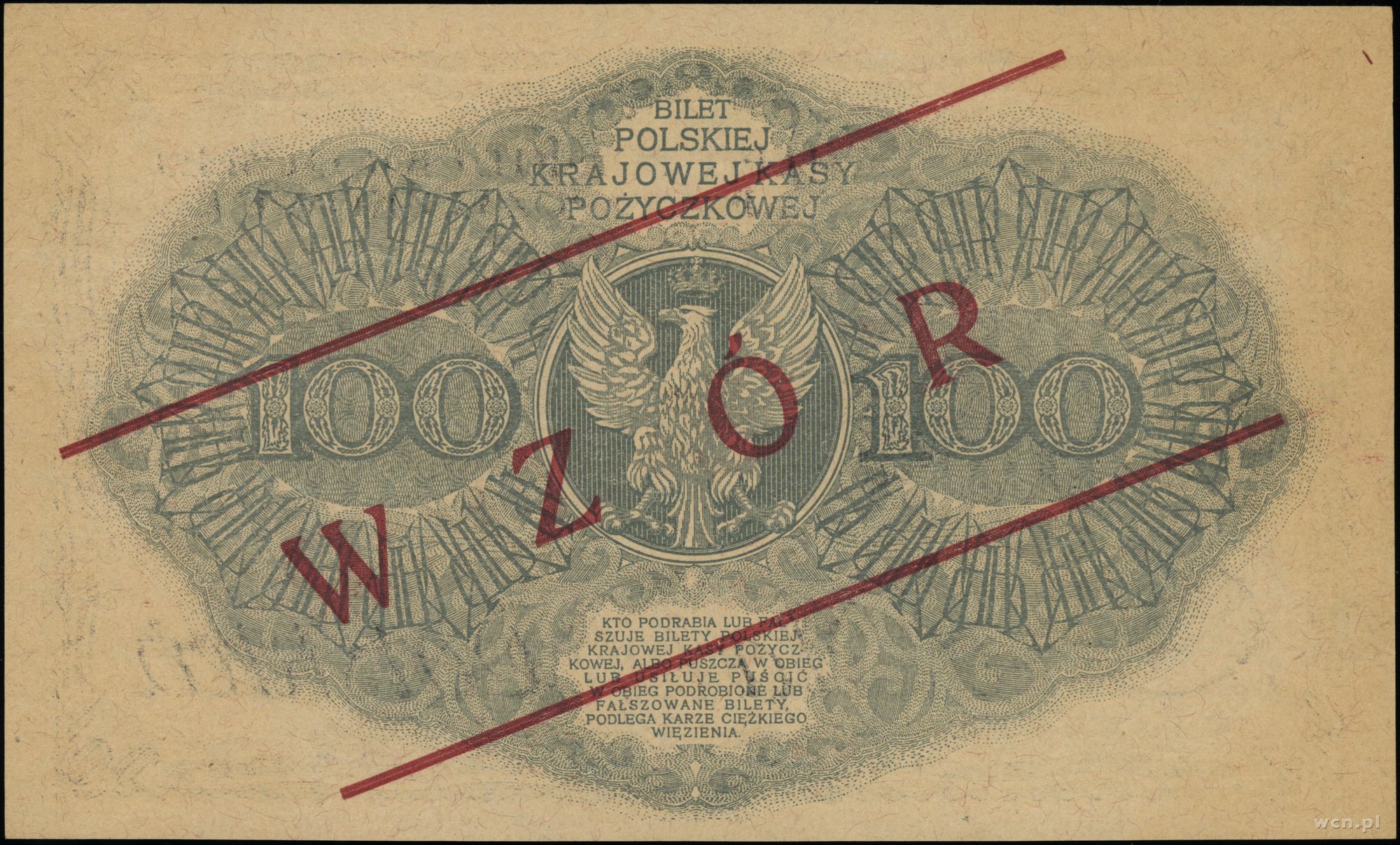 | 58 | Polska Krajowa Kasa Pożyczkowa, emisje z 1919 r.. 100 marek polskich, 15.02.1919; seria brak, numeracja brak; wzór biletu - nadruk WZÓR po obu stronach; Lucow 313a (R.. | 0 zł | ||
