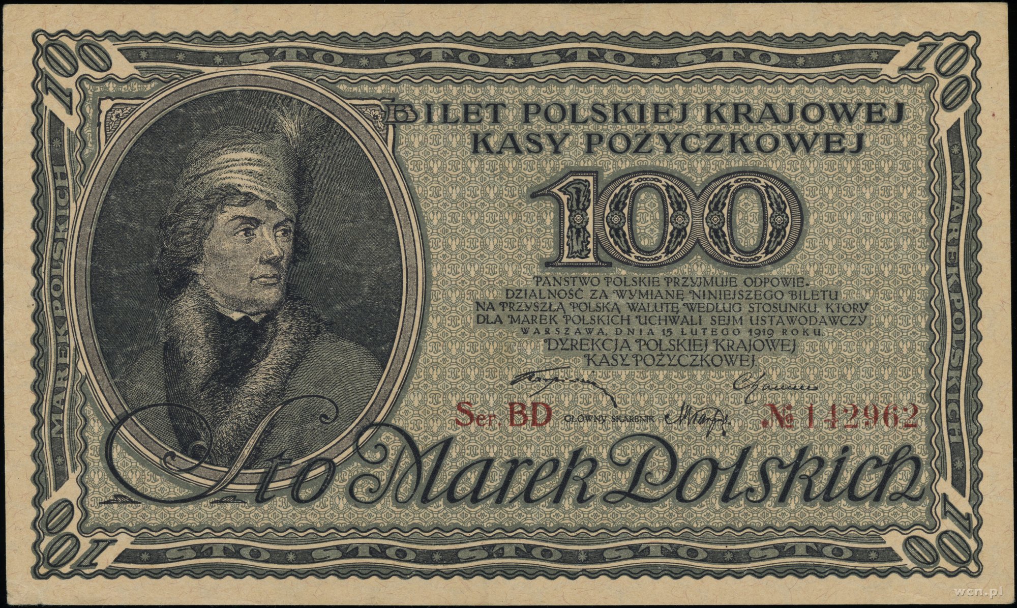| 59 | Polska Krajowa Kasa Pożyczkowa, emisje z 1919 r.. 100 marek polskich, 15.02.1919; seria BD, numeracja 142962; Lucow 318 (R3), Miłczak 18b/c, Pick 17; w opakowaniu fir.. | 0 zł | ||