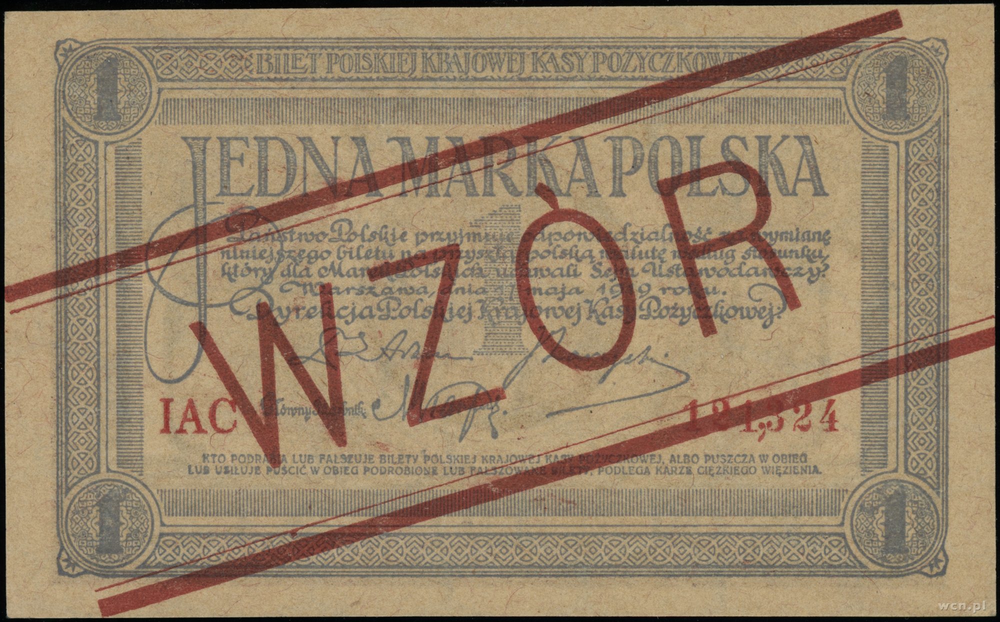 | 60 | Polska Krajowa Kasa Pożyczkowa, emisje z 1919 r.. 1 marka polska, 17.05.1919; seria IAC, numeracja 124,324; wzór biletu; Lucow 323 (R4) - ilustrowany w katalogu kolek.. | 0 zł |
