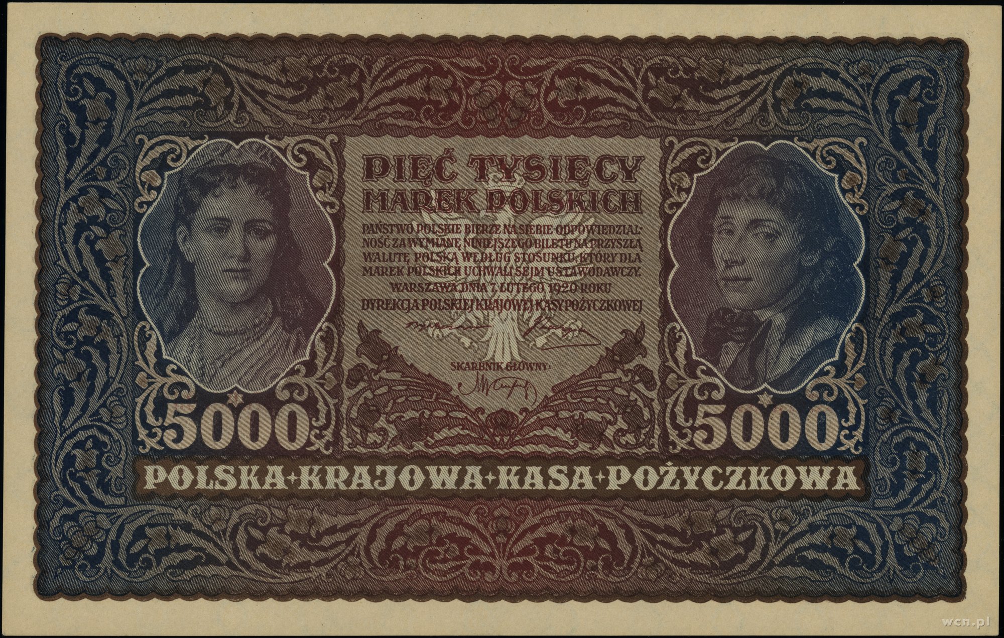 | 81 | Polska Krajowa Kasa Pożyczkowa, emisje z 1920 r.. 5.000 marek polskich, 7.02.1920; seria II AK, numeracja 960,938; Lucow 417 (R2), Miłczak 31b, Pick 31; w opakowaniu .. | 0 zł | ||