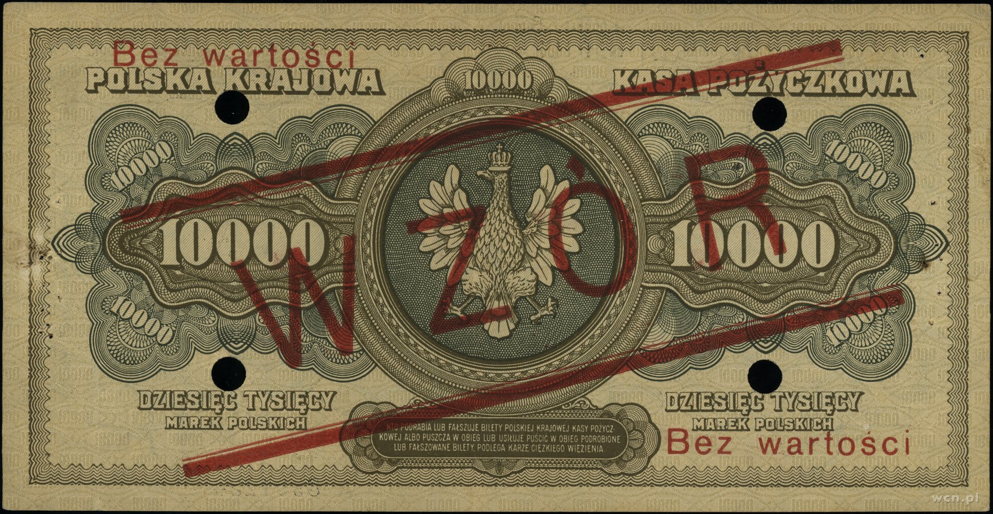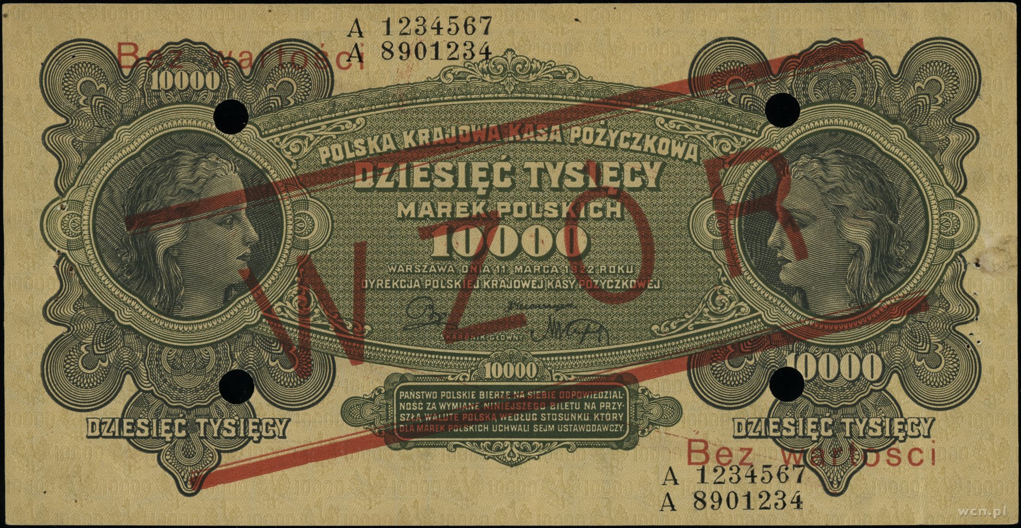 | 82 | Polska Krajowa Kasa Pożyczkowa, emisje z lat 1922-1923. 10.000 marek polskich, 11.03.1922; seria A, numeracja 1234567 / 8901234; wzór biletu (perforowany); Lucow 421 .. | 0 zł | ||