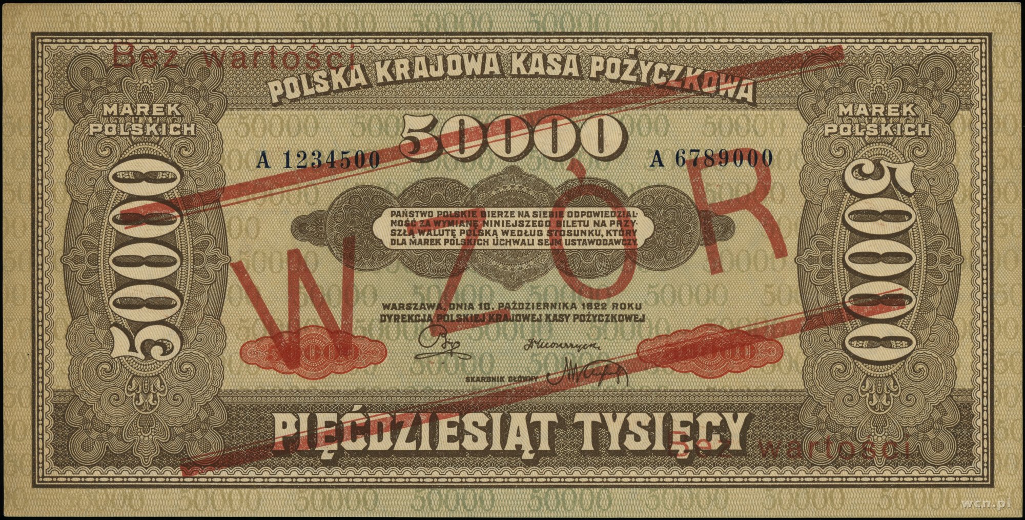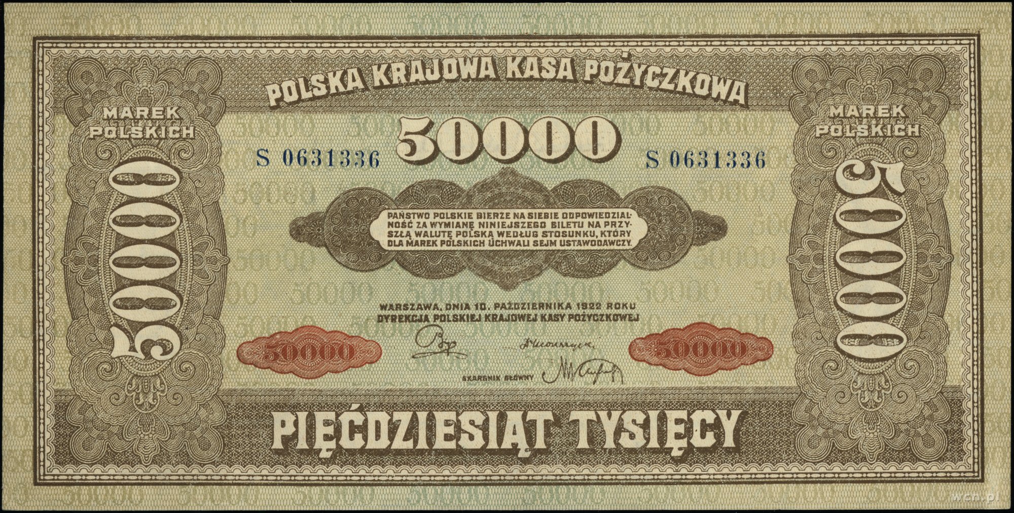 | 83 | Polska Krajowa Kasa Pożyczkowa, emisje z lat 1922-1923. 50.000 marek polskich, 10.10.1922; seria A, numeracja 1234500 / 6789000; wzór biletu; Lucow 423 (R6) - ilustro.. | 0 zł | ||