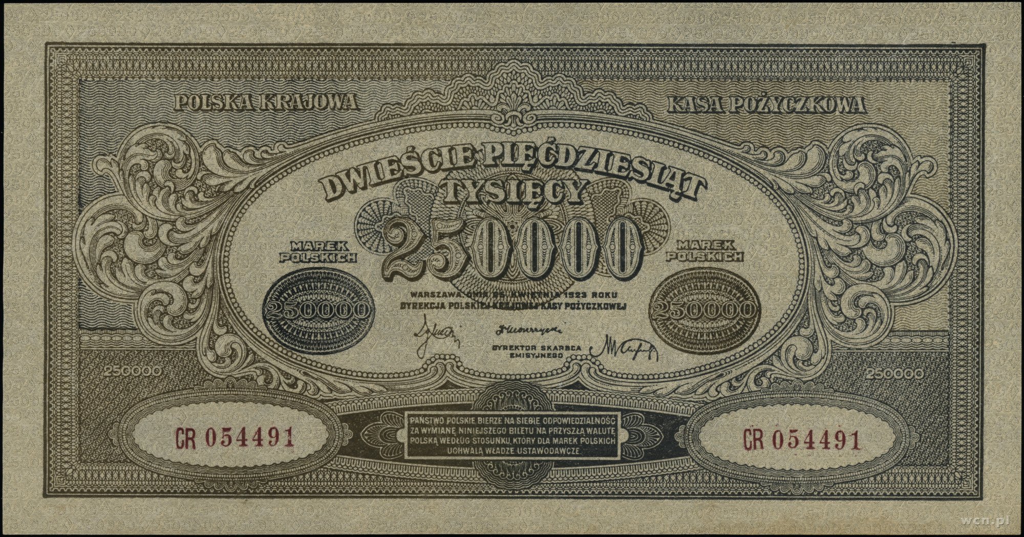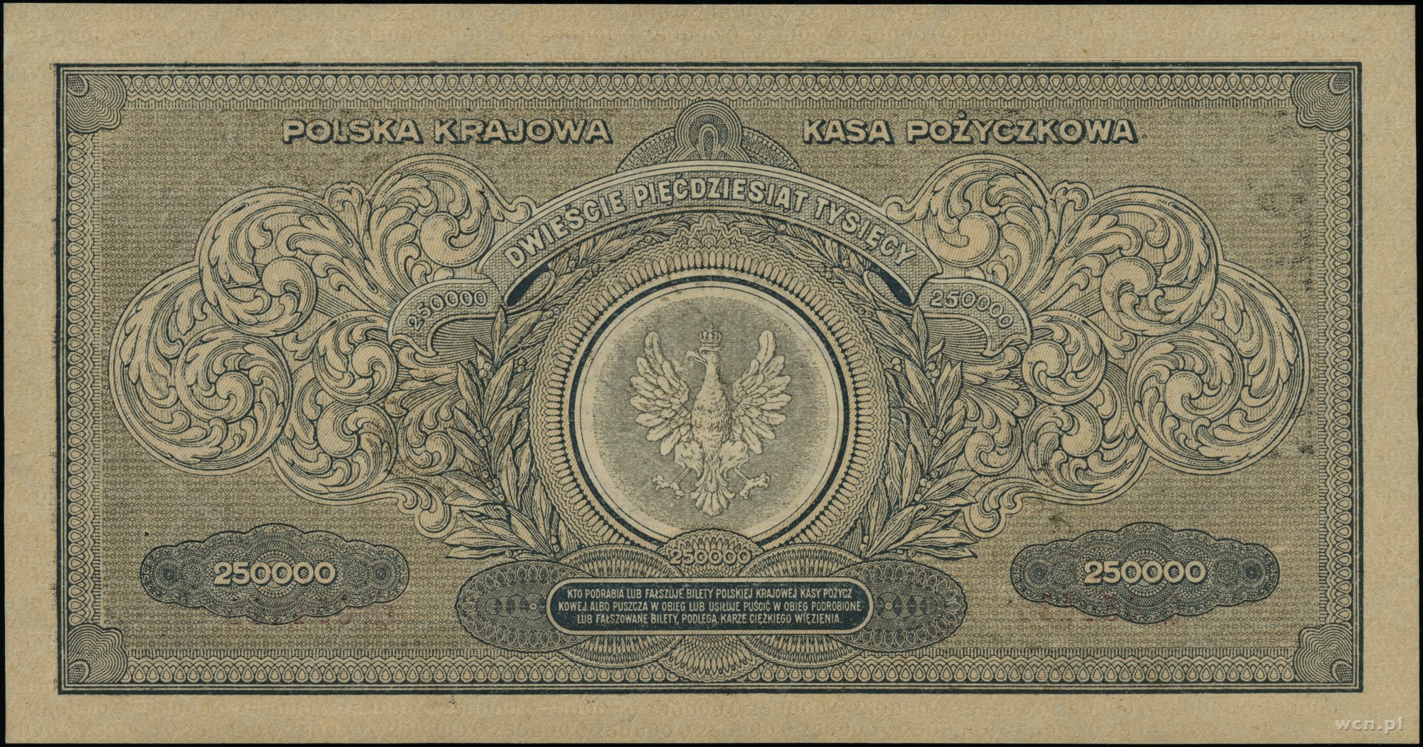 | 85 | Polska Krajowa Kasa Pożyczkowa, emisje z lat 1922-1923. 250.000 marek polskich, 25.03.1923; seria CR, numeracja 054491; Lucow 430 (R4), Miłczak 34c/d, Pick 35; w opak.. | 0 zł | ||