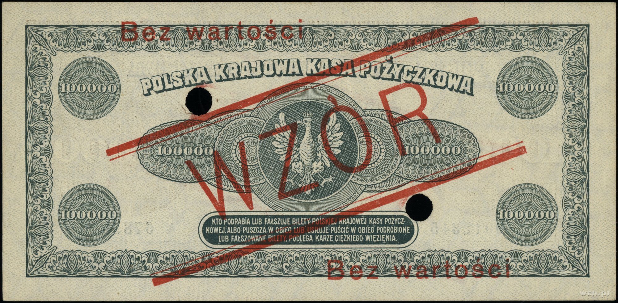 | 86 | Polska Krajowa Kasa Pożyczkowa, emisje z lat 1922-1923. 100.000 marek polskich, 30.08.1923; seria A, numeracja 0012345 / 6789000; wzór biletu (perforowany); Lucow 432.. | 0 zł | ||