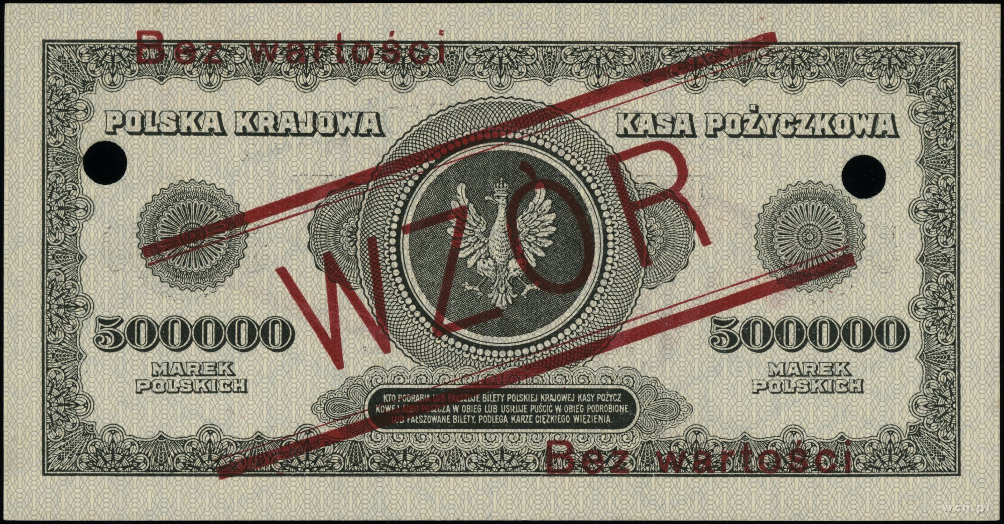 | 87 | Polska Krajowa Kasa Pożyczkowa, emisje z lat 1922-1923. 500.000 marek polskich, 30.08.1923; seria G, numeracja 1234567 / 8901234; wzór biletu (perforowany); Lucow 436.. | 0 zł | ||
