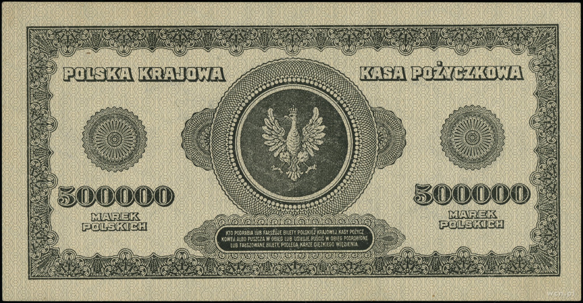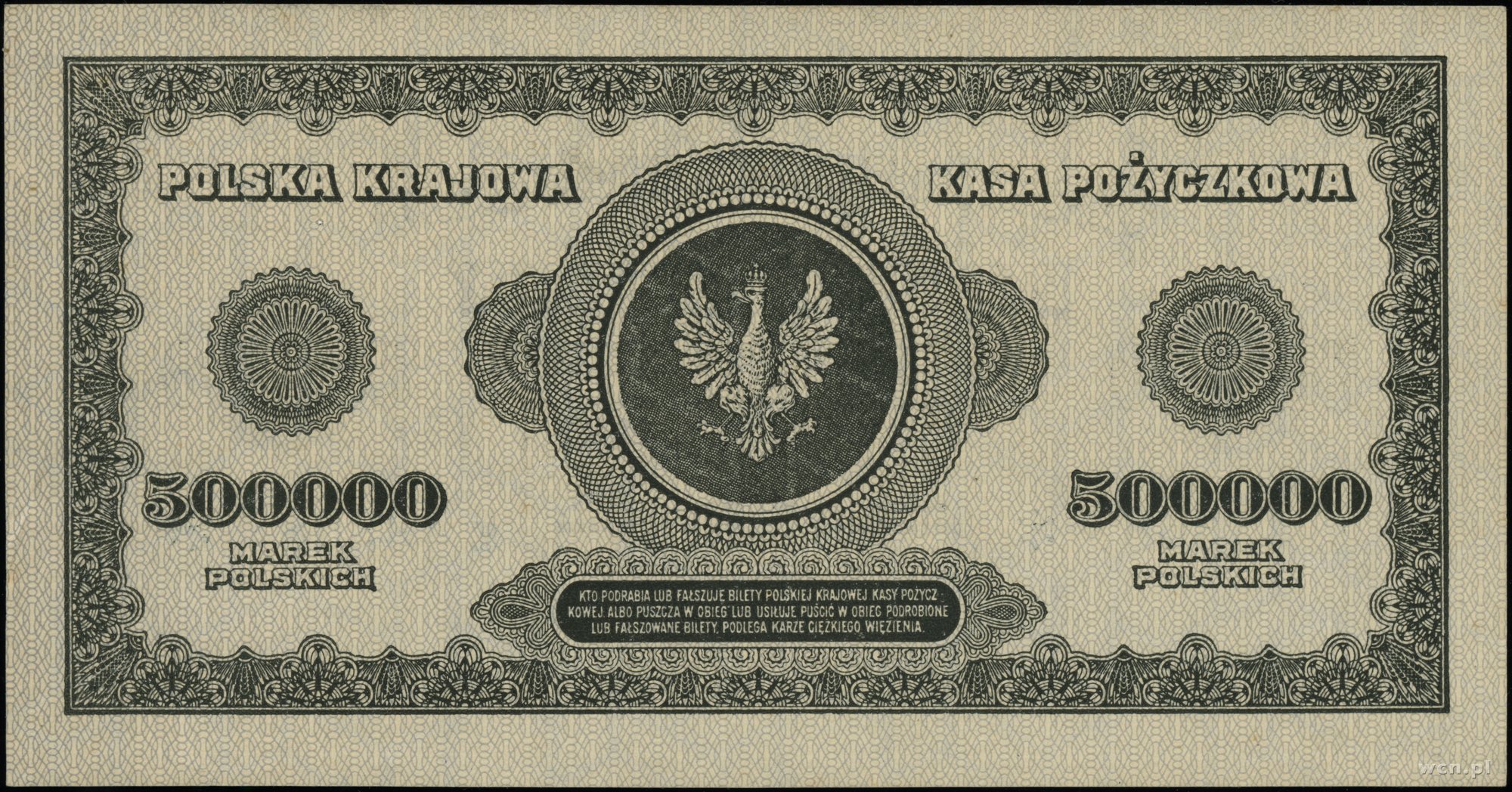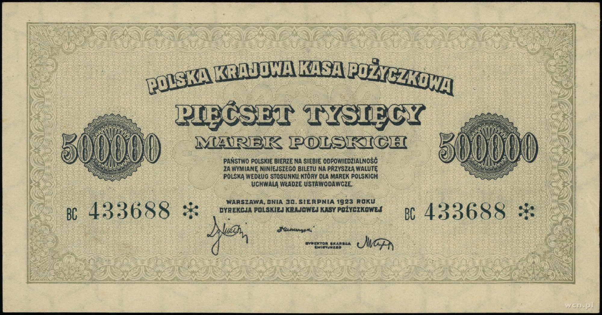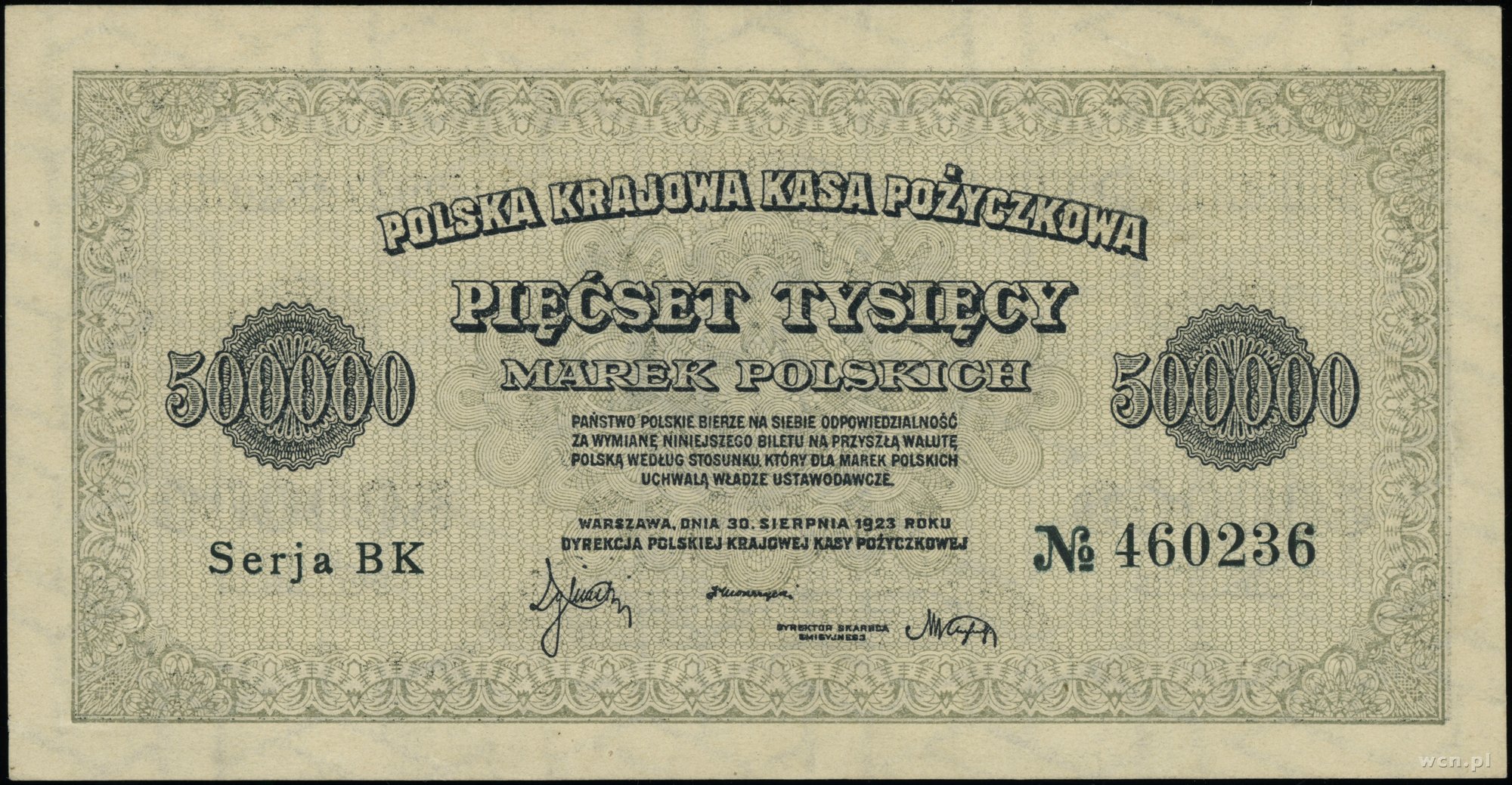 | 90 | Polska Krajowa Kasa Pożyczkowa, emisje z lat 1922-1923. 500.000 marek polskich, 30.08.1923; seria BK, numeracja 460236; Lucow 449 (R4), Miłczak 36k/l/m, Pick 36; w op.. | 0 zł | ||