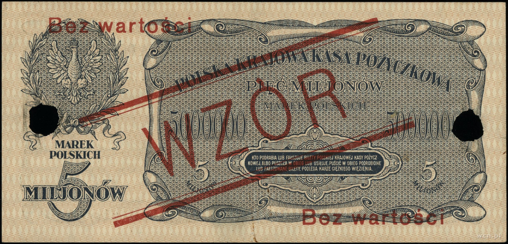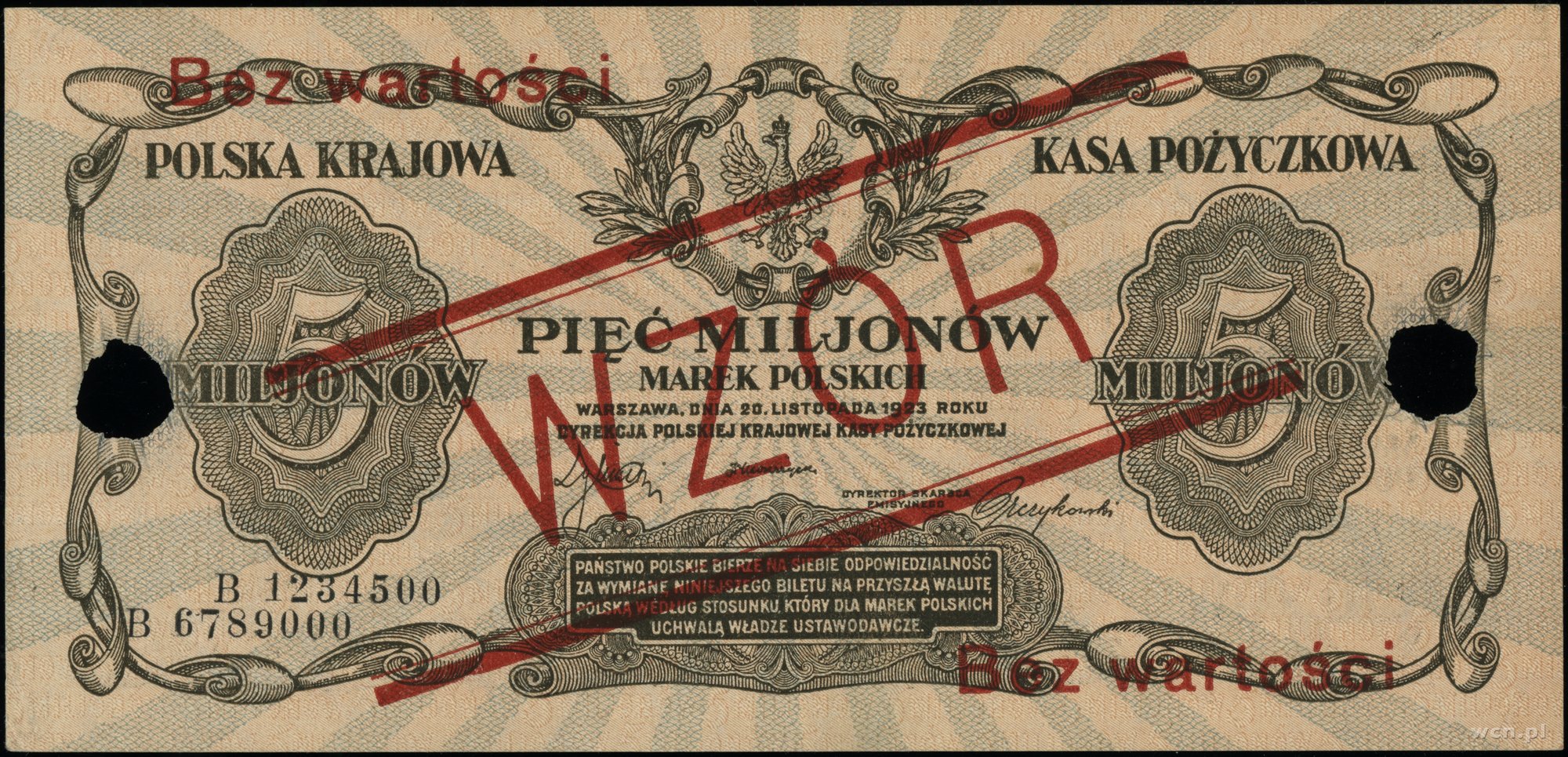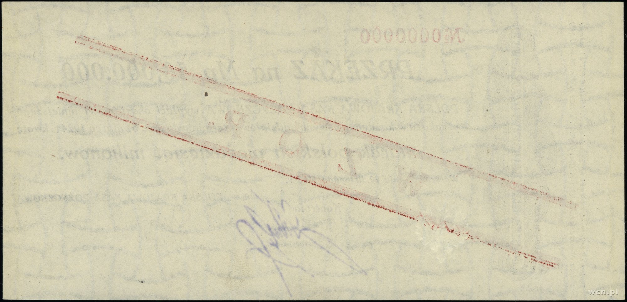 | 93 | Polska Krajowa Kasa Pożyczkowa, emisje z lat 1922-1923. 50.000.000 marek polskich, 20.11.1923; seria brak, numeracja 0000000; wzór przekazu w podpisem kontrolera; Luc.. | 0 zł | ||