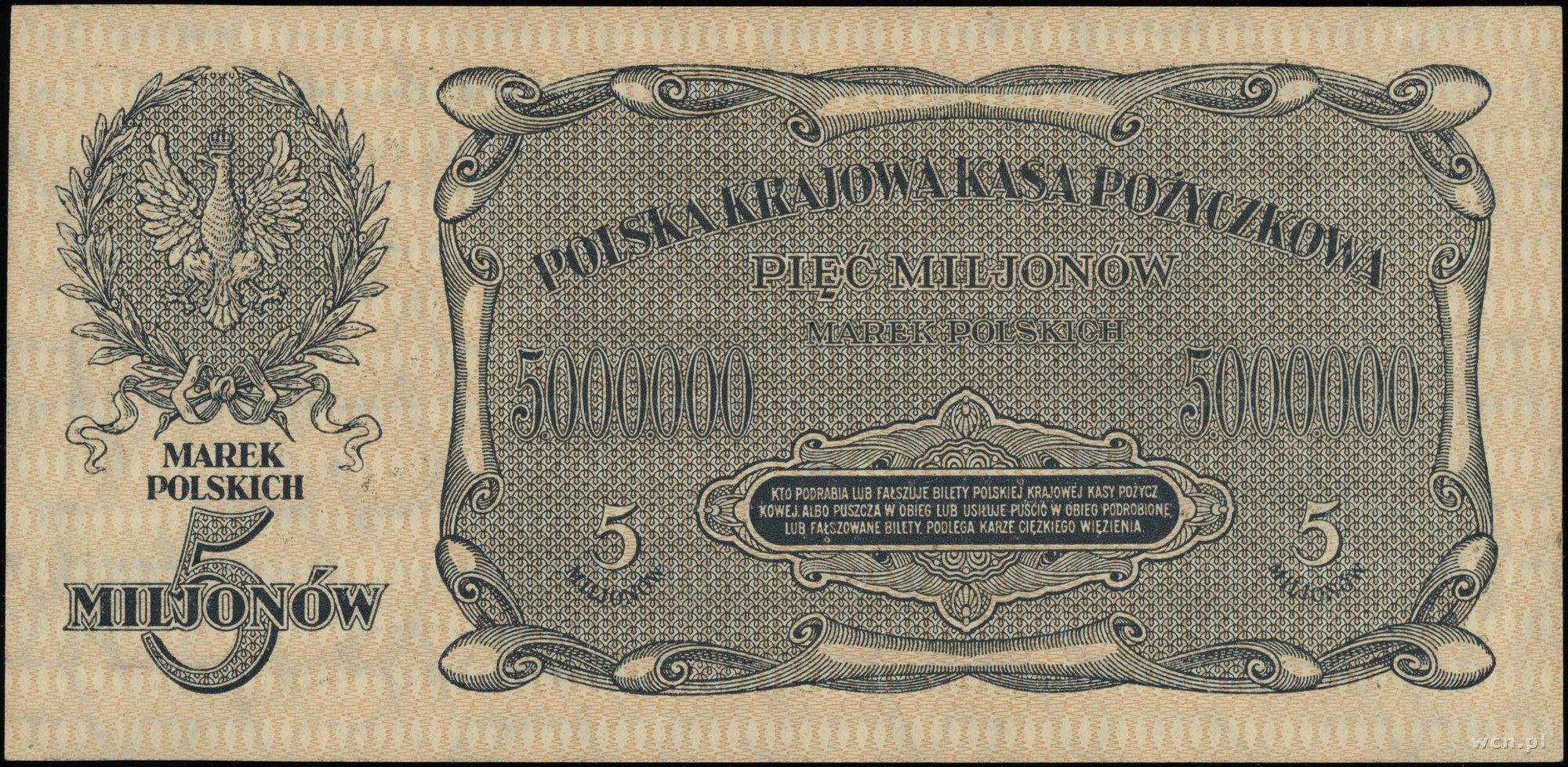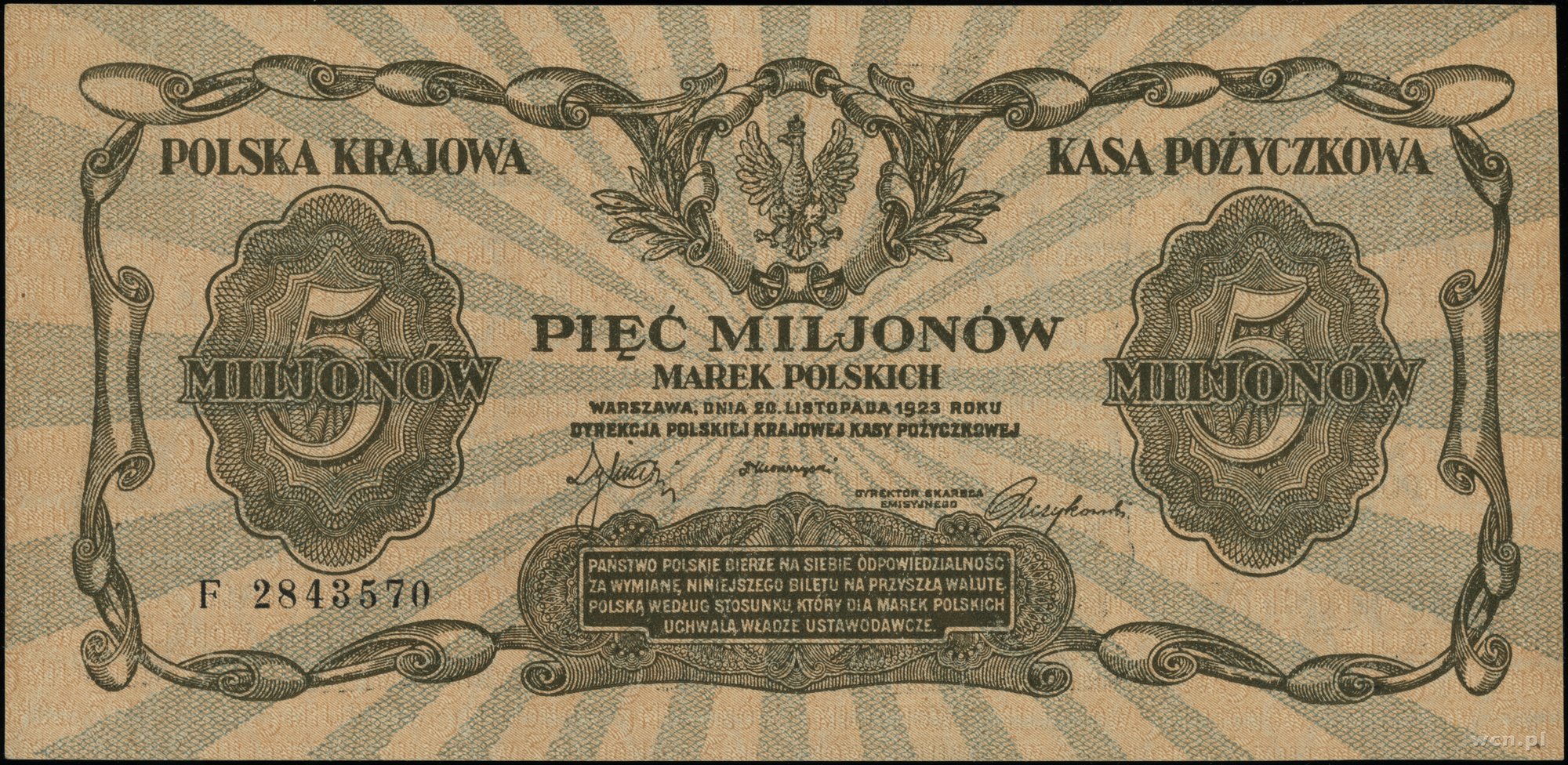 | 92 | Polska Krajowa Kasa Pożyczkowa, emisje z lat 1922-1923. 5.000.000 marek polskich, 20.11.1923; seria F, numeracja 2843570; Lucow 456 (R5), Miłczak 38, Pick 38; w opako.. | 0 zł | ||