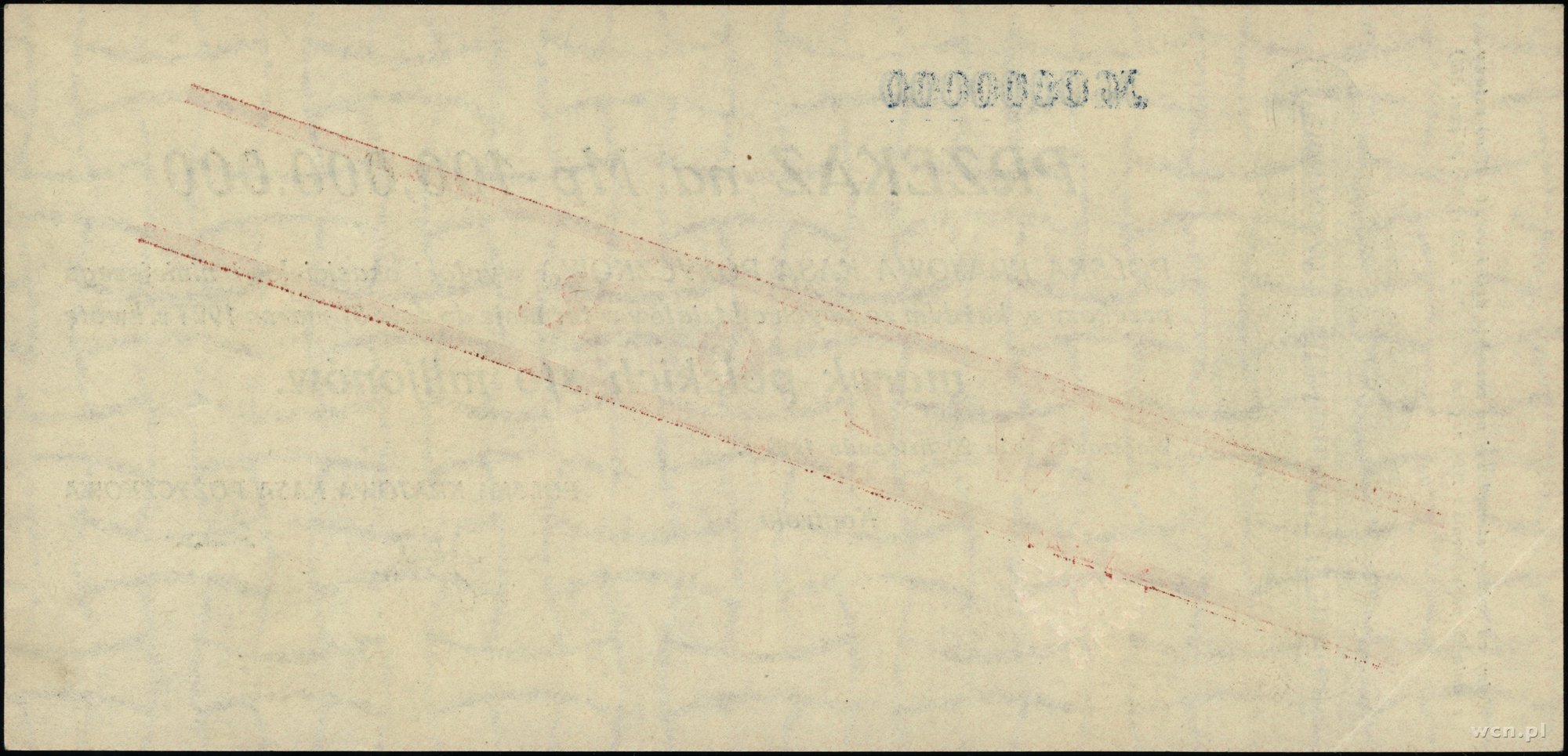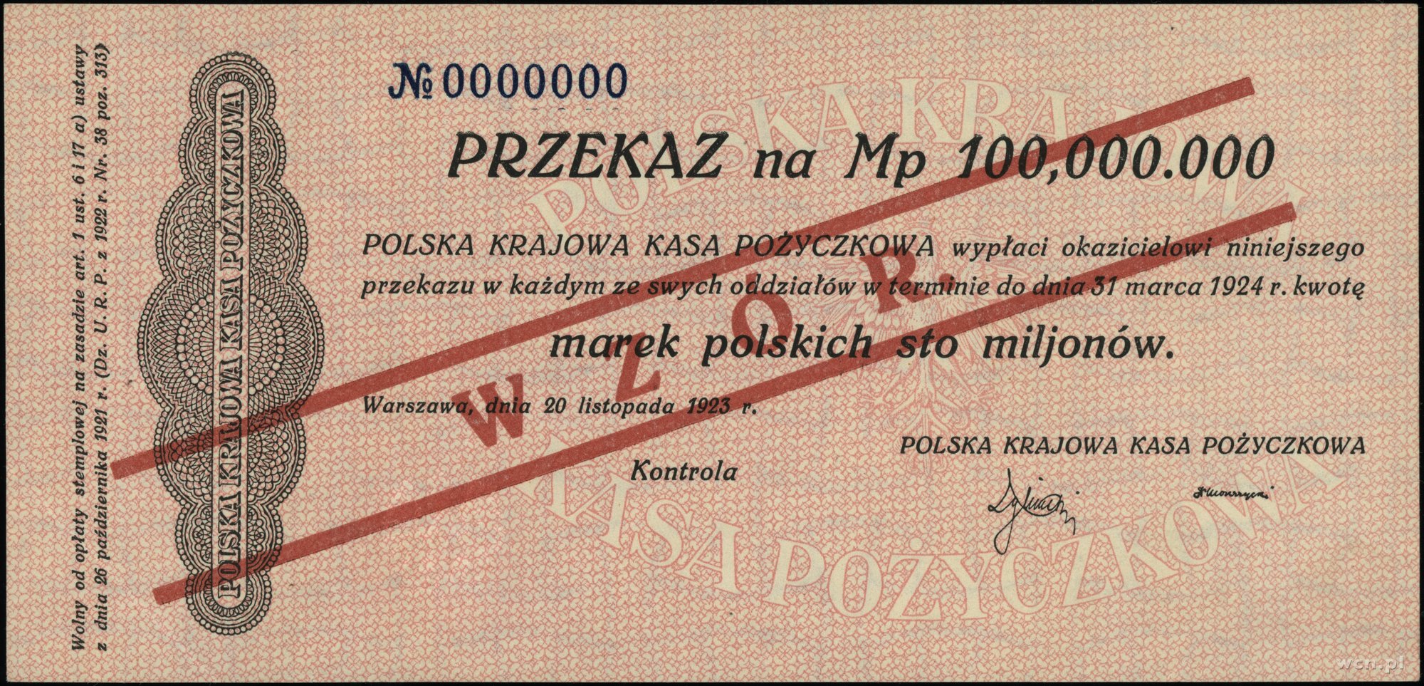 | 94 | Polska Krajowa Kasa Pożyczkowa, emisje z lat 1922-1923. 100.000.000 marek polskich, 20.11.1923; seria brak, numeracja 0000000; wzór przekazu; Lucow 467 (R7) - ilustro.. | 0 zł | ||