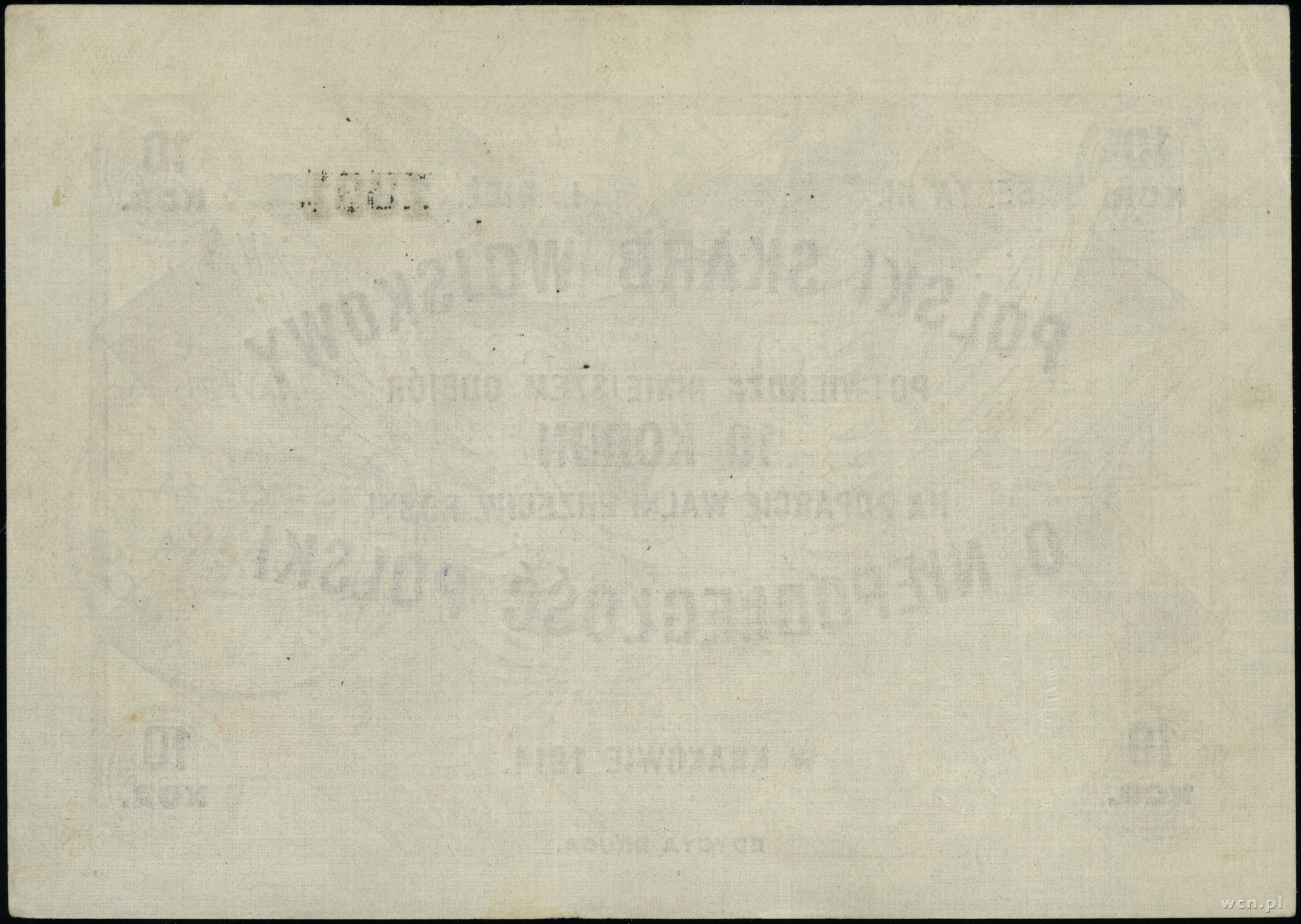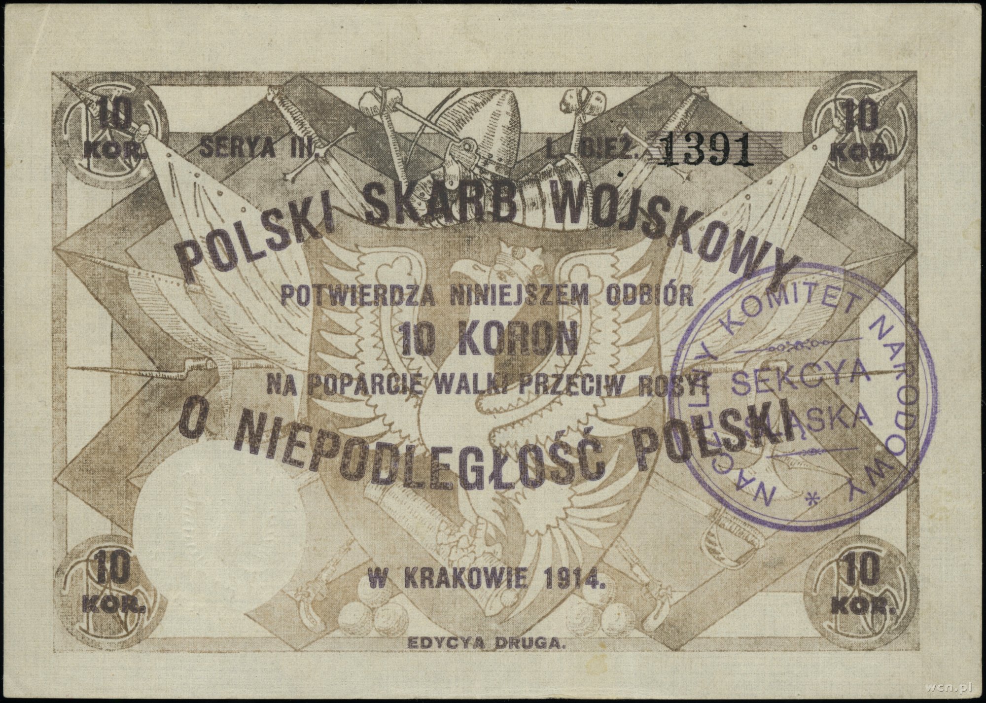 | 95 | Dokumenty, asygnaty, bony i pokwitowania wydane na cele patriotyczne w latach 1914-1924. bon 10 koron, 1914; seria III., numeracja 1391; Polski Skarb Wojskowy, II edy.. | 0 zł | ||